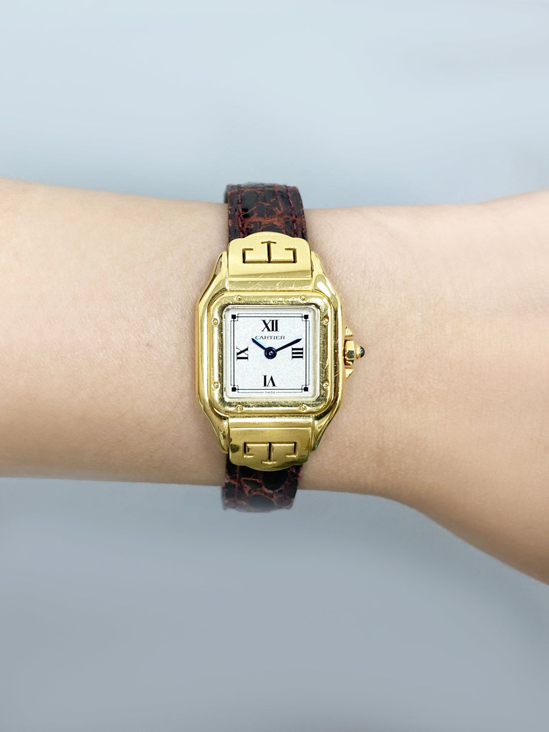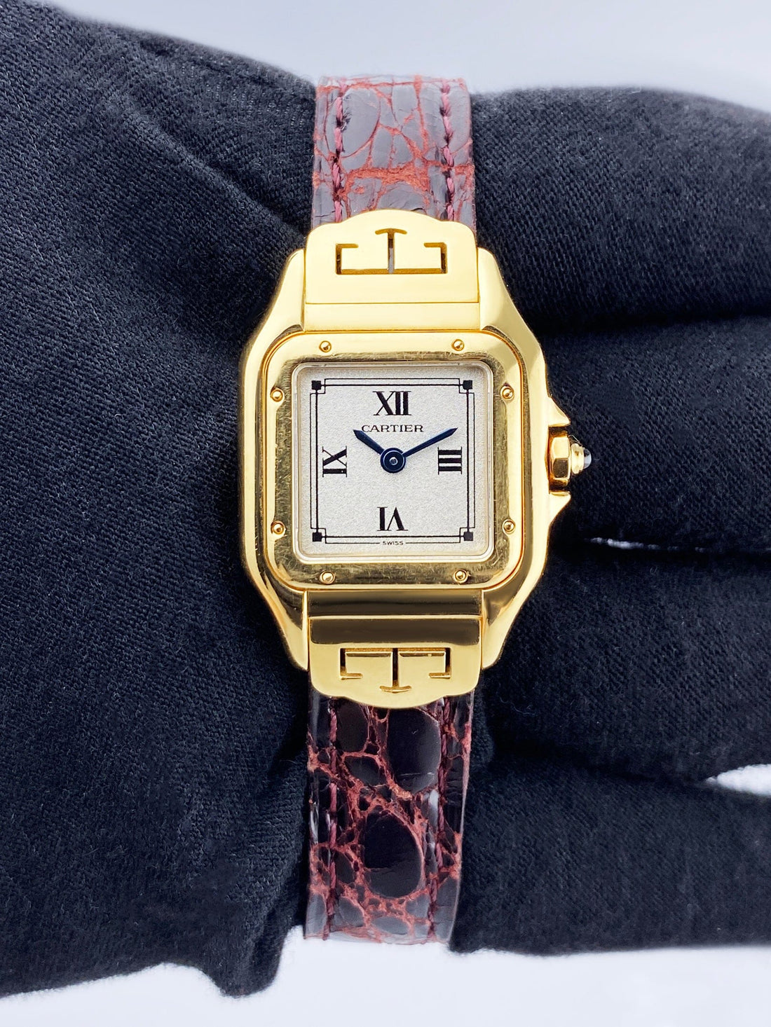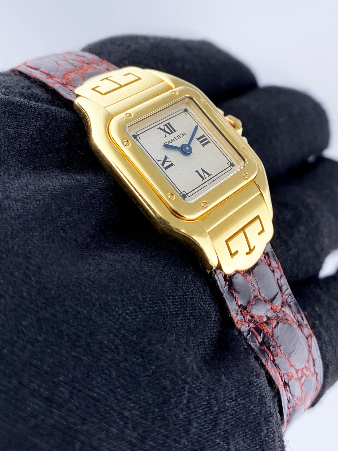 Cartier Panthere Les Styles W2504431 / 1070 Ladies Watch. 22mm 18K yellow gold case. 18K yellow gold smooth bezel. Gray dial with blue steel hands and Roman numeral hour markers. Black leather strap with deployment clasp. Will fit up to a 6-inch wrist. Sapphire crystal. 18K yellow gold case back. Quartz: battery powered movement.