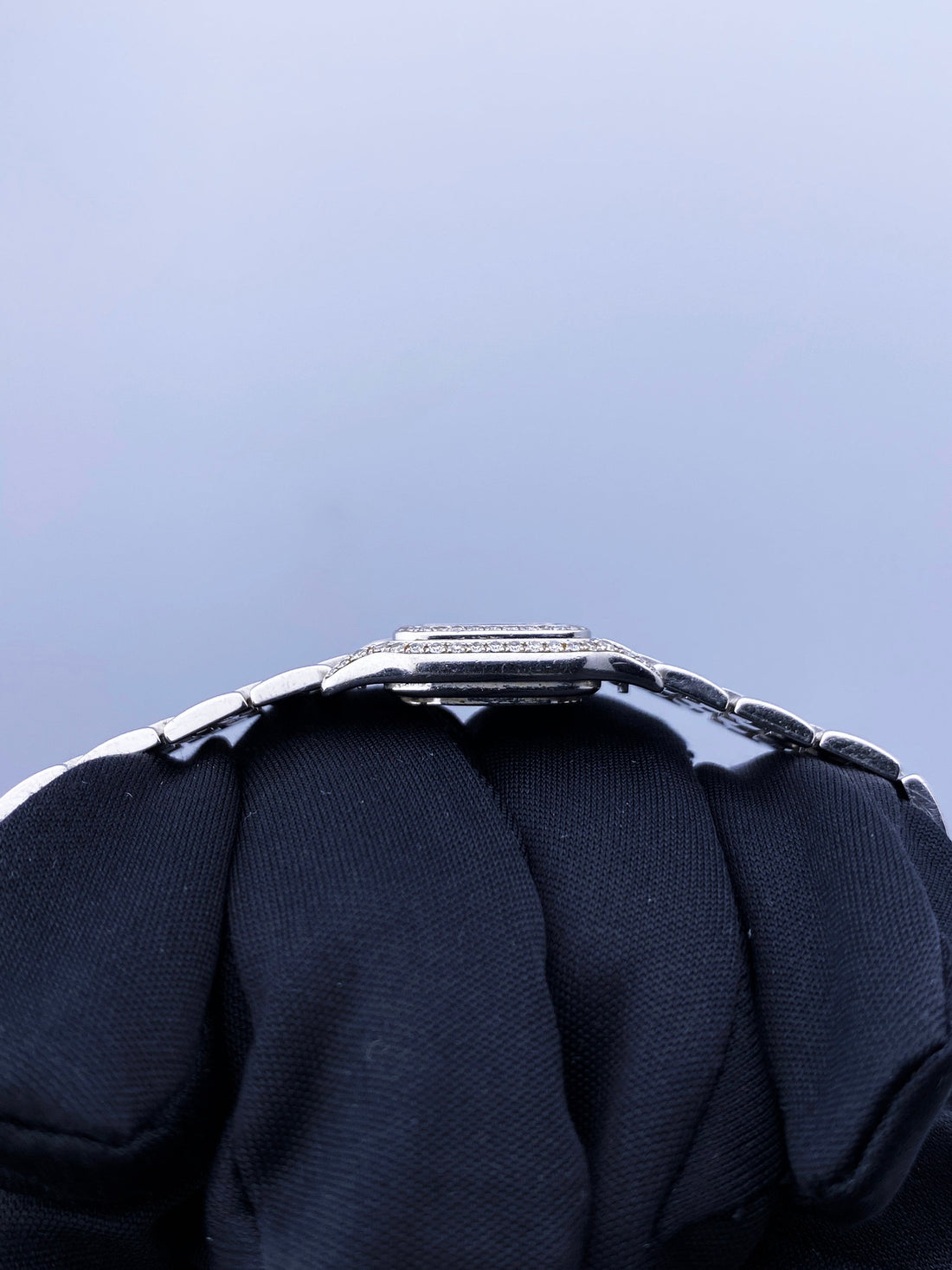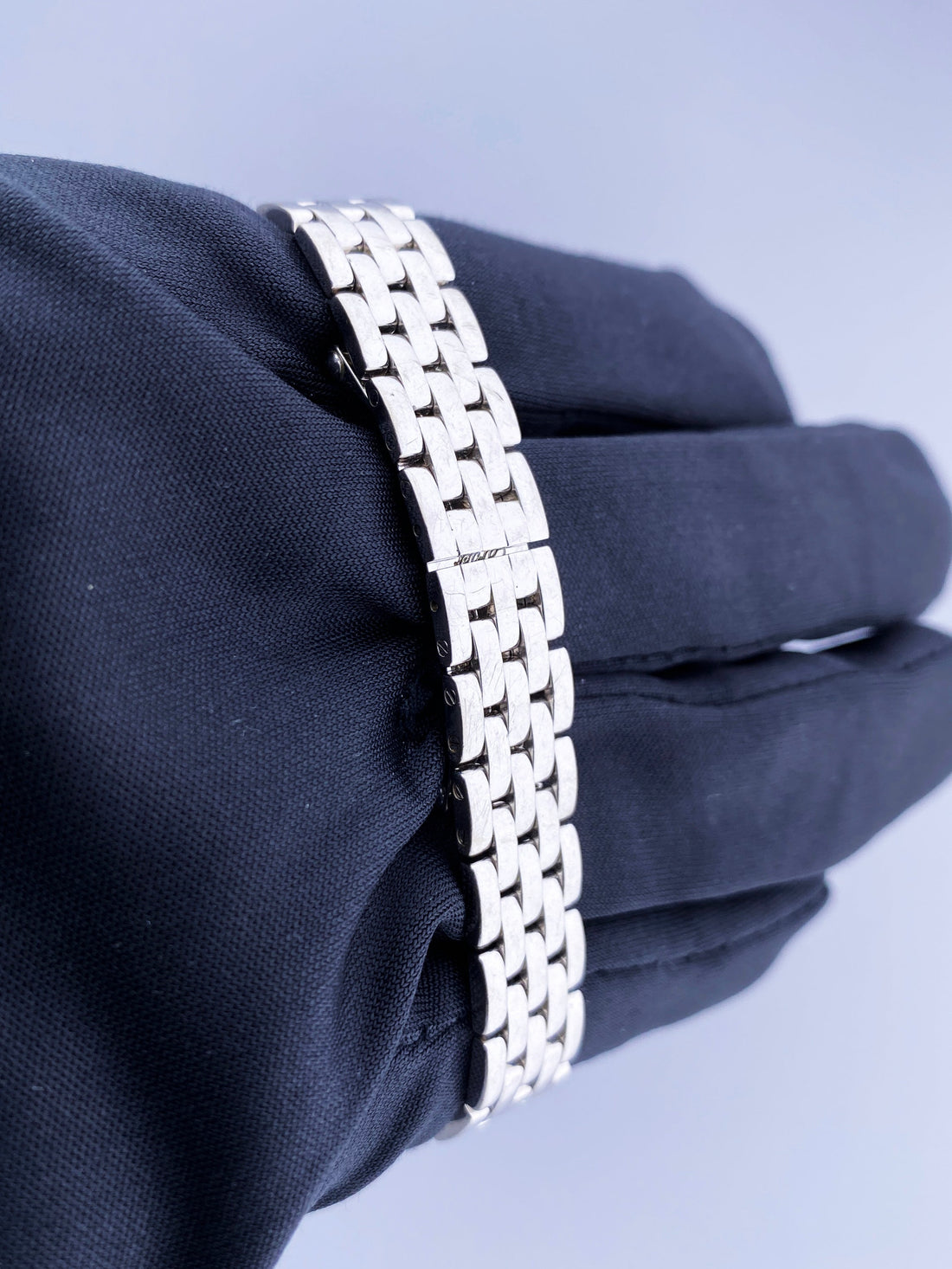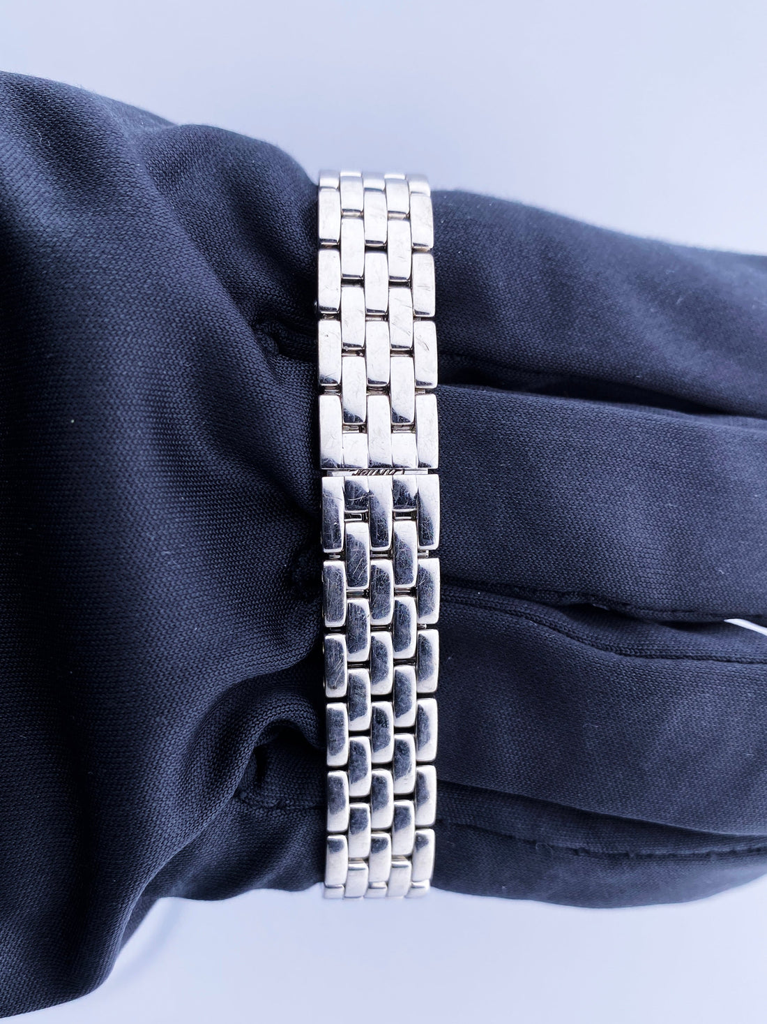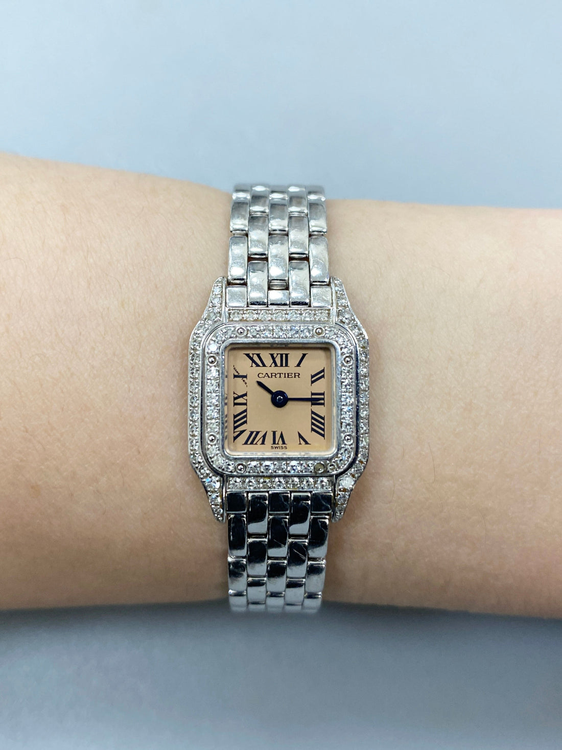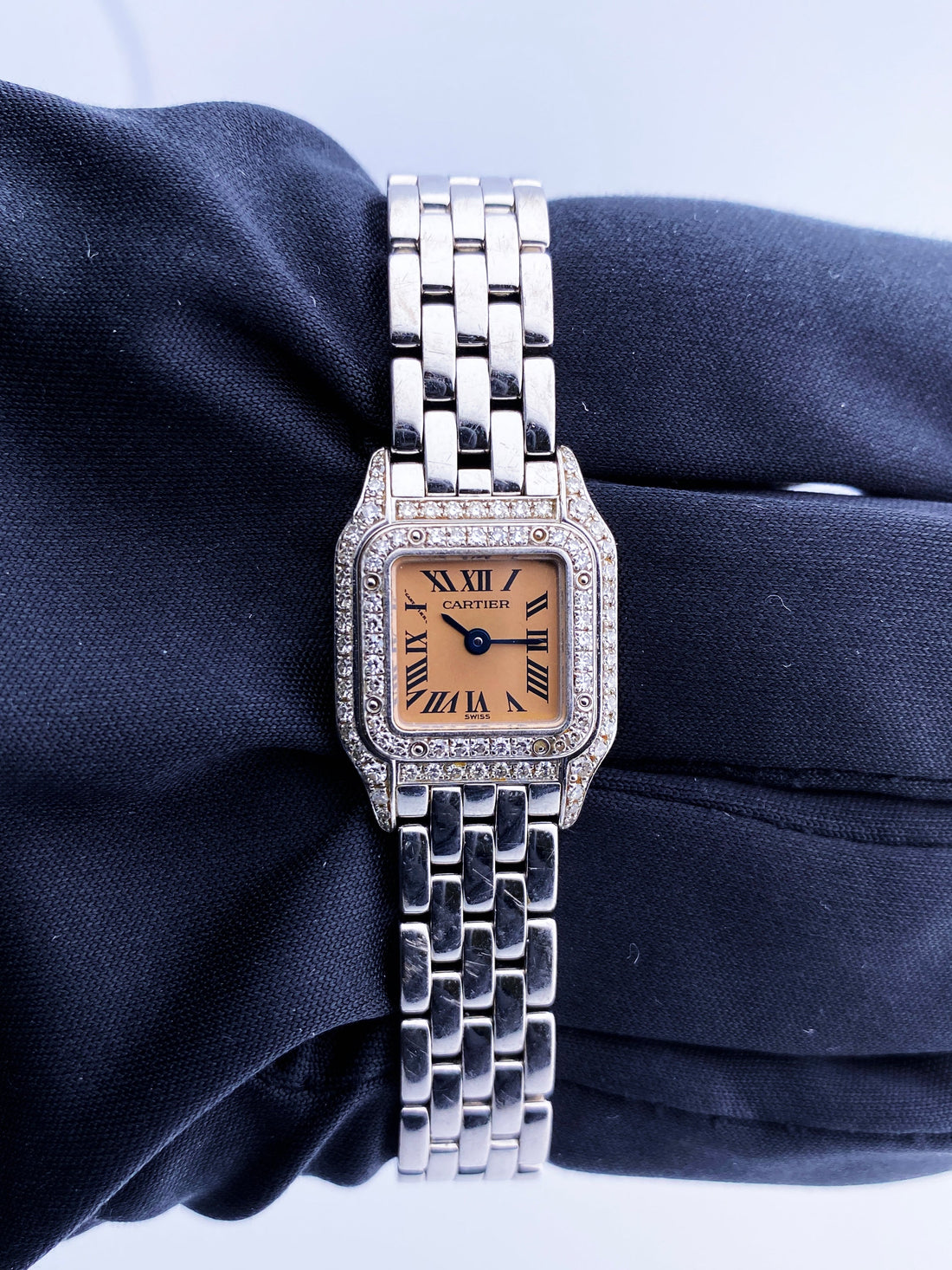 Cartier Panthere 2363 Mini Ladies Watch. 17mm 18K white gold & original factory diamond set case with 18K white gold & original factory diamond set bezel. Salmon dial with blue hands and black Roman numeral hour marker. 18K white gold bracelet with 18K white gold hidden butterfly clasp. Will fit up to 5.75-Inch wrist. Sapphire crystal. 18K white gold case back. Quartz battery powered movement. This watch comes with original Box & Papers.