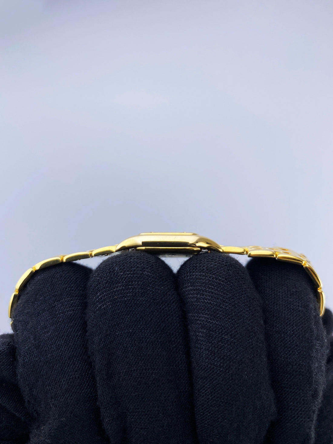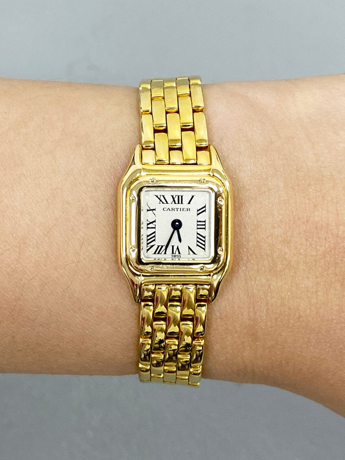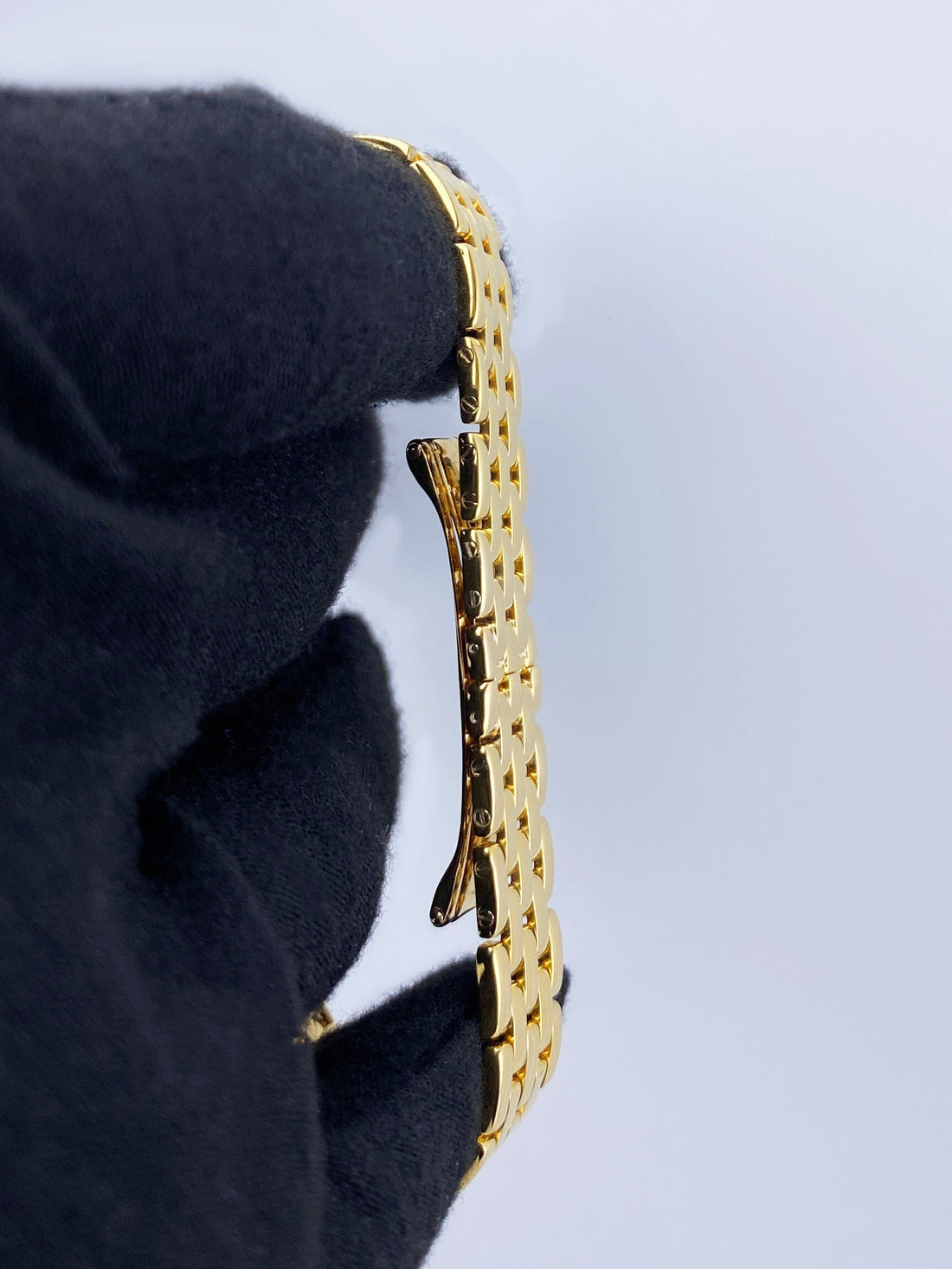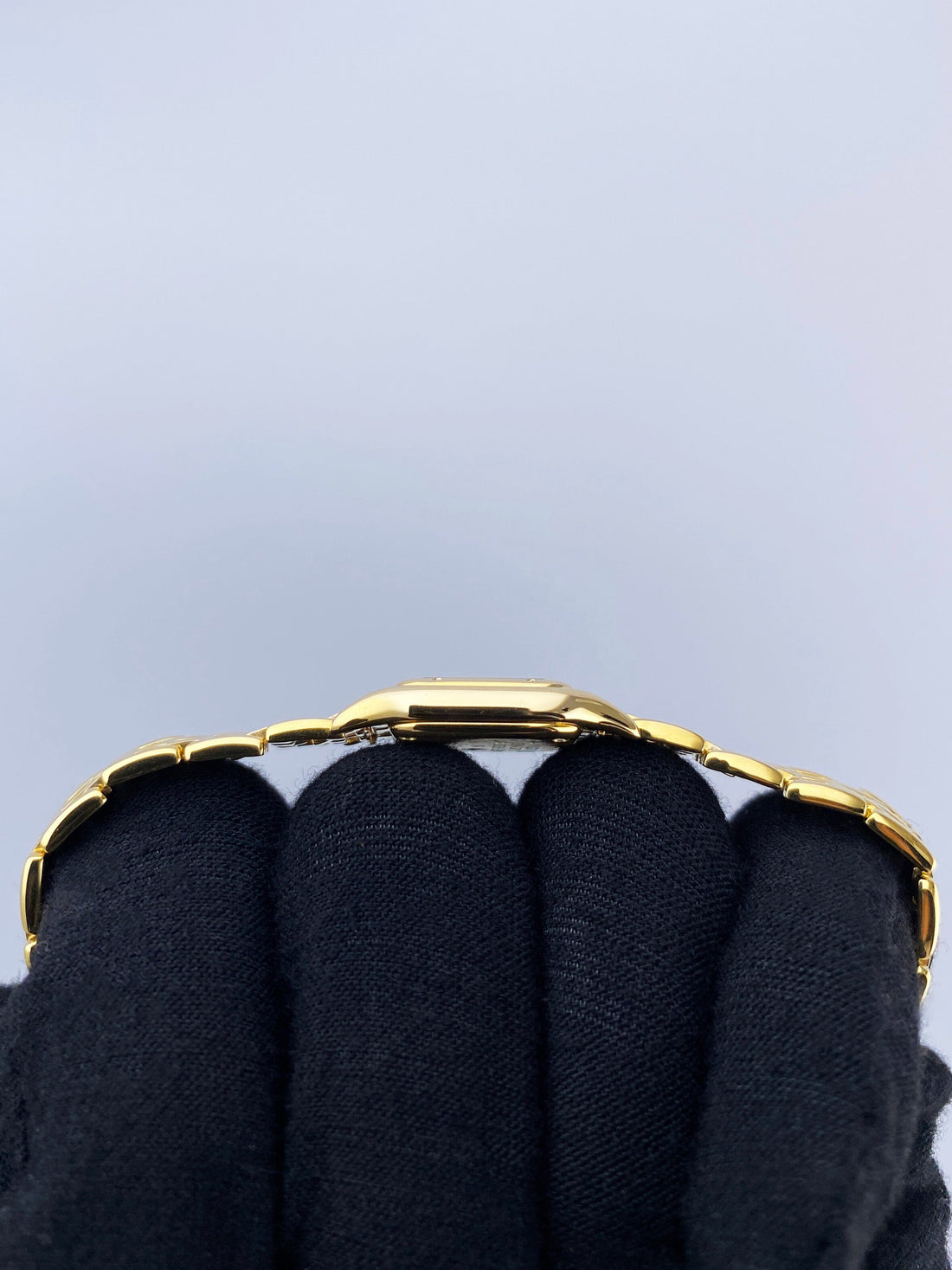 Cartier Panthere W25034B9 / 2363 Mini Ladies Watch. 17mm 18K yellow gold case. 18K yellow gold bezel. Off-White dial with blue hands and black Roman numeral hour marker. 18K yellow gold bracelet with 18K white gold hidden butterfly clasp. Will fit up to 6.25-Inch wrist. Sapphire crystal. 18K yellow gold case back. Quartz battery powered movement.