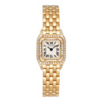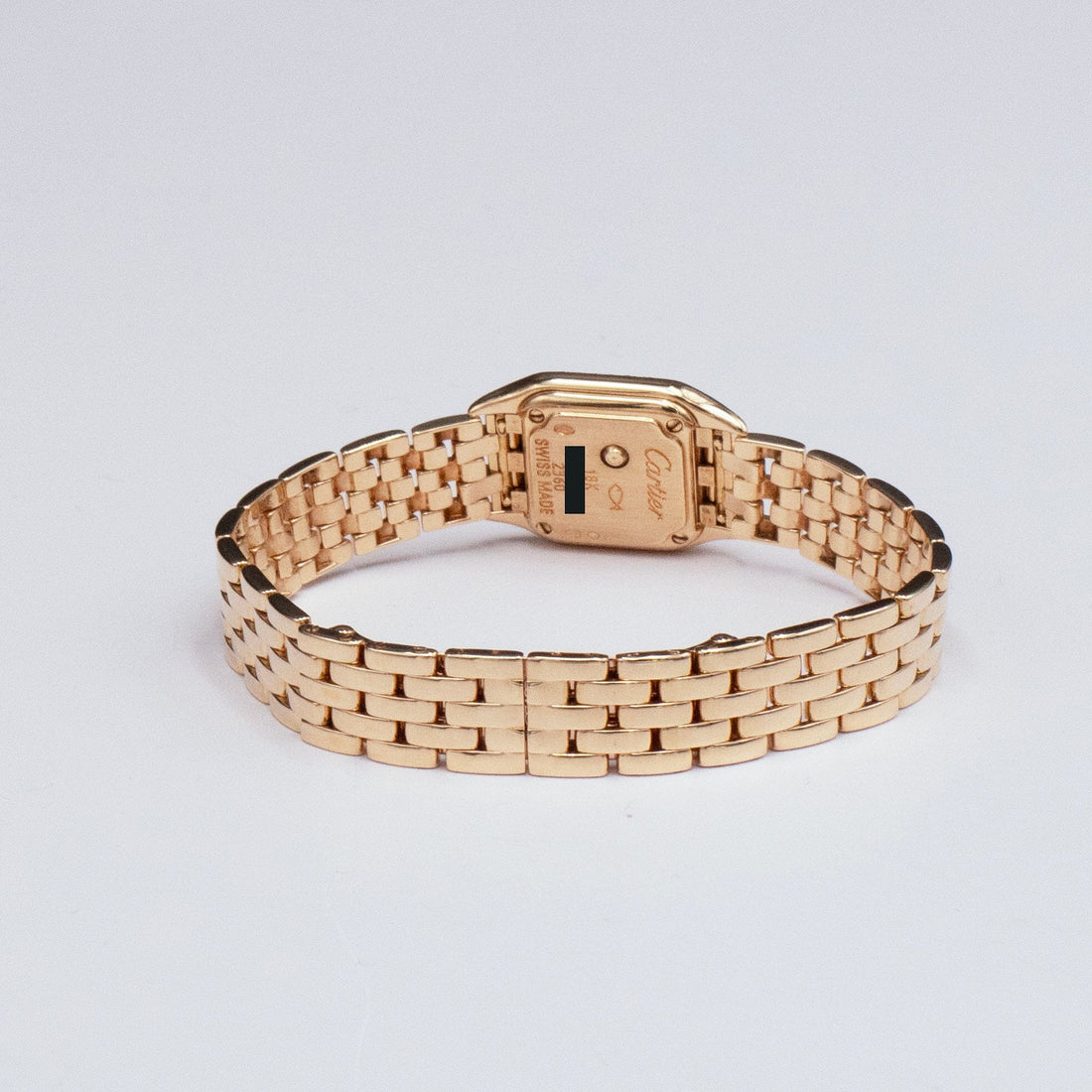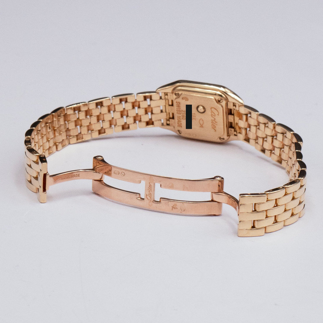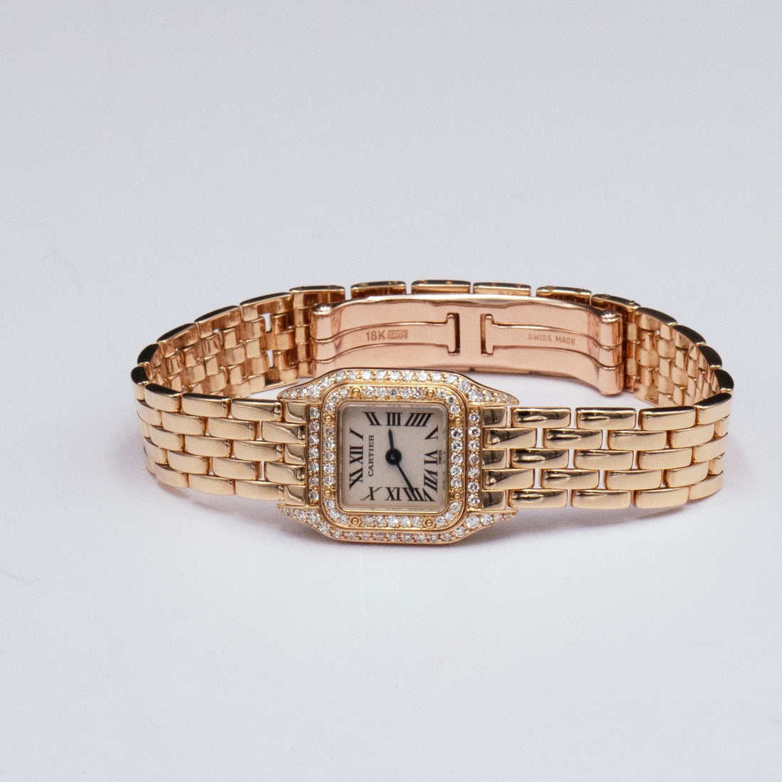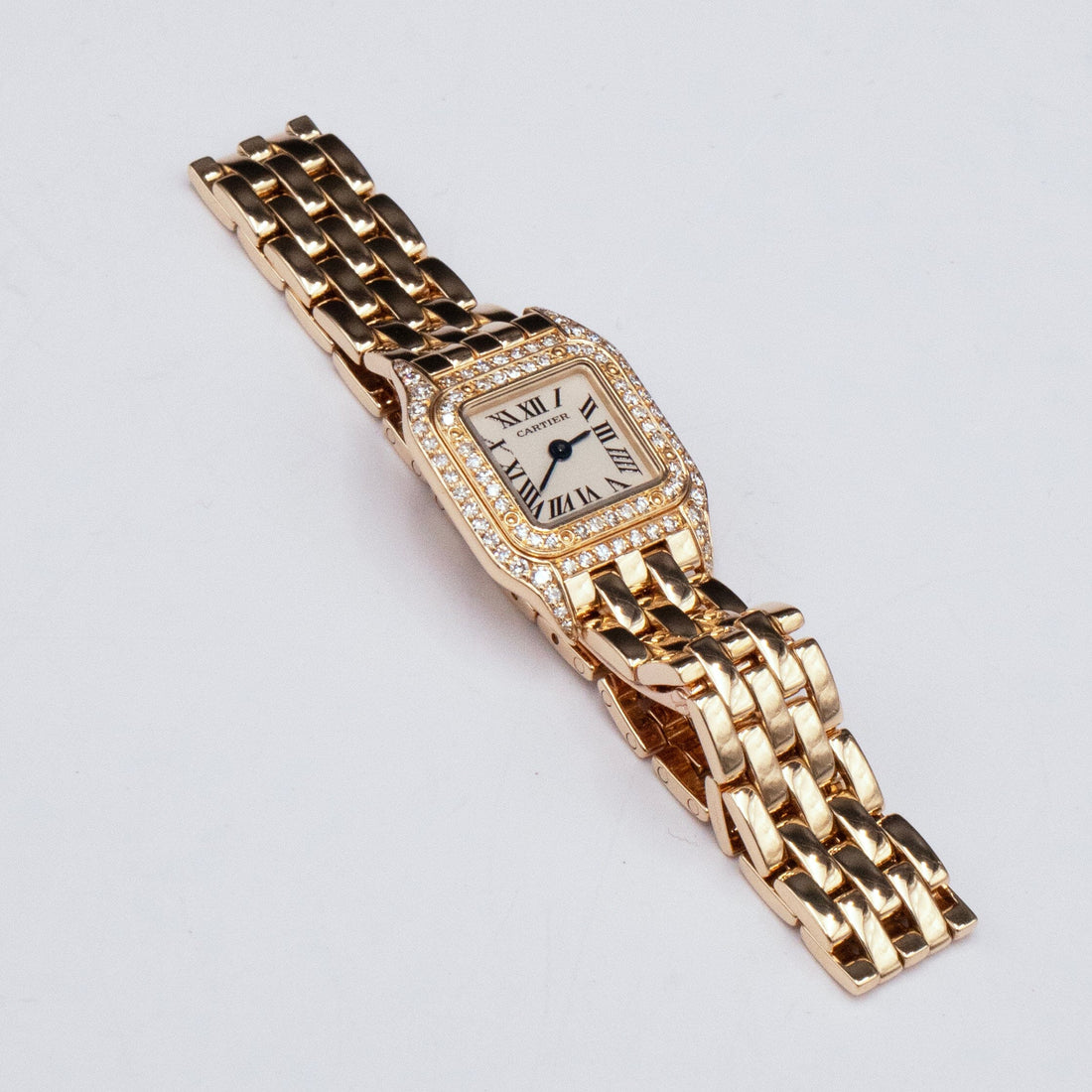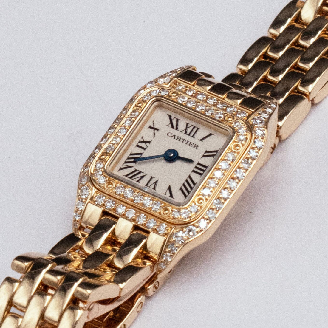 Cartier Panthere W25034B9 / 2360 Ladies Watch. 17mm 18K yellow gold and original factory diamond set case. 18K yellow gold and original factory diamond set bezel and original factory diamond set. Off-White dial with Blue steel hands and Roman numeral hour markers. 18K yellow gold bracelet with hidden butterfly clasp. Will fit up to a 6-inch wrist. Sapphire crystal. 18K yellow gold case back. Quartz: Battery movement.