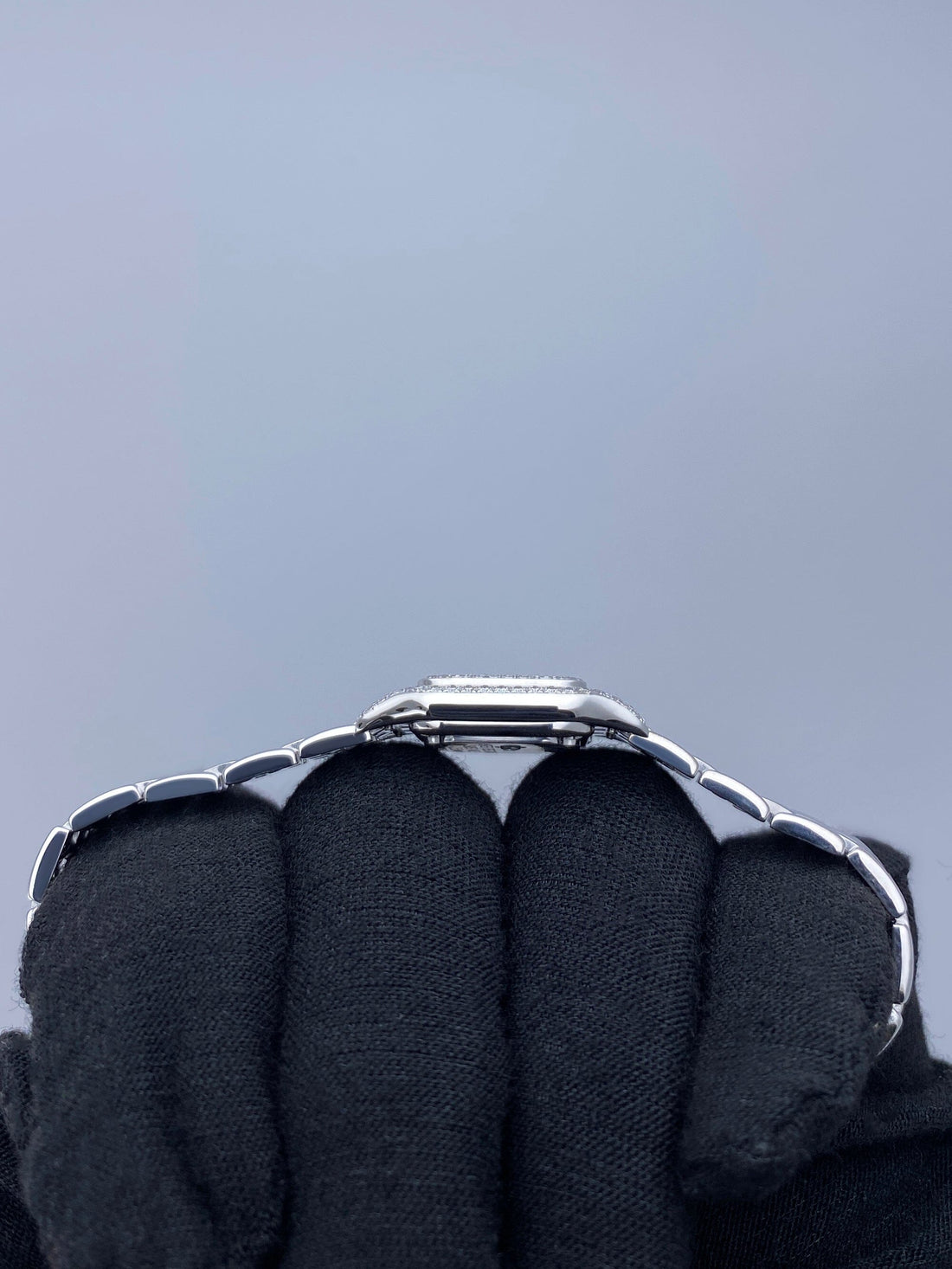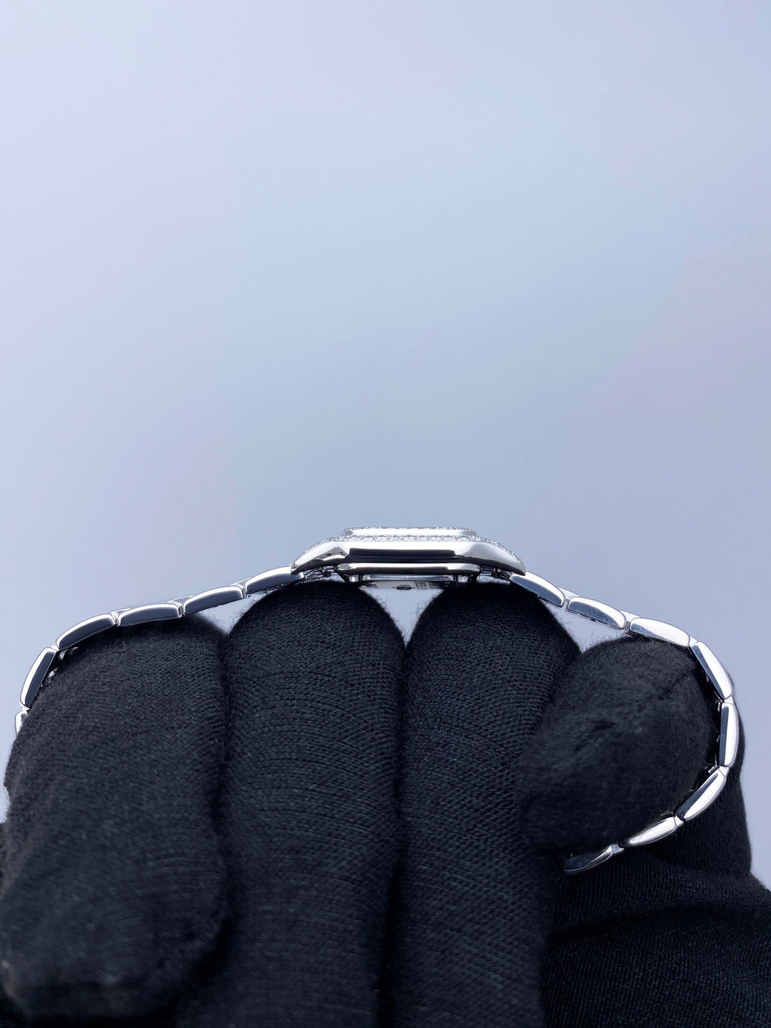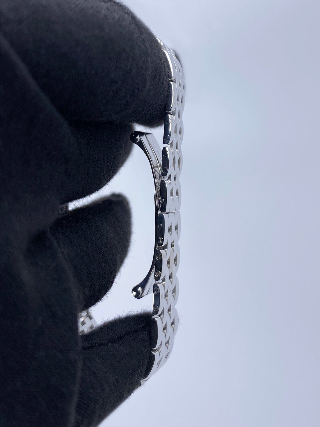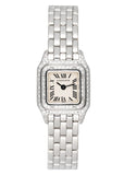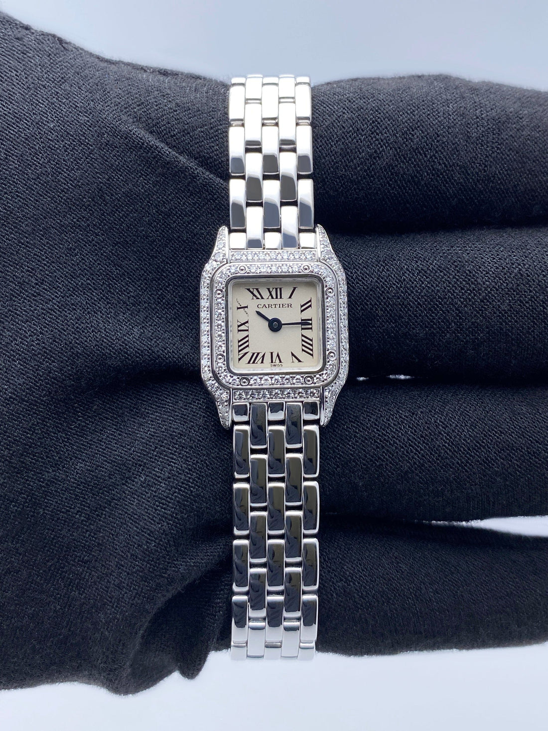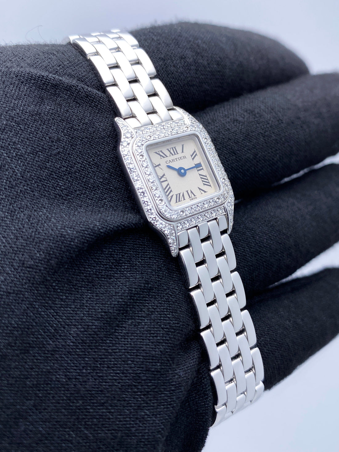 Cartier Panthere WF3210F3 / 2363 Mini Ladies Watch. 17mm 18K white gold & original factory diamond set case. 18K white gold bezel with original factory diamond set. Off-White dial with blue hands and black Roman numeral hour marker. 18K white gold bracelet with 18K white gold hidden butterfly clasp. Will fit up to 5.5-Inch wrist. Sapphire crystal. 18K white gold case back. Quartz battery powered movement.