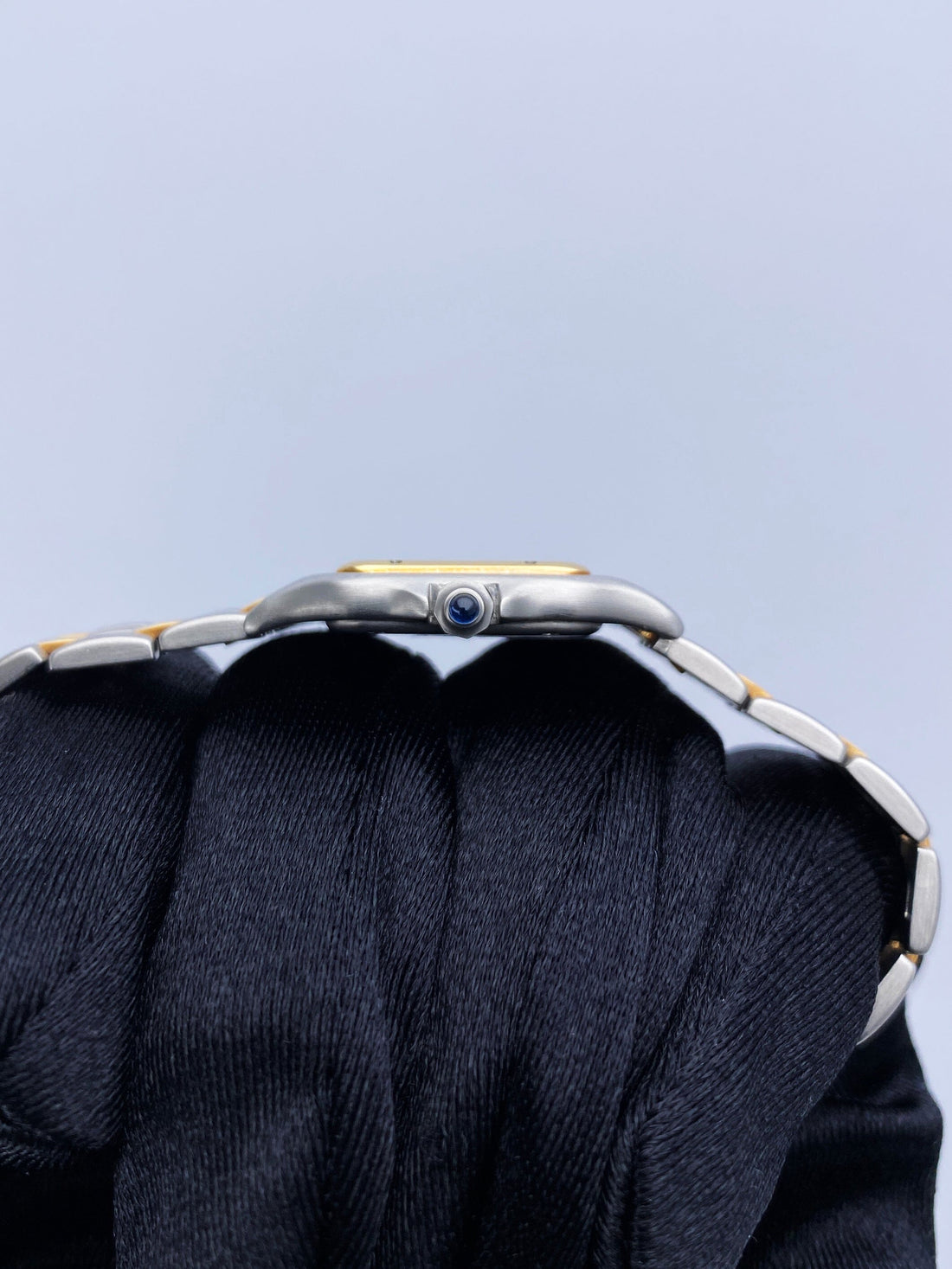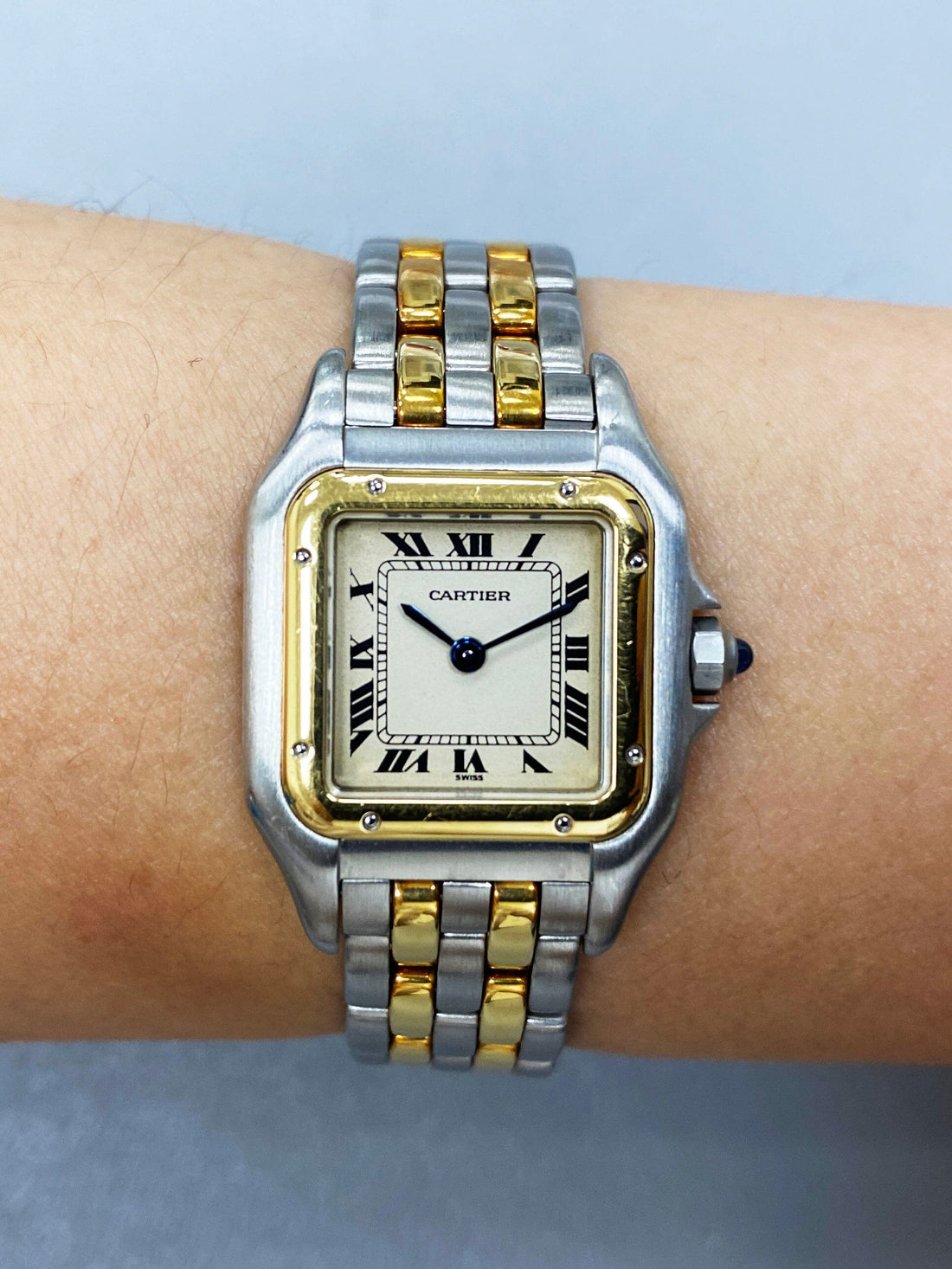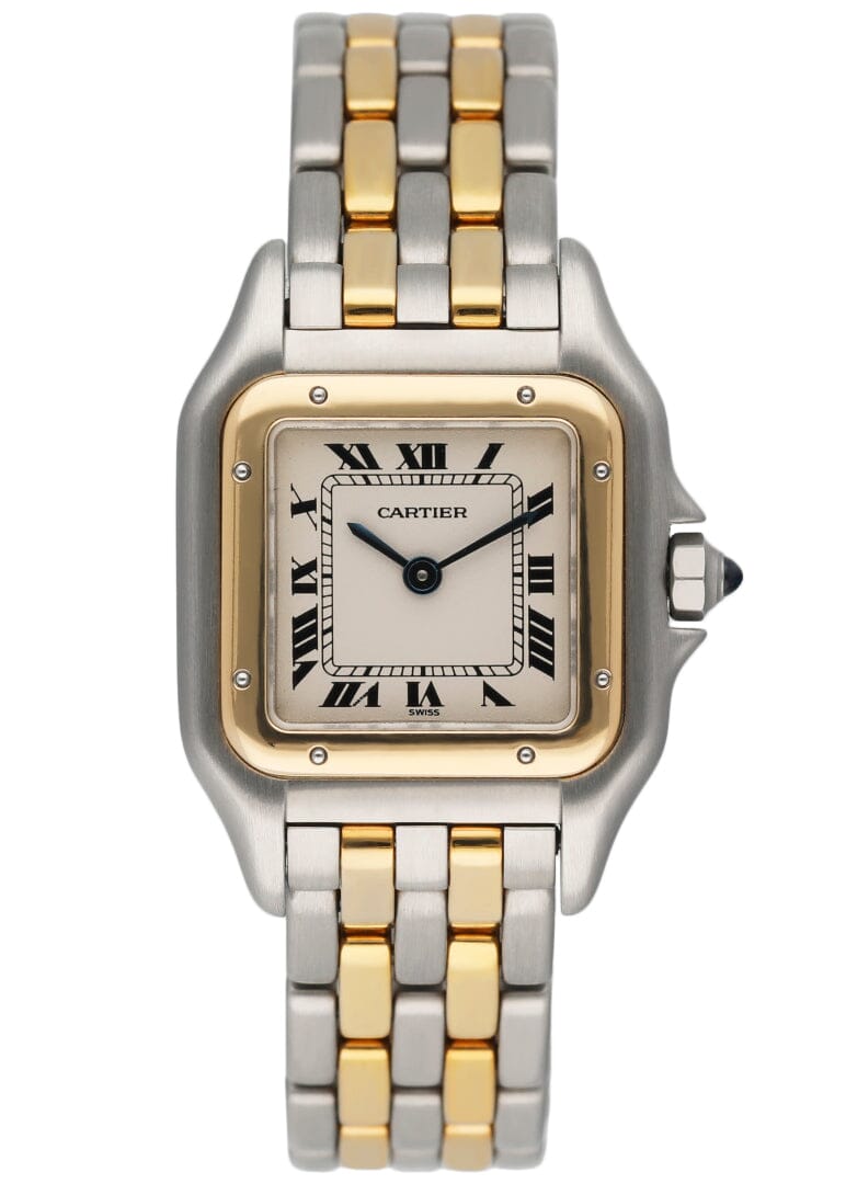 Cartier Panthere 84083242 Ladies Watch. 22mm Stainless Steel case. 18K yellow gold bezel. Off-white dial with blue steel hands and Roman numeral hour markers. Minute markers on the inner dial. Stainless steel & two rows of 18K yellow gold bracelet with hidden butterfly clasp. Will fit up to a 5.75-inch wrist. Sapphire crystal. Stainless steel case back. Quartz: Battery powered movement.