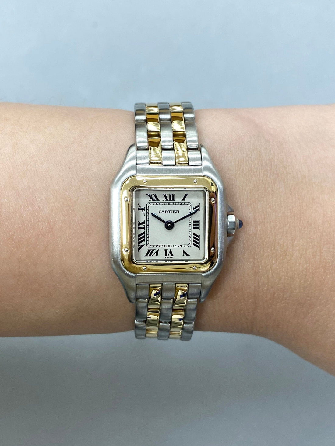 Cartier Panthere W25029B6 / 1120 Ladies Watch. 22mm stainless steel case. 18K yellow gold bezel. Off-White dial with blue steel hands and Roman numeral hour markers. Minute markers on the inner dial. Stainless steel & two rows of 18K yellow gold bracelet with hidden butterfly clasp. Will fit up to a 5.5-inch wrist. Sapphire crystal. Stainless steel case back. Quartz: Battery-powered movement. This watch comes with original Box and Papers.