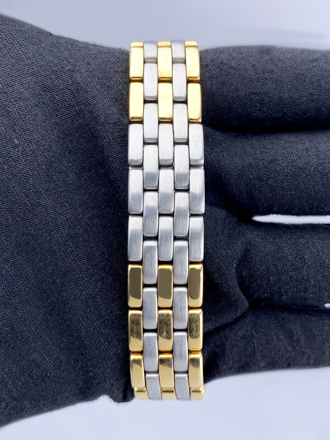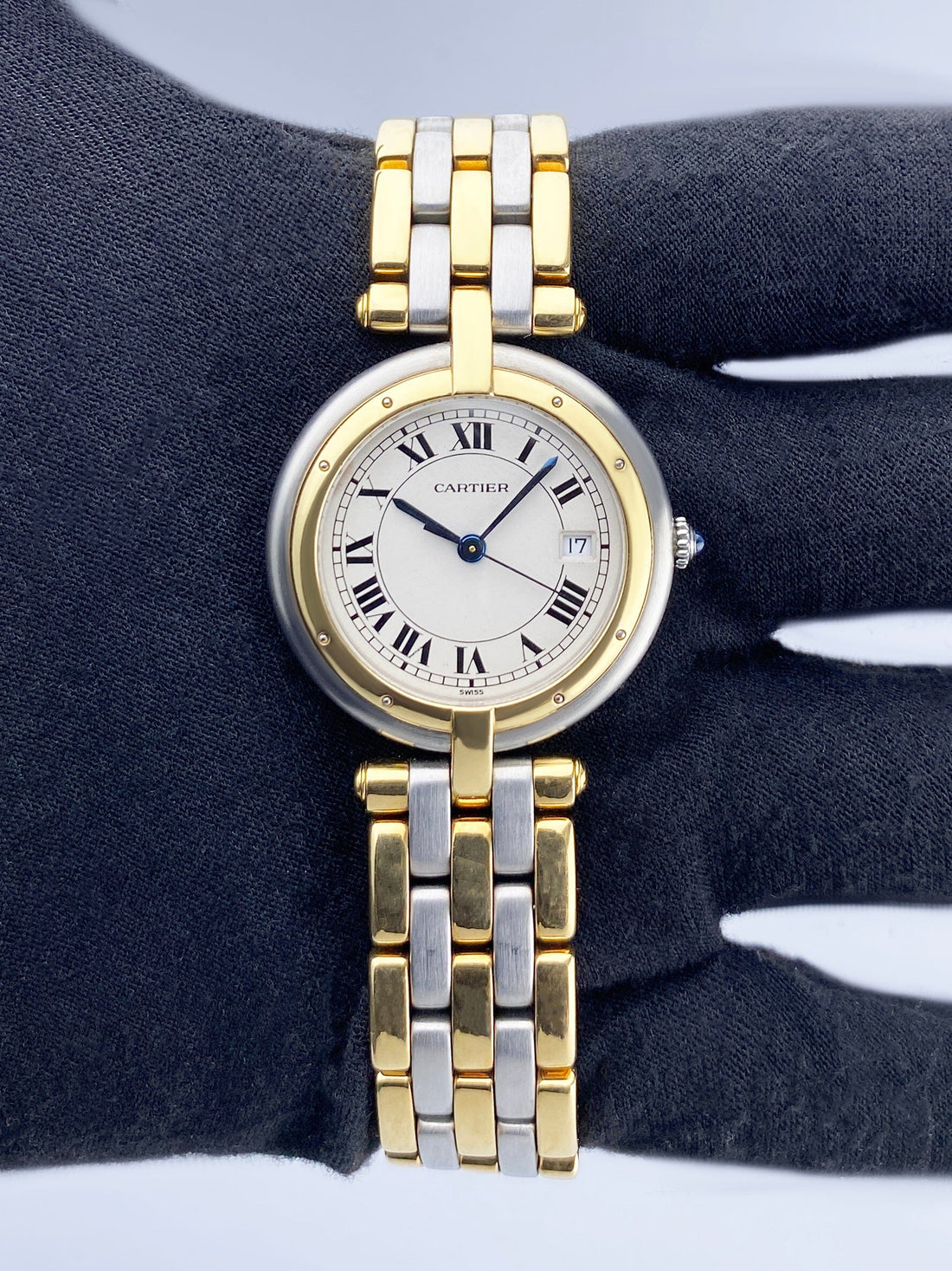 Cartier Panthere Vendome 8396 Ladies Watch. 30mm stainless steel case. 18K Yellow Gold smooth bezel. Off-White dial with blue steel hands and Roman numeral hour markers. Minute markers on the outer dial. Date display at 3 o'clock position. Three rows of 18K Yellow Gold and stainless steel bracelet with hidden Butterfly Clasp. Will fit up to a 6-inch wrist. Sapphire crystal. Stainless steel case back. Quartz: Battery powered movement.