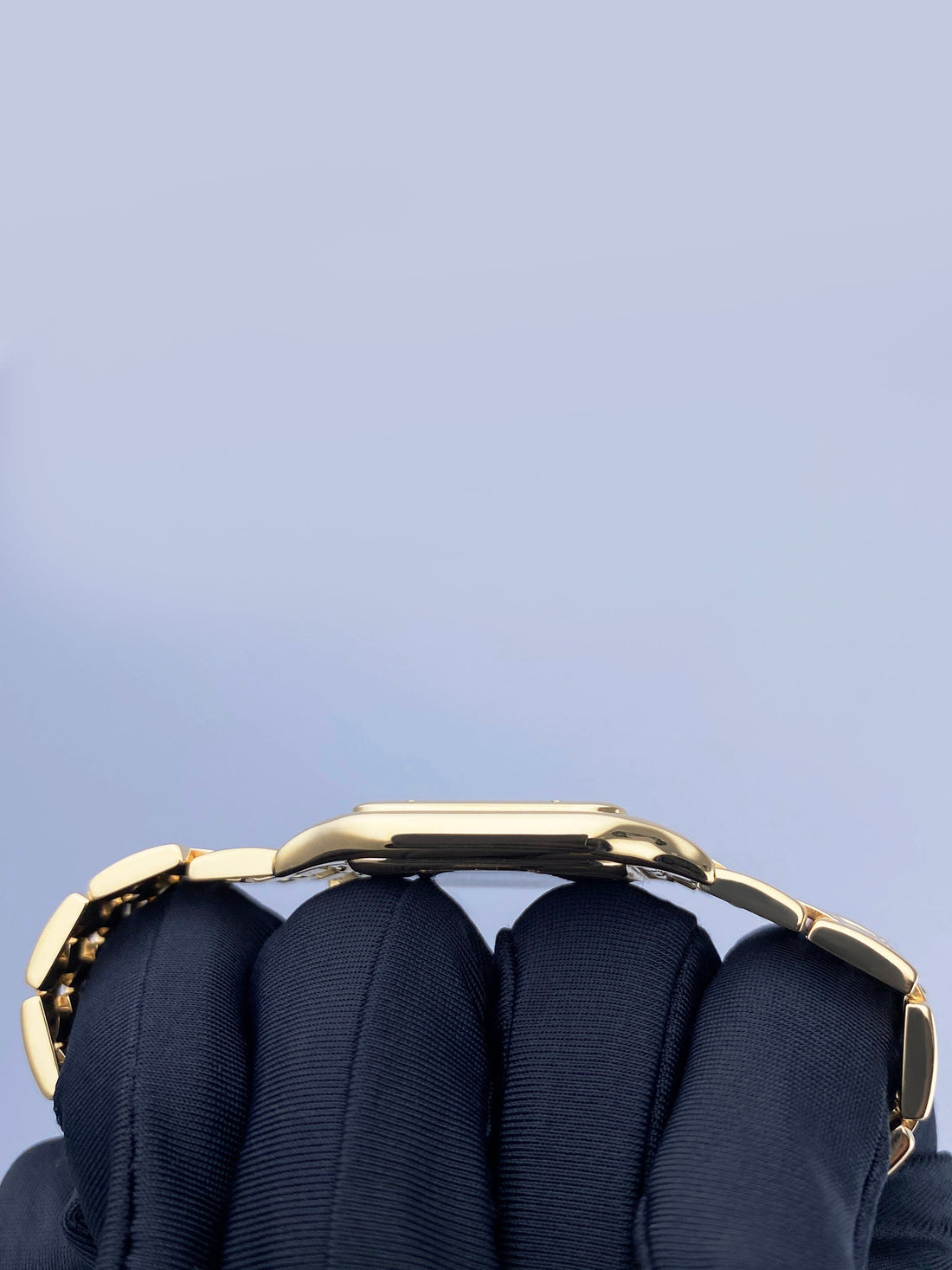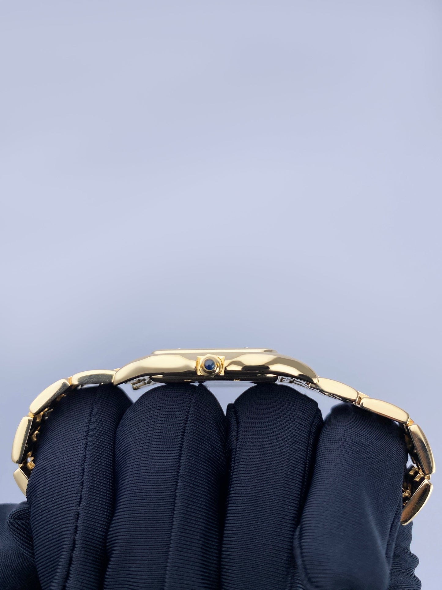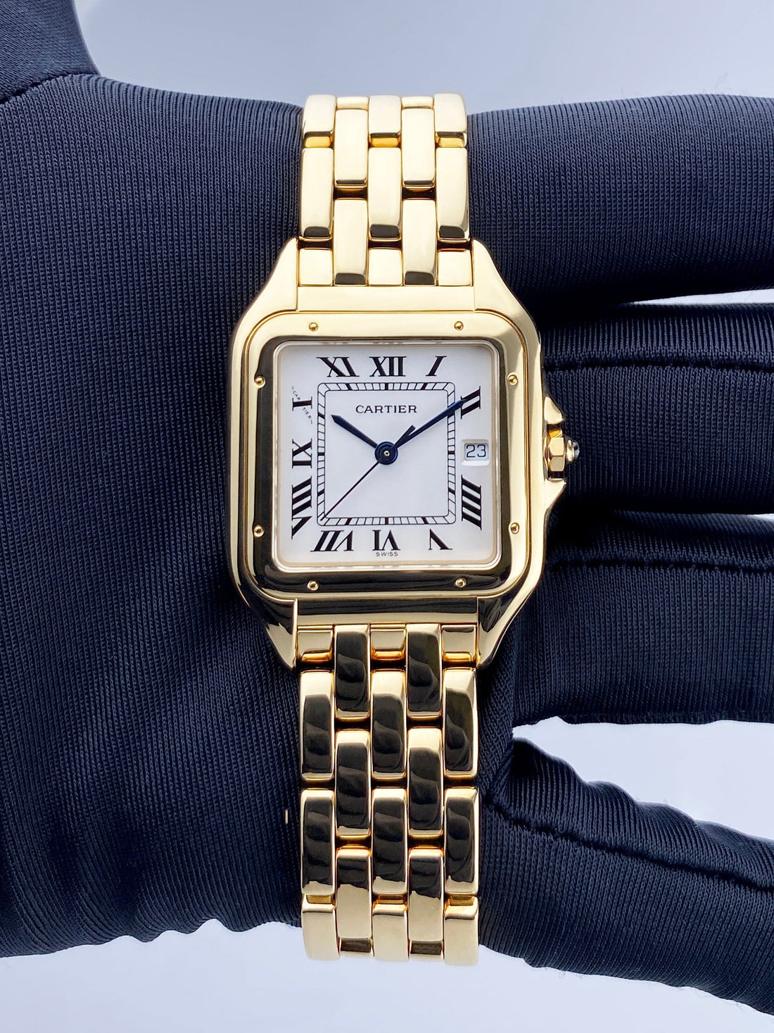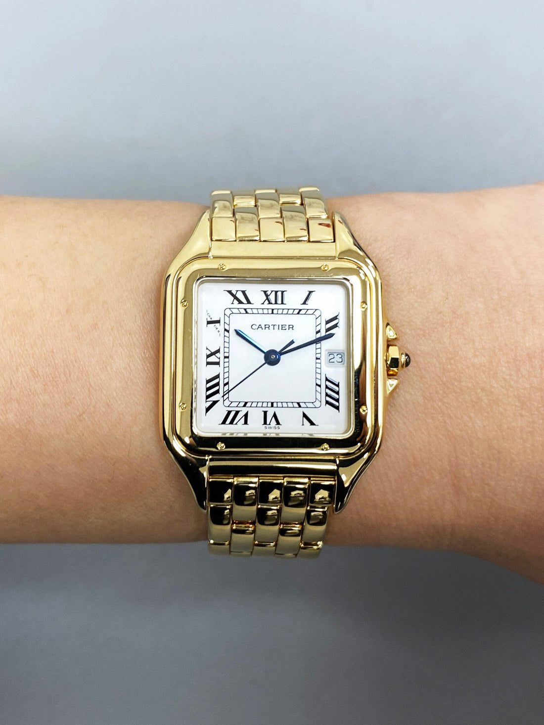 Cartier Panthere Large W25014B9 / 887968 Mens Watch. 29mm 18K yellow case with 18K yellow gold bezel. Silver dial with blue steel hands and black Roman numeral hour markers. Date display at the 3 o'clock position. Minute markers on the inner dial. 18K yellow gold bracelet with a hidden butterfly clasp. Will fit up to a 6.5-inch wrist. Sapphire crystal. 18K yellow gold case back. Quartz: battery powered movement.