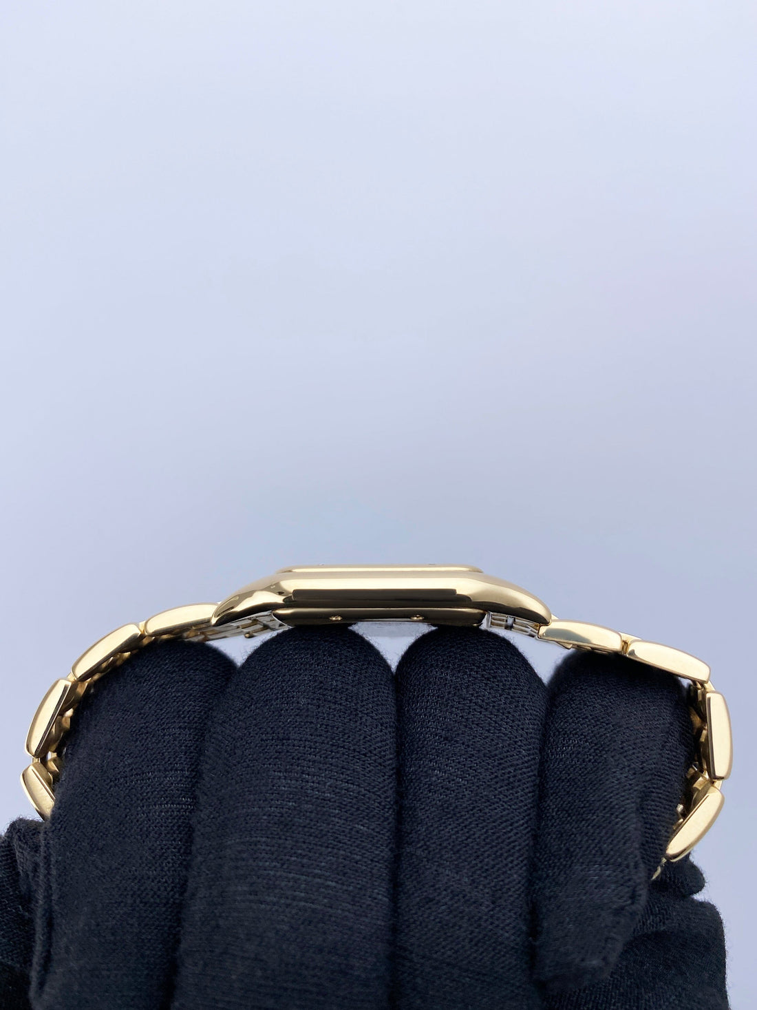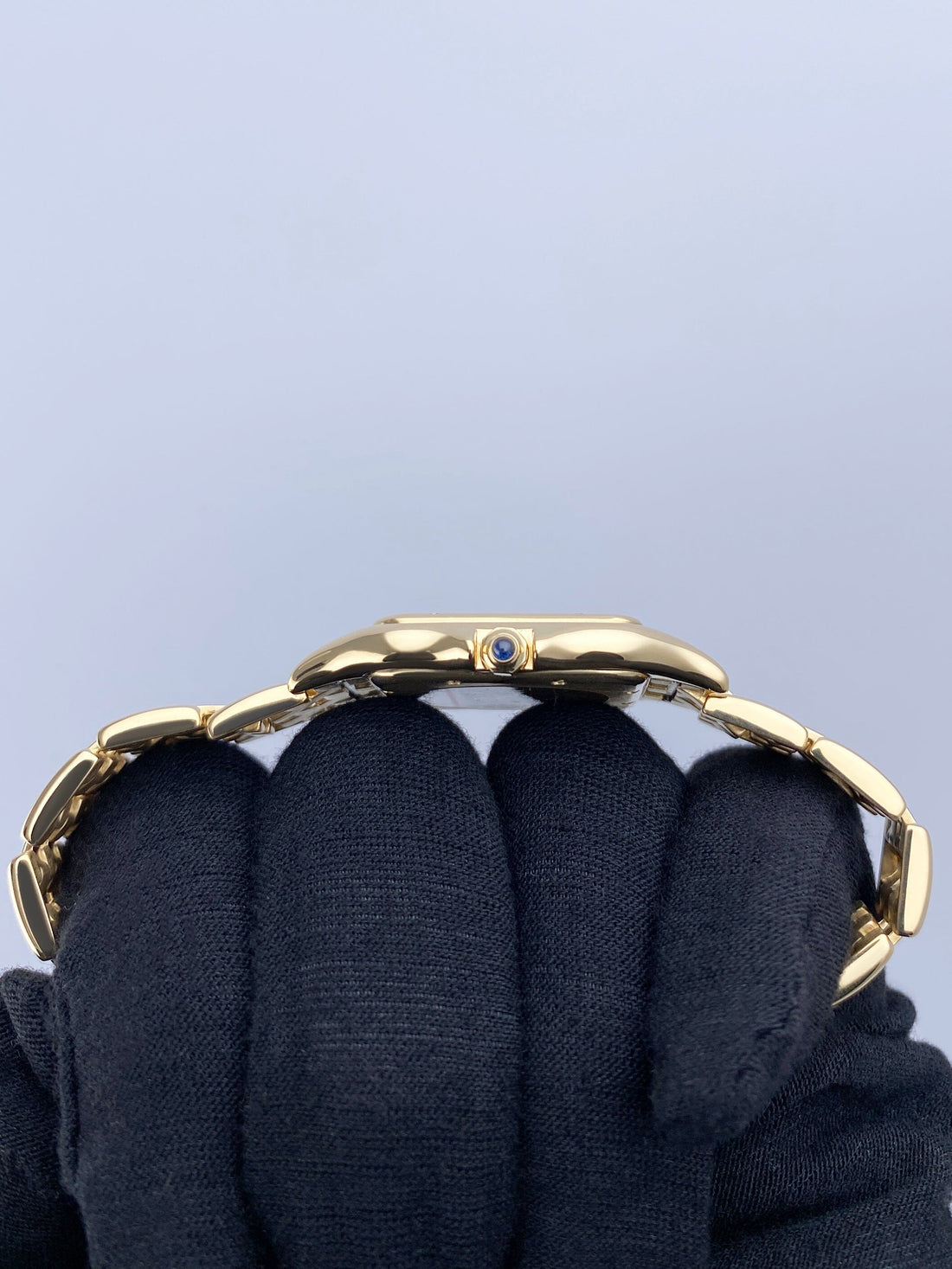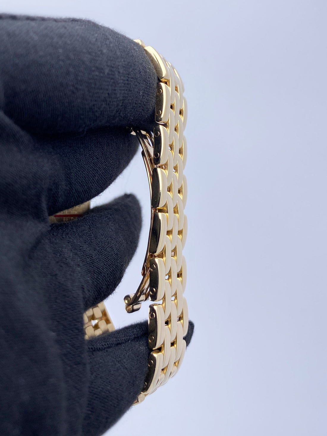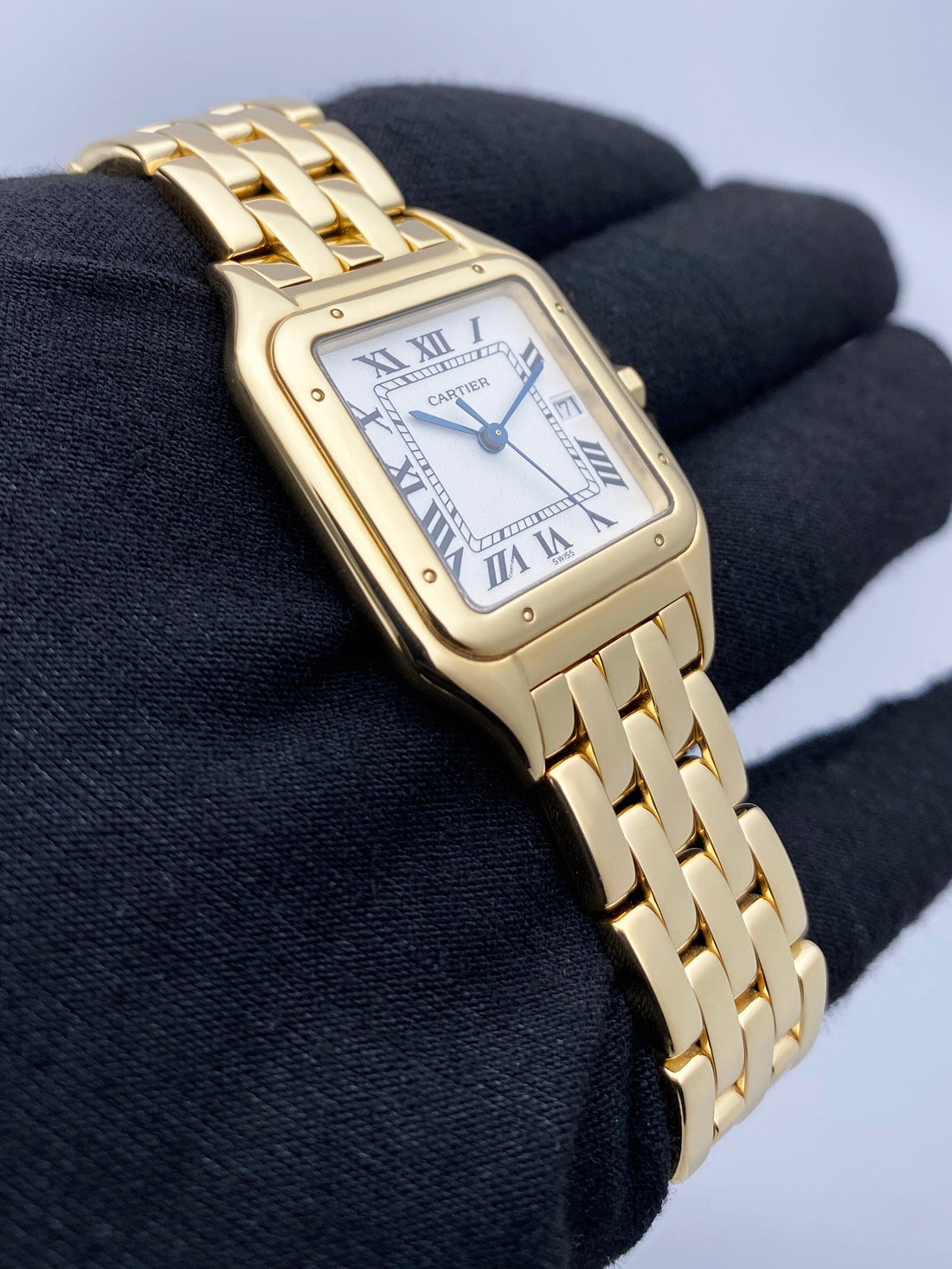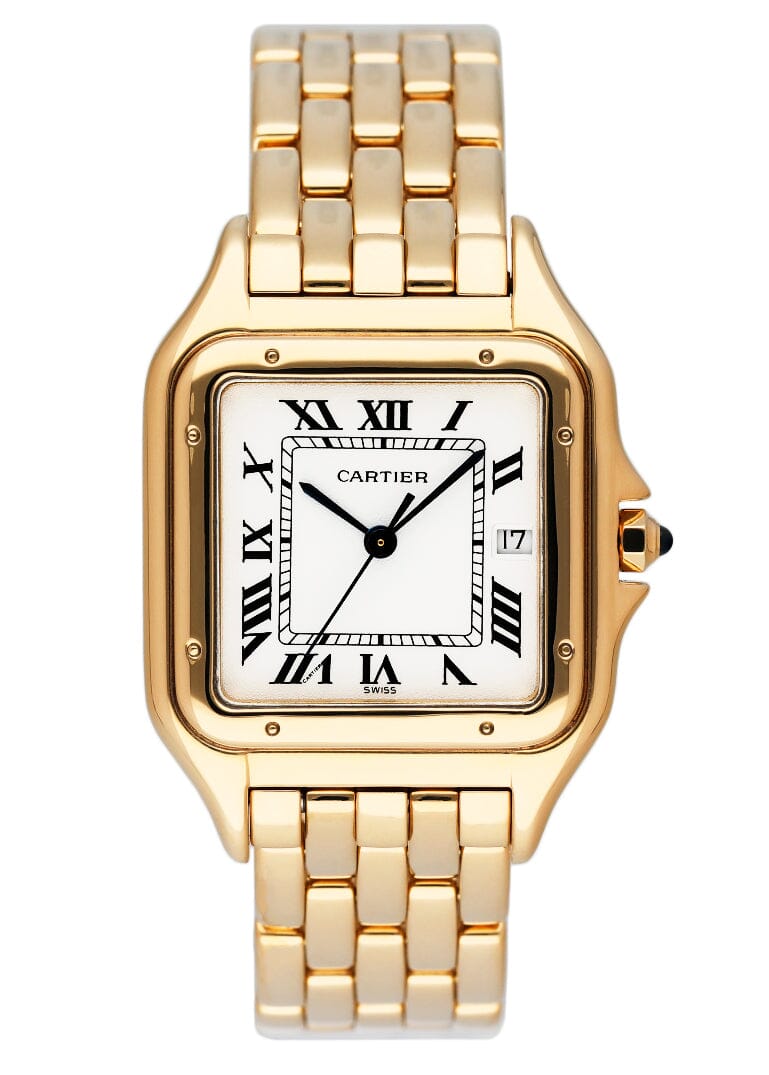Cartier Panthere Large W25014B9 / 887968 Mens Watch. 29mm 18K yellow case with 18K yellow gold bezel. Silver dial with blue steel hands and black Roman numeral hour markers. Date display at the 3 o'clock position. Minute markers on the inner dial. 18K yellow gold bracelet with a hidden butterfly clasp. Will fit up to a 6.25-inch wrist. Sapphire crystal. 18K yellow gold case back. Quartz: battery powered movement.