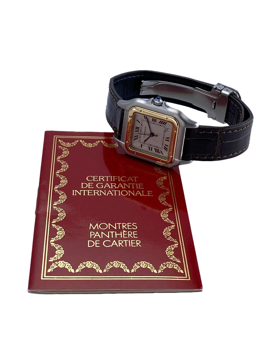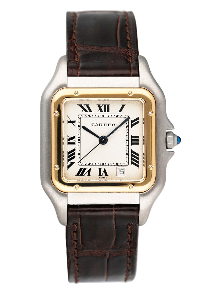 Cartier Panthere W250285E / 1100 Midsize Ladies Watch. 27mm stainless steel case with a 18K yellow gold bezel. Off-white dial with blue steel hands and black Roman numerals hour markers. Date display at the 5 o'clock position. Brown leather strap with stainless steel deployment clasp. Will fit up to a 6.5-inch wrist. Sapphire crystal. Stainless steel case back. Quartz battery powered movement. This watch comes with original Box and Papers.