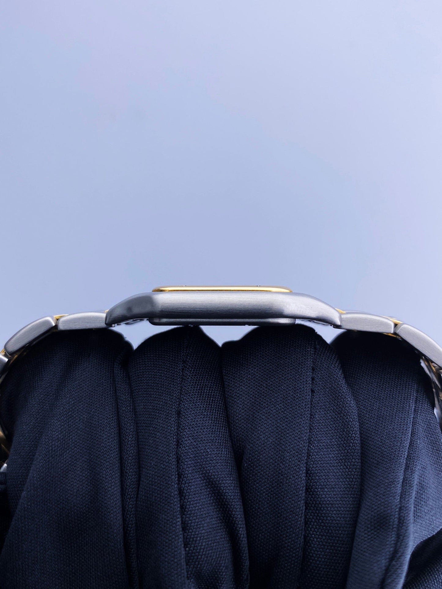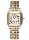 Cartier Panthere W25028B6 Midsize Ladies Watch. 27mm stainless steel case with a 18K yellow gold bezel. Off-White dial with blue steel hands and black Roman numerals hour markers. Date display at the 5 o'clock position. Two-tone stainless steel and 18K yellow gold bracelet with stainless steel hidden butterfly clasp. Will fit up to a 5.75-inch wrist. Sapphire crystal. Stainless steel case back. Quartz battery powered movement.