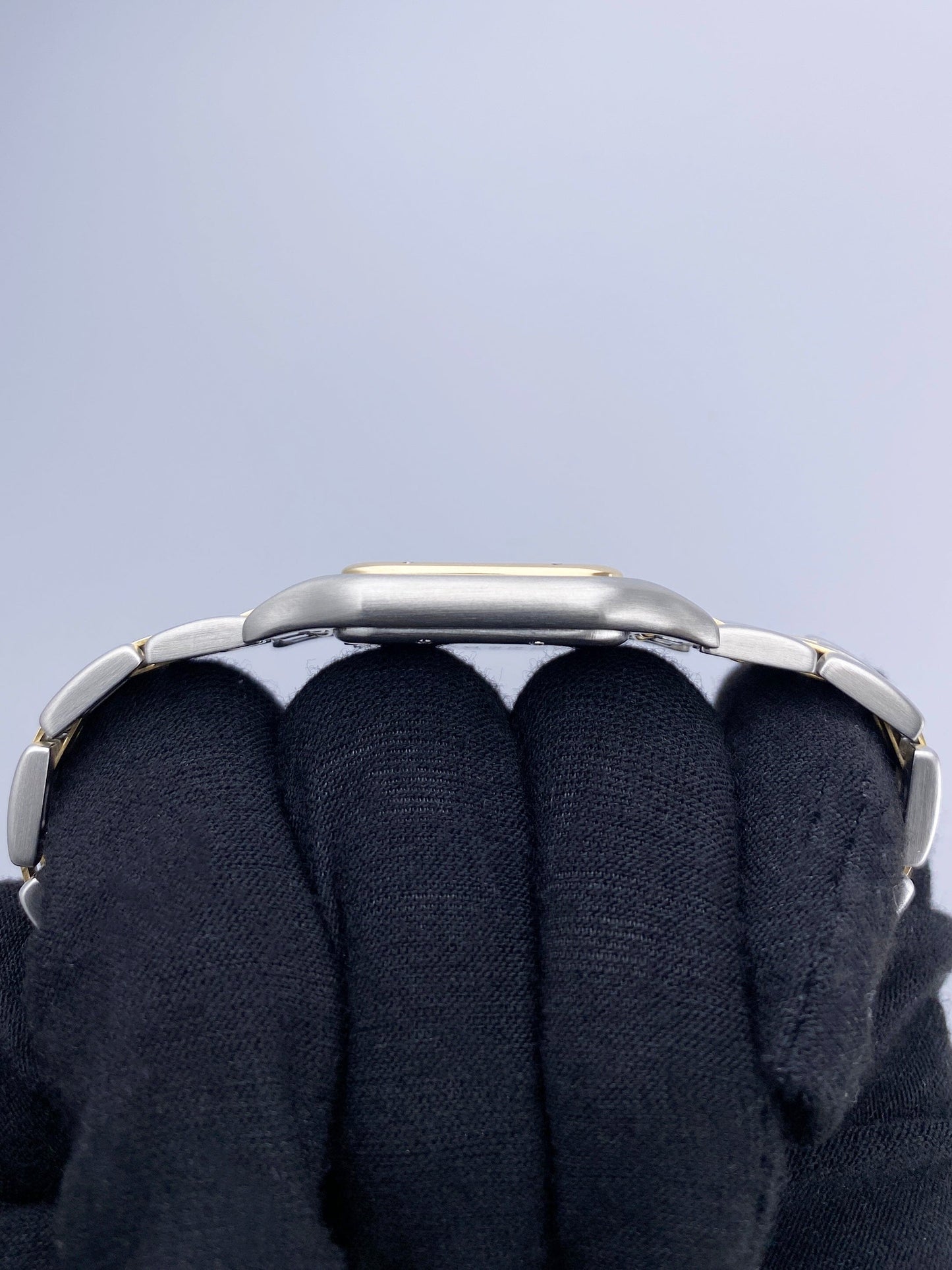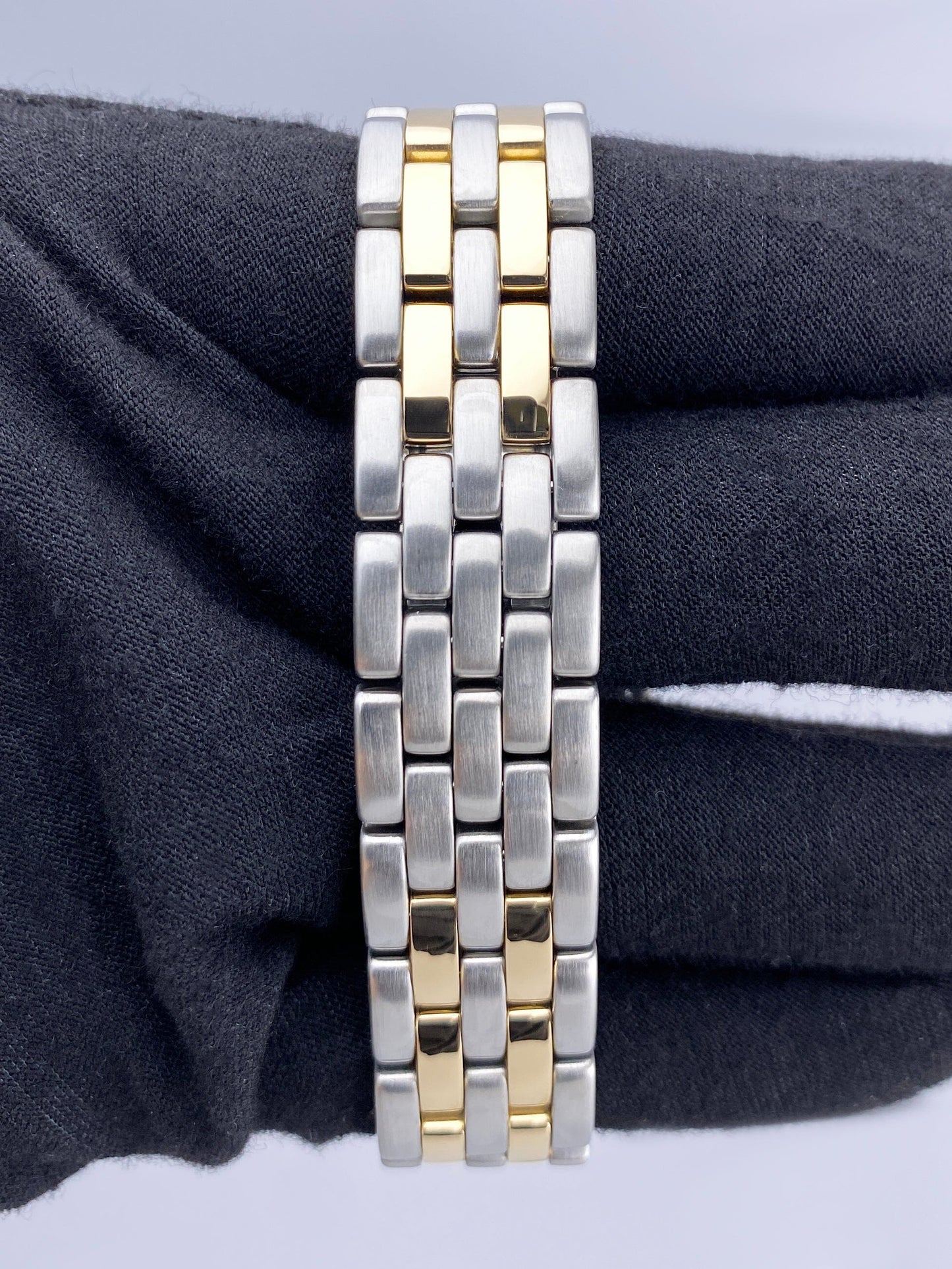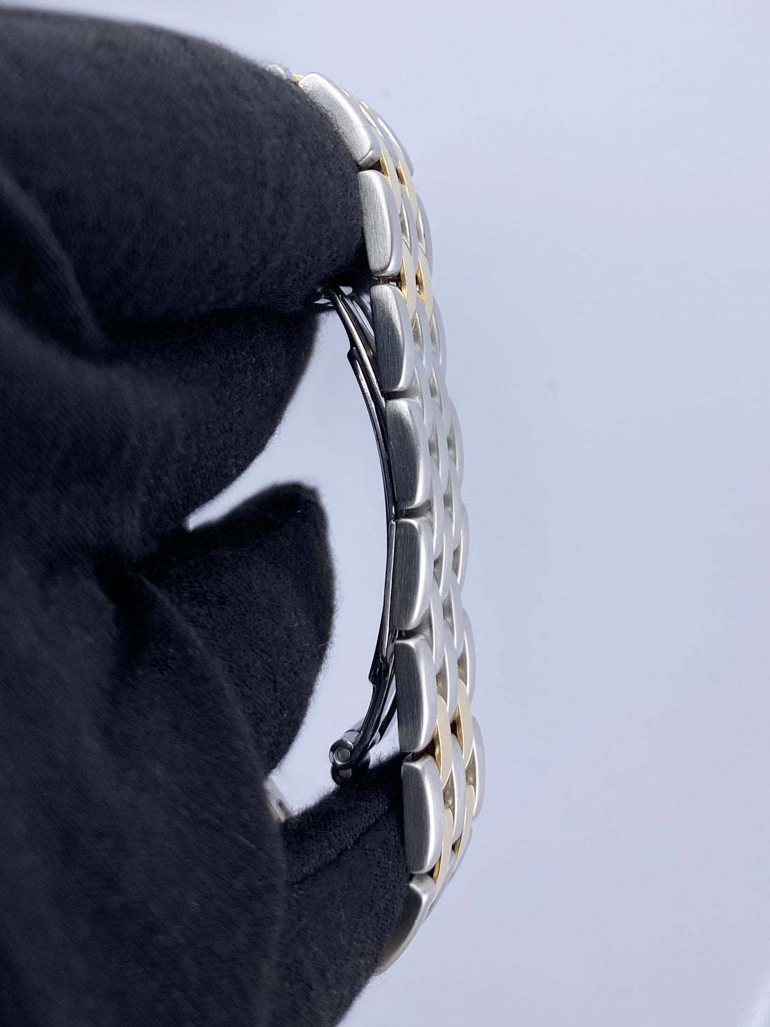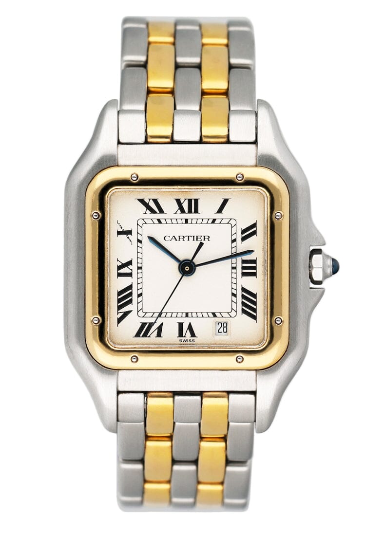 Cartier Panthere W25028B6 Midsize Ladies Watch. 27mm stainless steel case with a 18K yellow gold bezel. Off-White dial with blue steel hands and black Roman numerals hour markers. Date display at the 5 o'clock position. Two-tone stainless steel and 18K yellow gold bracelet with stainless steel hidden butterfly clasp. Will fit up to a 6-inch wrist. Sapphire crystal. Stainless steel case back. Quartz battery powered movement.