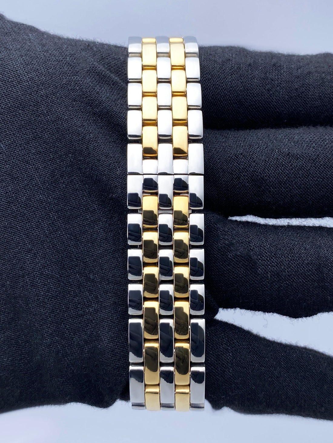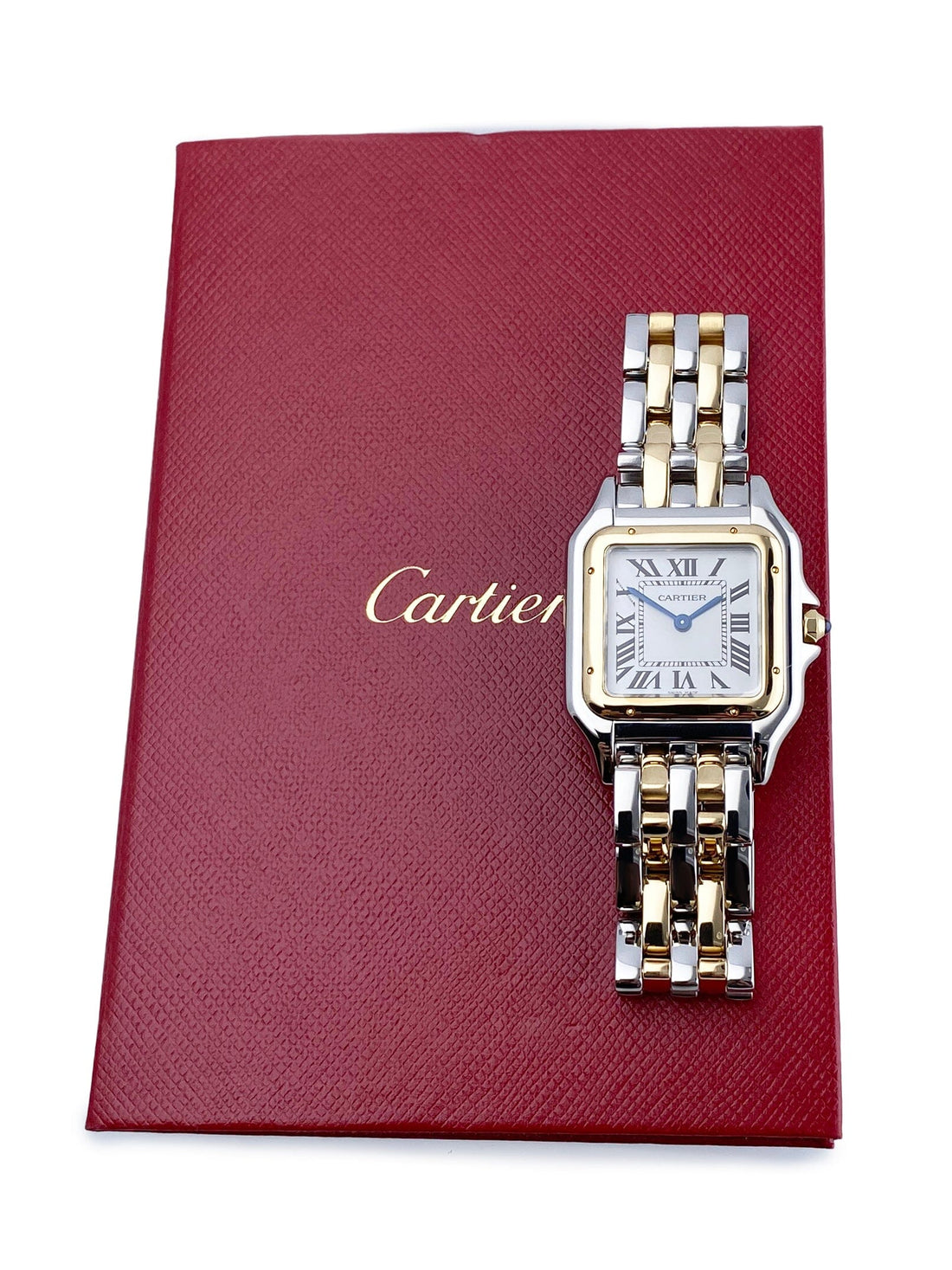 Cartier Panthere W2PN0007 / 4017 Ladies Watch. 27mm stainless steel case. 18K yellow gold smooth bezel. Silver dial with blue steel hands and Roman numeral hour markers. Minute markers on the inner dial. 18K yellow gold & stainless steel bracelet with hidden butterfly clasp. Will fit up to a 6.5-inch wrist. Sapphire crystal. Stainless steel case back. Quartz: Battery powered movement. This watch comes with Cartier certificate of authenticity.
