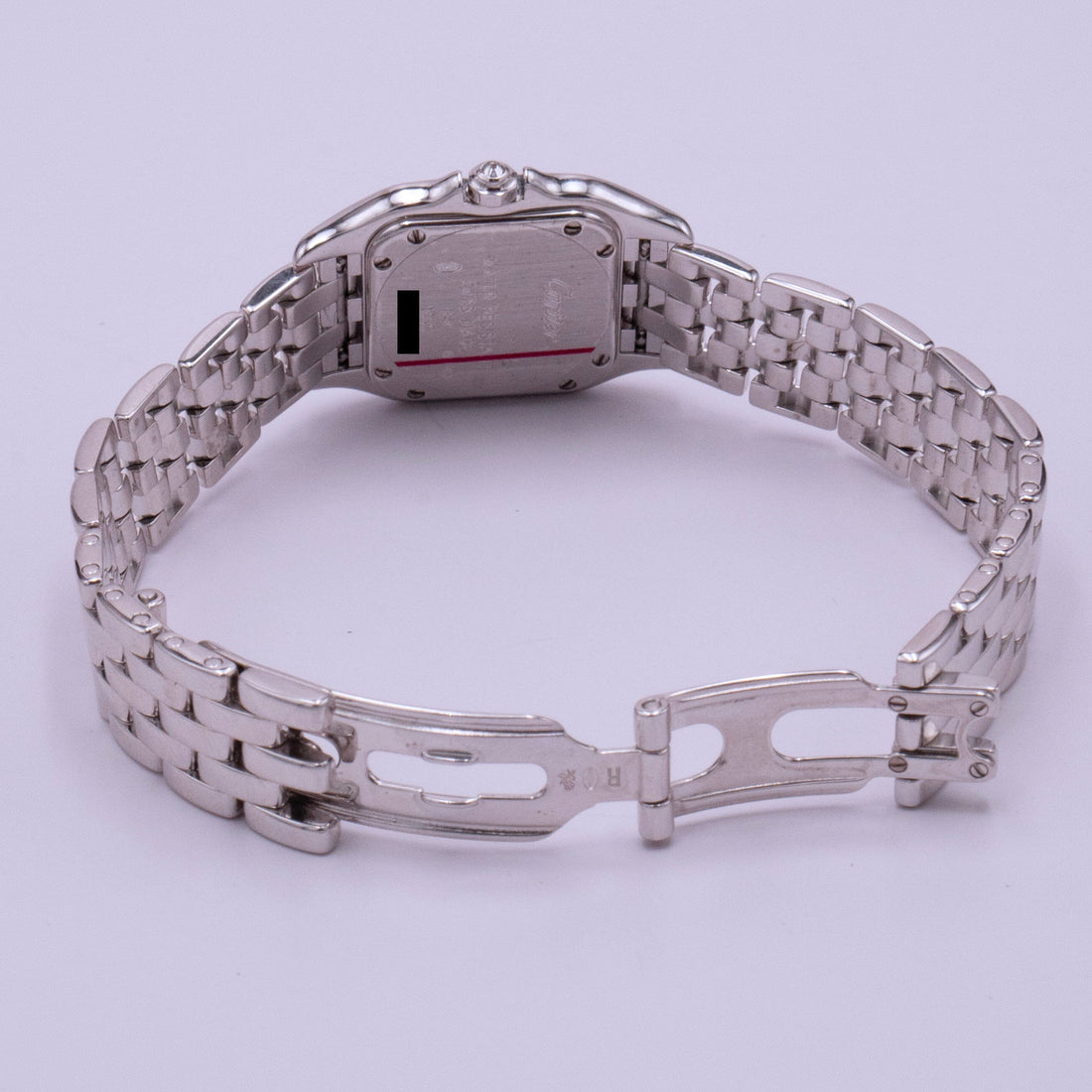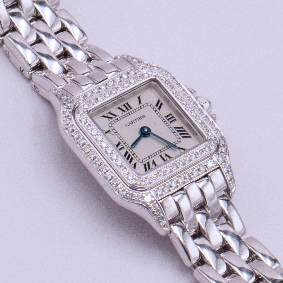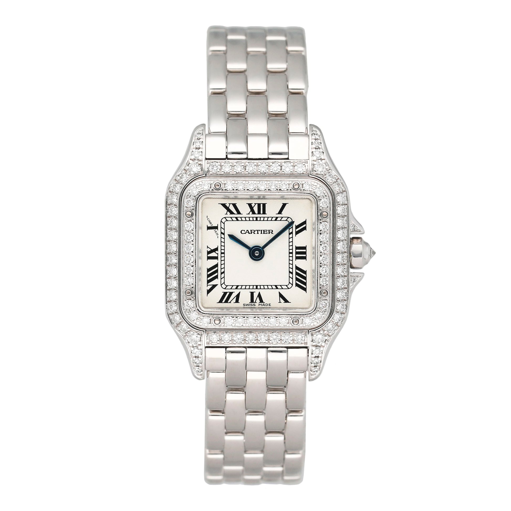 Cartier Panthere WF3118F3 / 1660 Ladies Watch. 17mm 18K white gold case with original factory diamond. 18K white gold bezel with original factory diamond. Off-white dial with gold hands and black Roman numeral hour markers. 18K white gold bracelet with hidden butterfly clasp. Will fit up to a 6-inch wrist. Sapphire crystal. 18K white gold case back. Quartz battery powered movement. This watch comes with Service Papers.