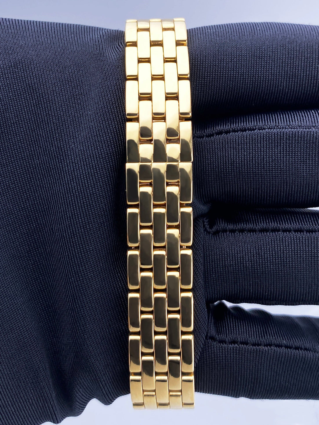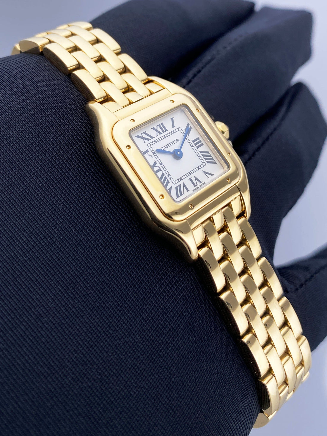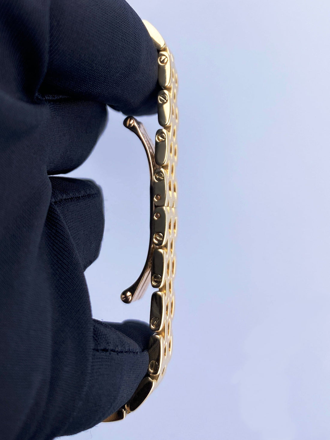 Cartier Panthere WGPN0008 / 4020 Ladies Watch. 22mm 18K yellow gold case. 18K yellow gold bezel. Silver dial with blue hands and Roman numeral hour makers. Minute markers on the inner dial. 18K yellow gold bracelet with an 18K yellow gold hidden butterfly clasp. Will fit up to 6.5-inch wrist. Sapphire crystal. 18K yellow gold case back. Quartz: Battery powered movement.
