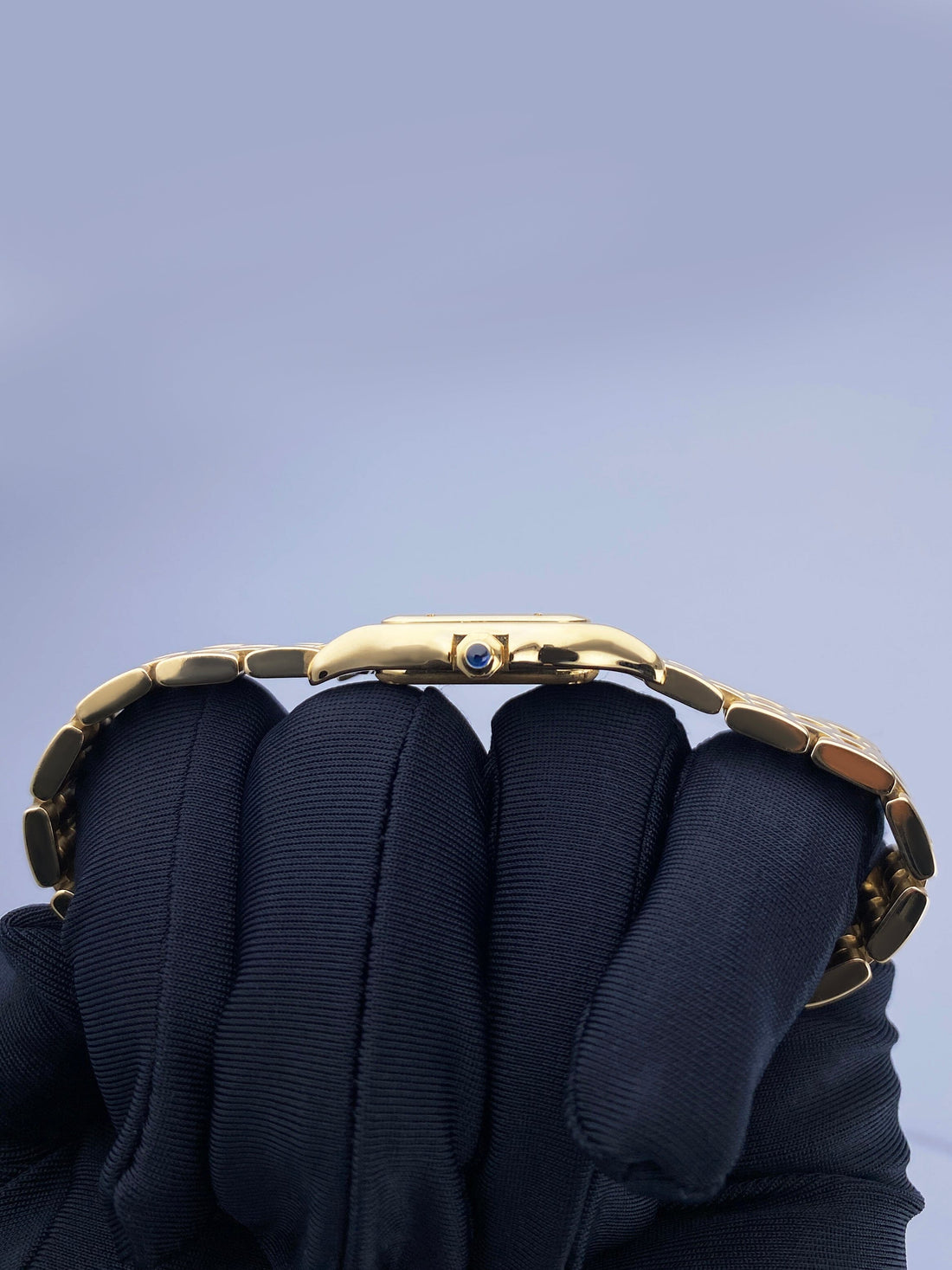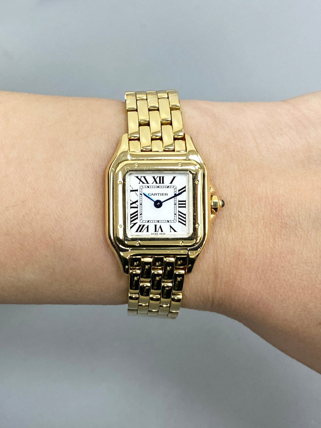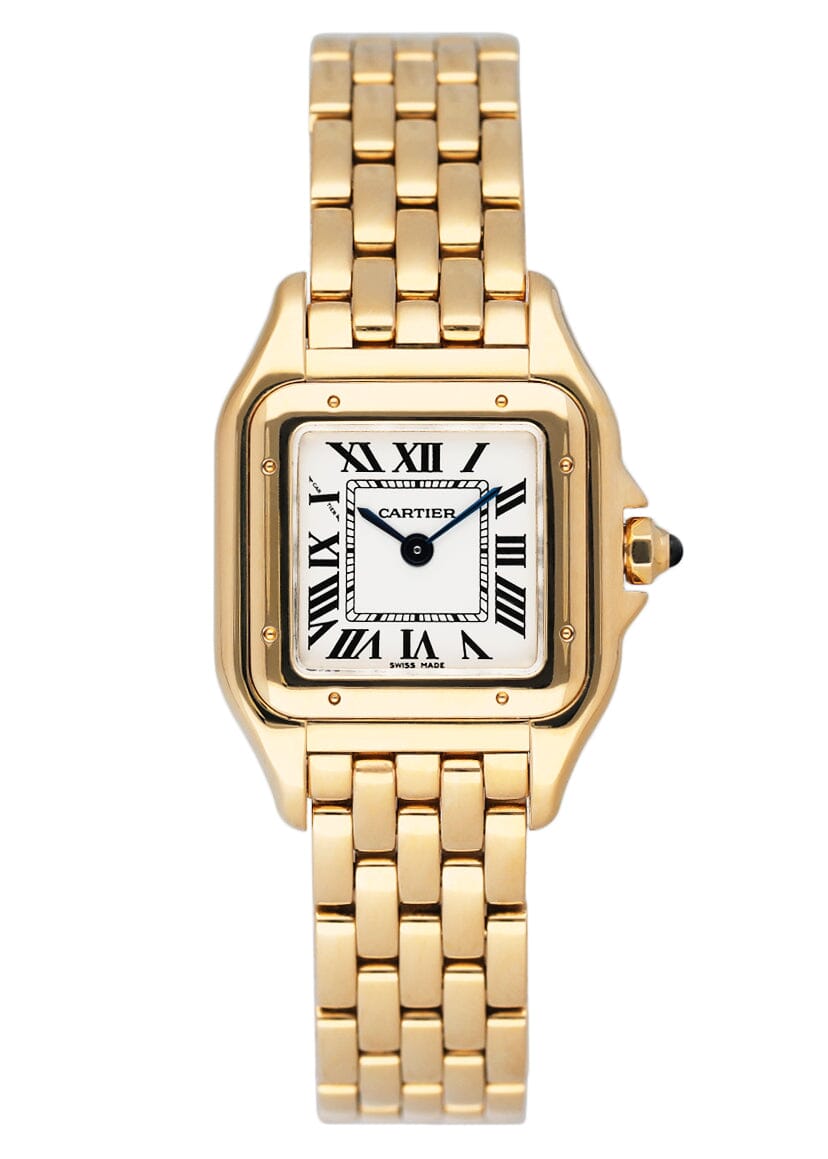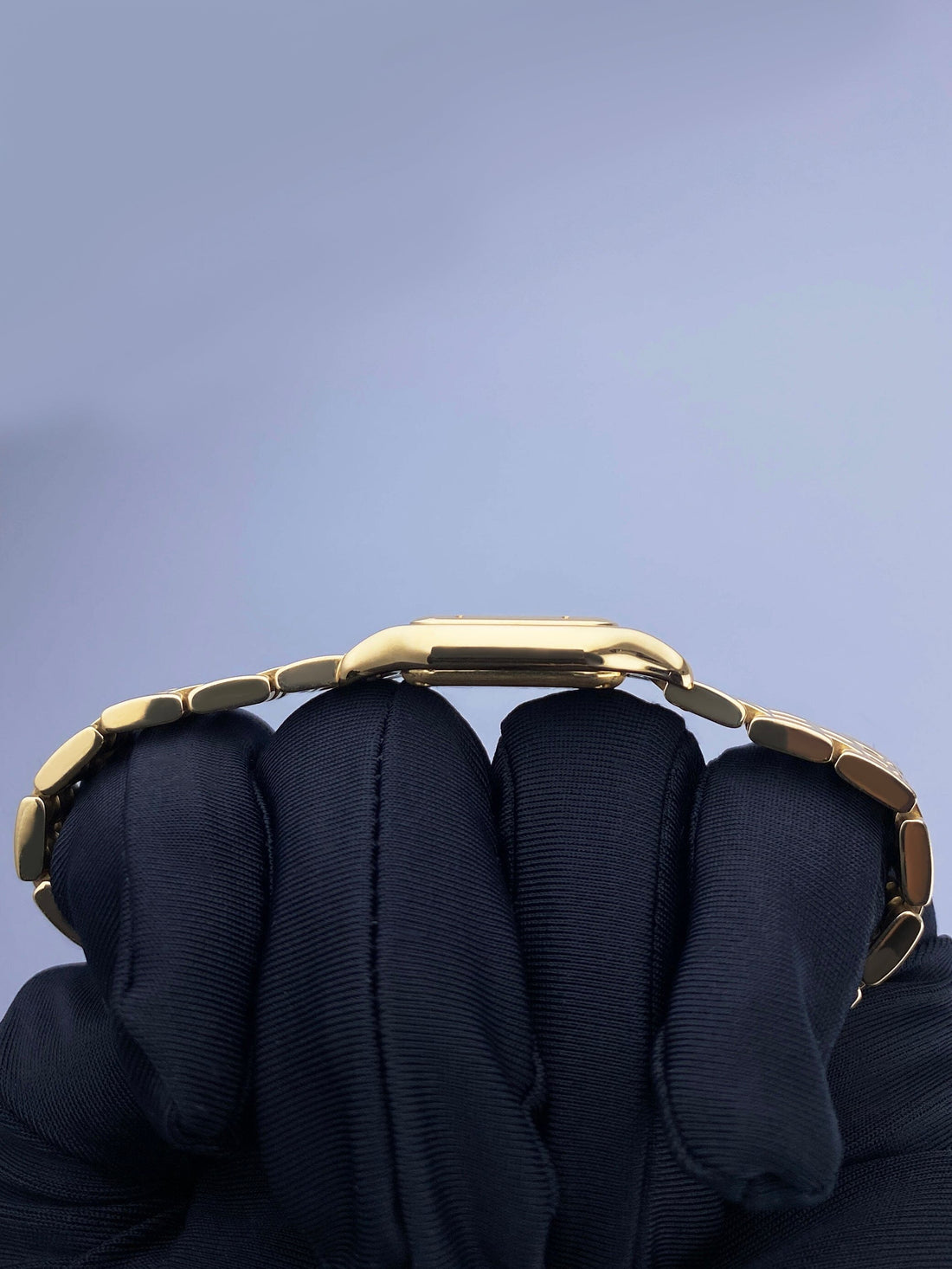 Cartier Panthere WGPN0008 / 4020 Ladies Watch. 22mm 18K yellow gold case. 18K yellow gold bezel. Silver dial with blue hands and Roman numeral hour makers. Minute markers on the inner dial. 18K yellow gold bracelet with an 18K yellow gold hidden butterfly clasp. Will fit up to 6.5-inch wrist. Sapphire crystal. 18K yellow gold case back. Quartz: Battery powered movement.