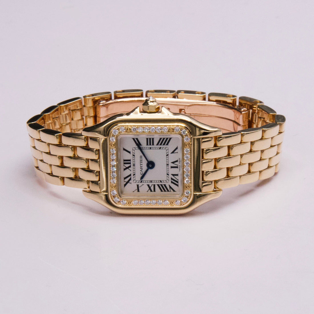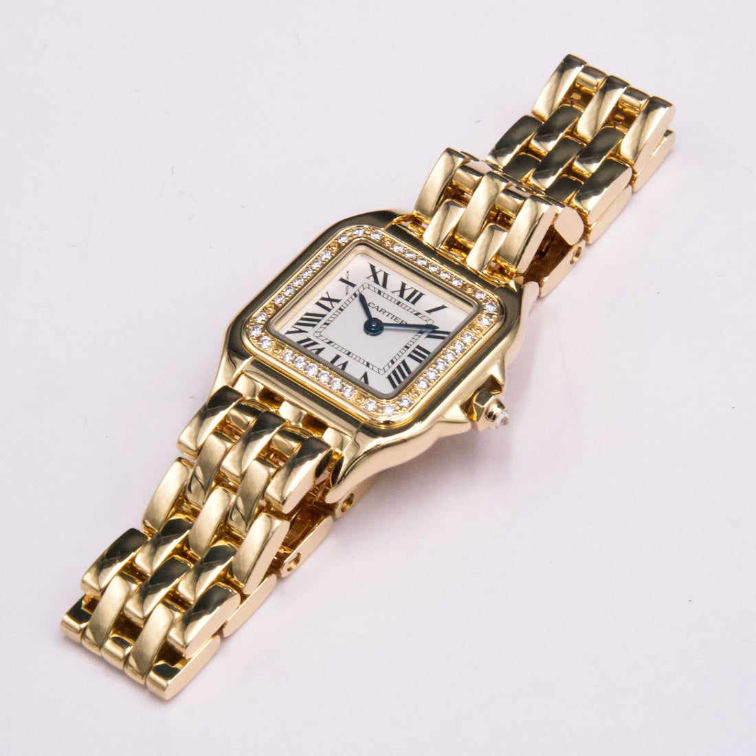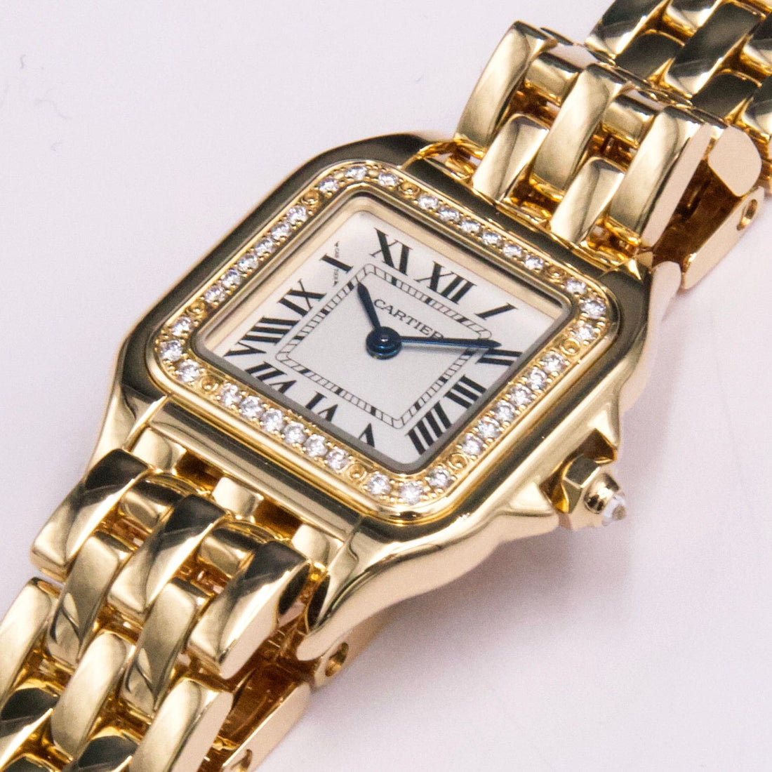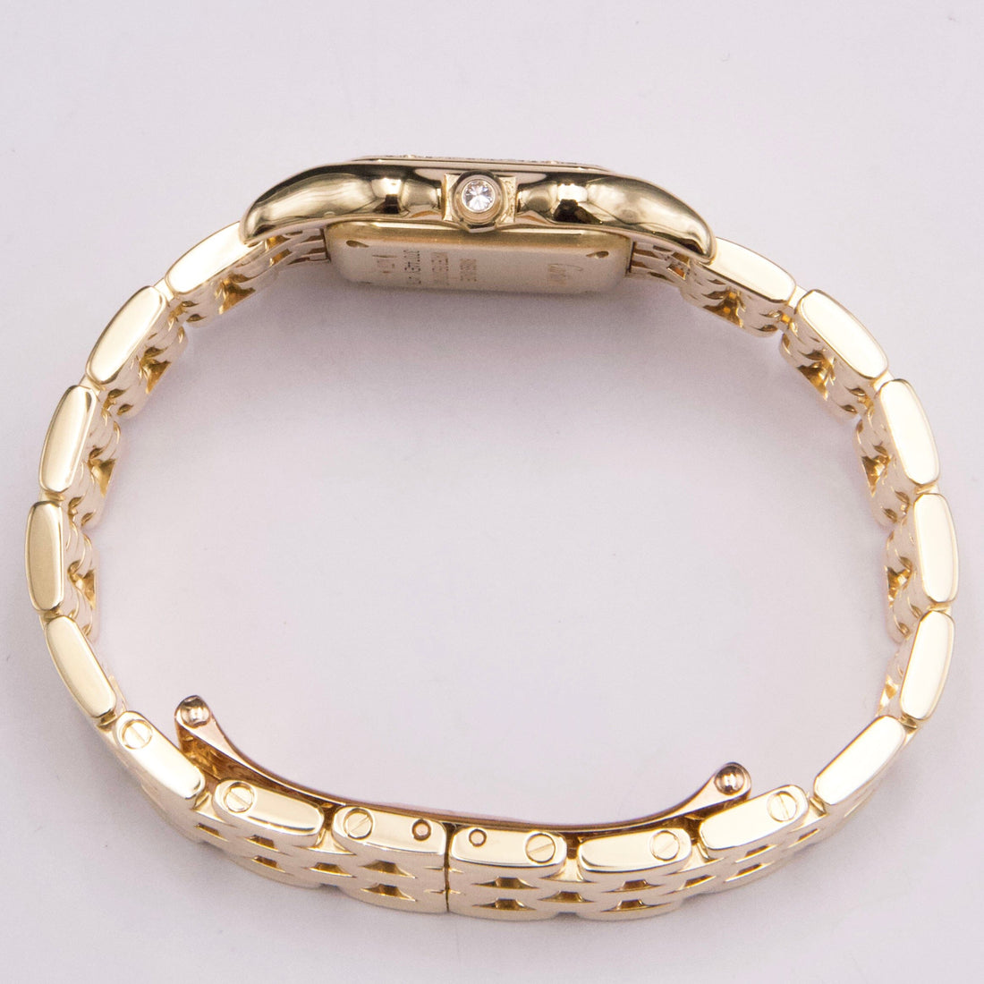 Cartier Panthere WJPN0048 Ladies Watch. 22mm 18K yellow gold case. 18K yellow gold bezel with original factory diamond set. Silver dial with blue hands and Roman numeral hour makers. Minute markers on the inner dial. 18K yellow gold bracelet with an 18K yellow gold hidden butterfly clasp. Will fit up to 5.75-inch wrist. Sapphire crystal. 18K yellow gold case back. Quartz: Battery powered movement.