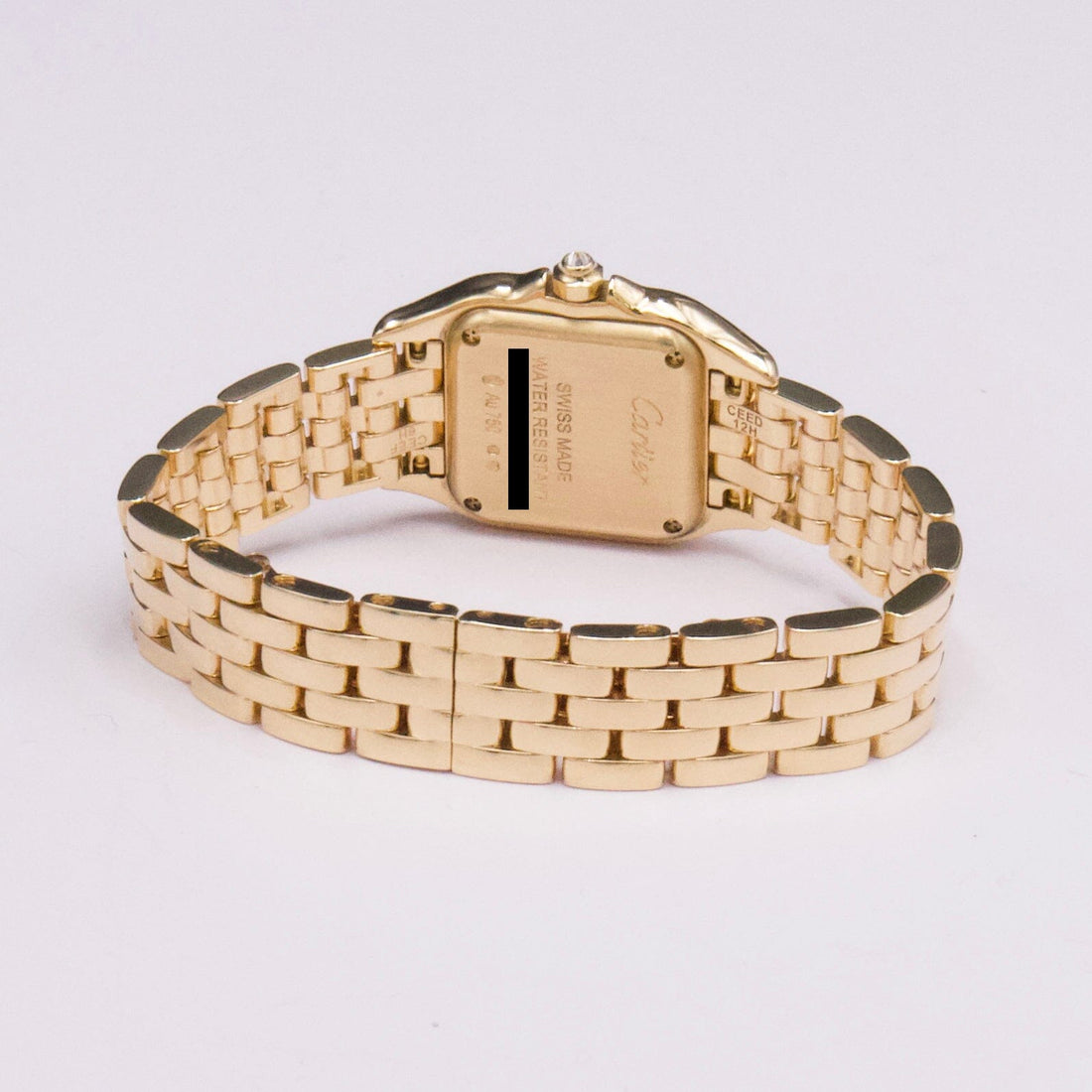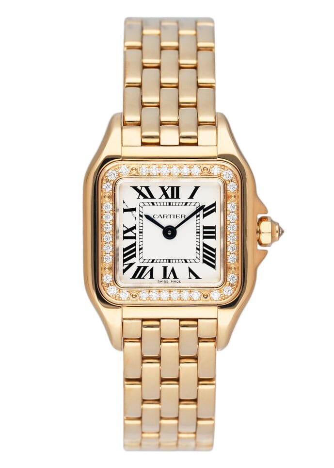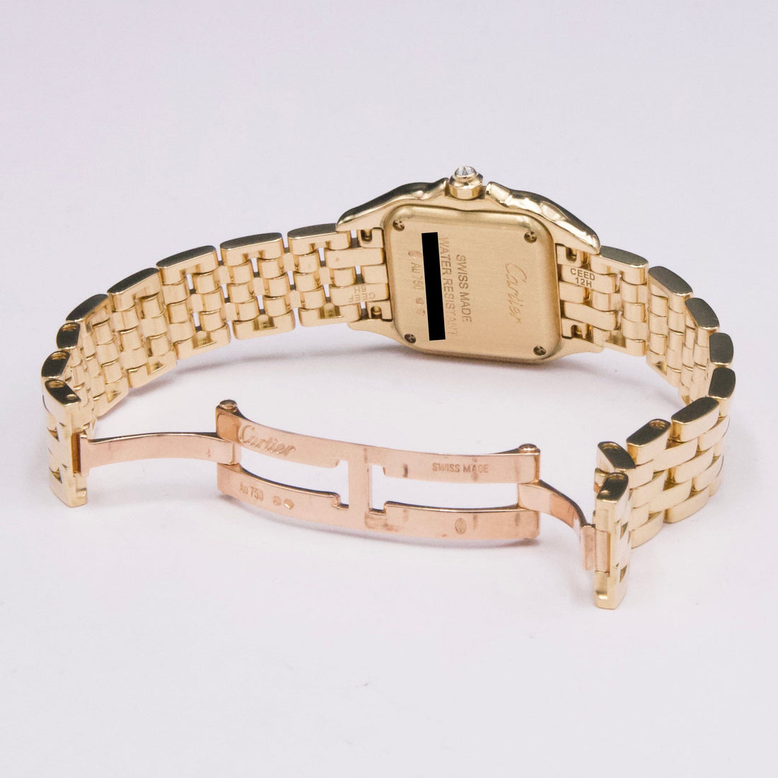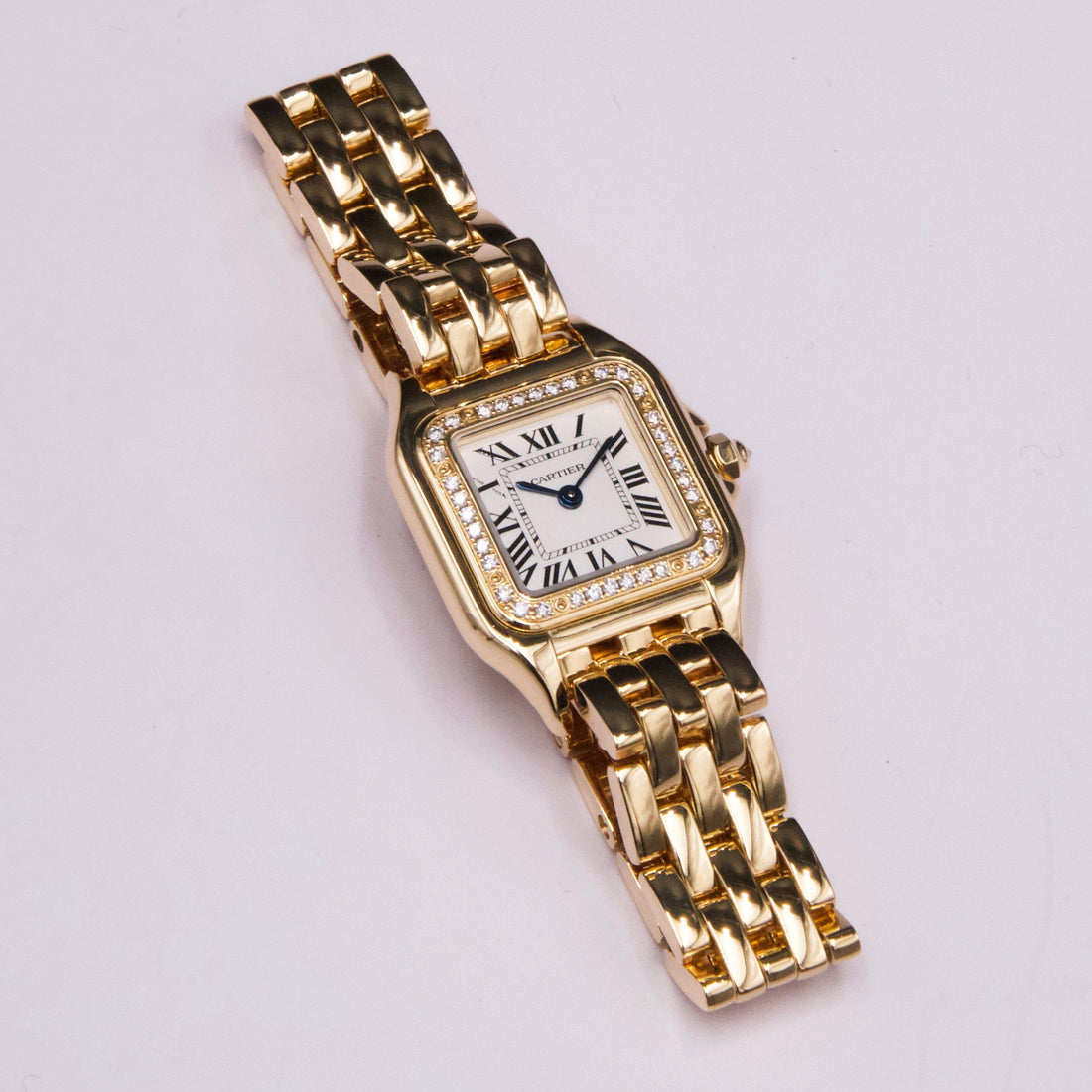 Cartier Panthere WJPN0048 Ladies Watch. 22mm 18K yellow gold case. 18K yellow gold bezel with original factory diamond set. Silver dial with blue hands and Roman numeral hour makers. Minute markers on the inner dial. 18K yellow gold bracelet with an 18K yellow gold hidden butterfly clasp. Will fit up to 5.75-inch wrist. Sapphire crystal. 18K yellow gold case back. Quartz: Battery powered movement.