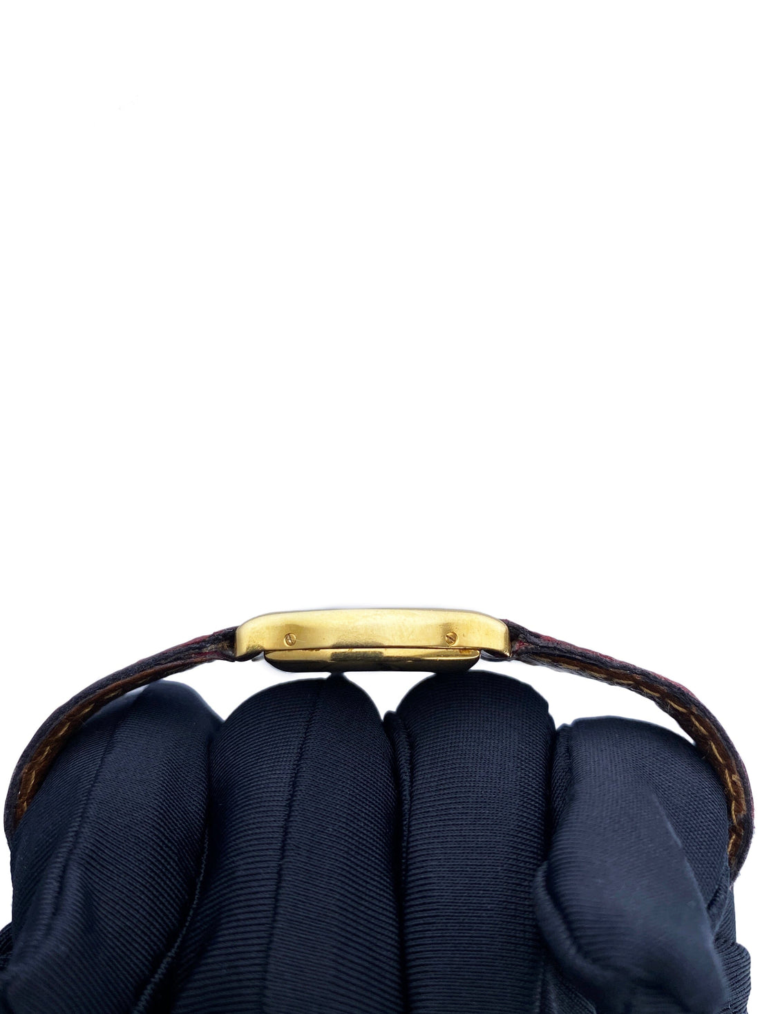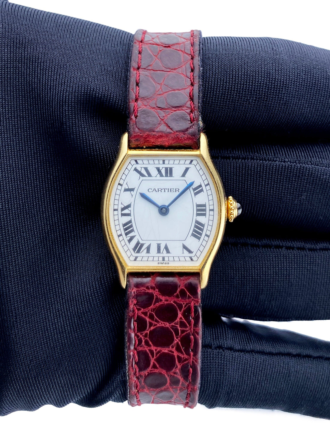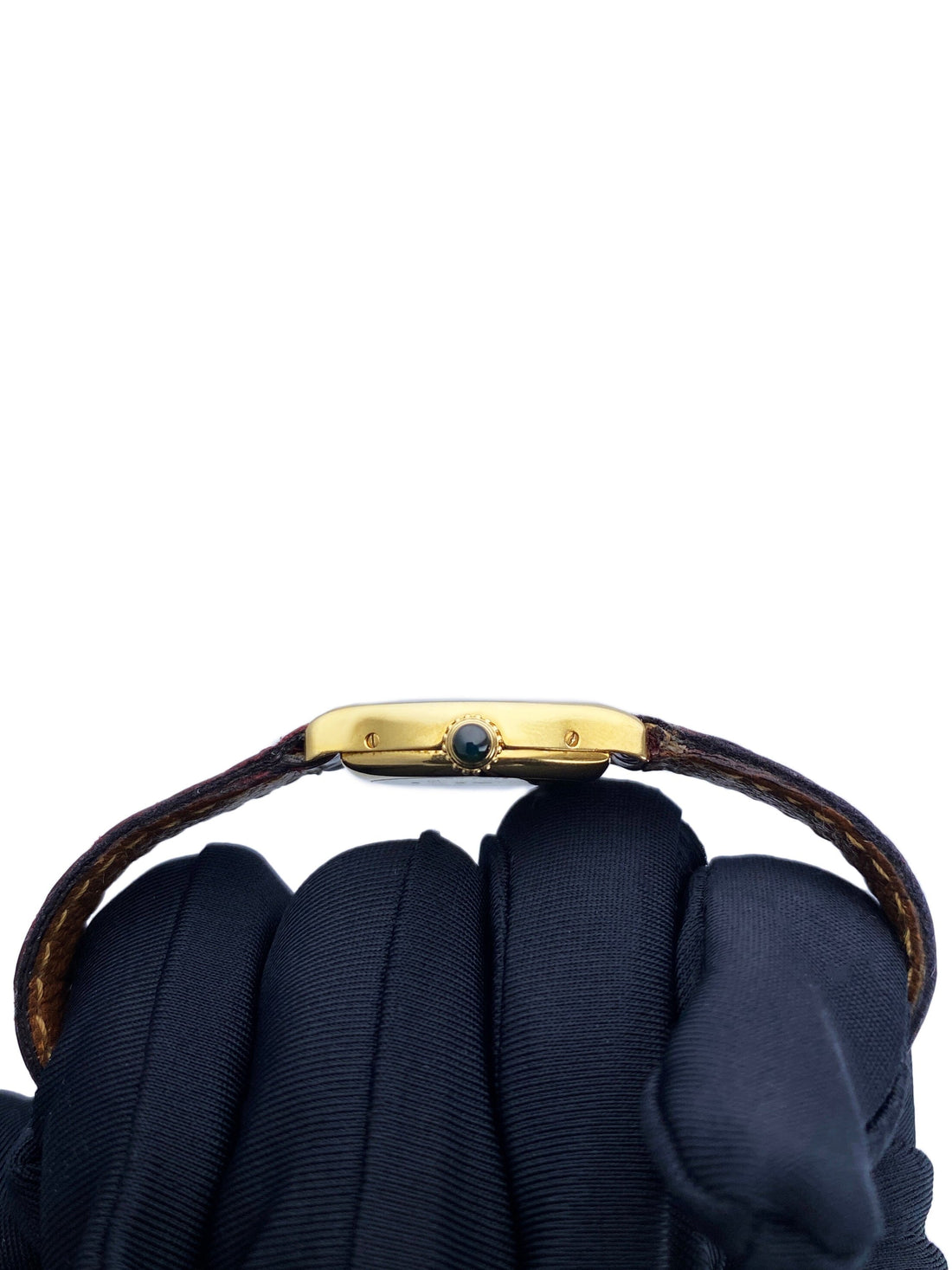 Cartier Paris 7824 Ladies Watch. 22mm 18K yellow gold case. White dial with Blue steel hands and Roman numeral hour markers. Minute markers on the outer dial. Brown leather strap with 18K yellow gold buckle. Will fit up to a 6-Inch wrist. Acrylic crystal. 18K yellow gold case back. Mechanical hand-winding movement.