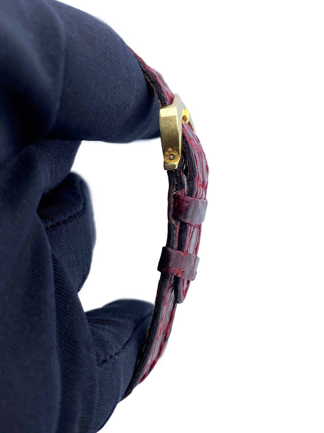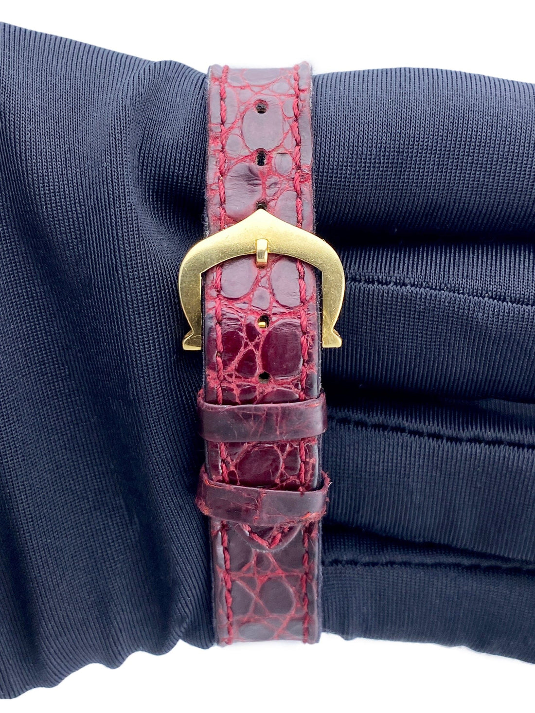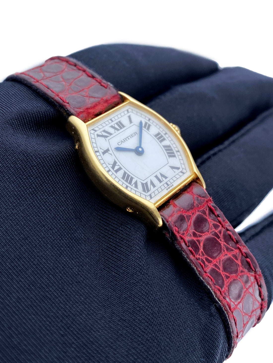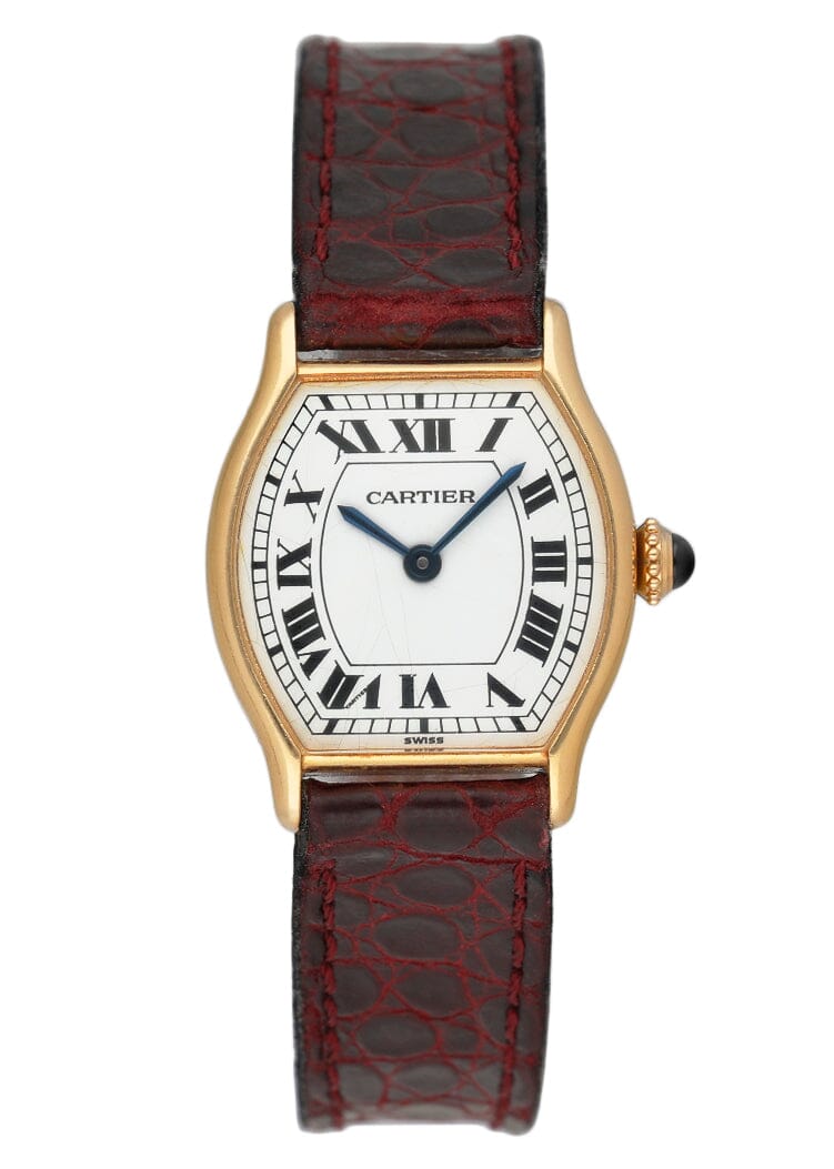 Cartier Paris 7824 Ladies Watch. 22mm 18K yellow gold case. White dial with Blue steel hands and Roman numeral hour markers. Minute markers on the outer dial. Brown leather strap with 18K yellow gold buckle. Will fit up to a 6-Inch wrist. Acrylic crystal. 18K yellow gold case back. Mechanical hand-winding movement.