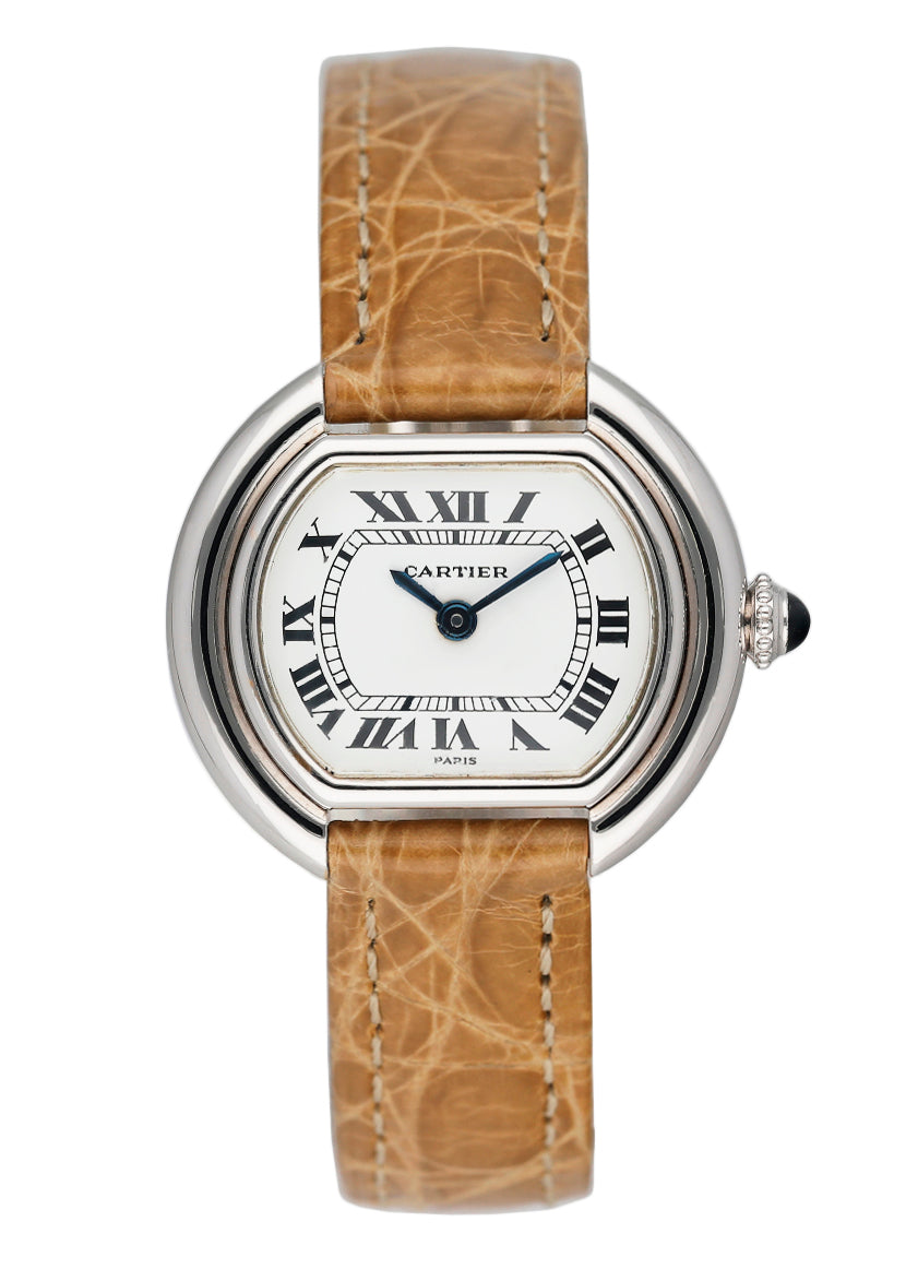 Cartier Paris Ellipse Ladies Watch. 27mm 18K white gold case. 18K white gold bezel. White dial with blue hands and Roman numeral hour marker. Minute marker on the inner dial. Camel leather strap with 18K yellow gold deployment Clasp. Will fit up to a 5.75-inch wrist. Sapphire crystal.18K white gold case back. Mechanical hand-winding movement.