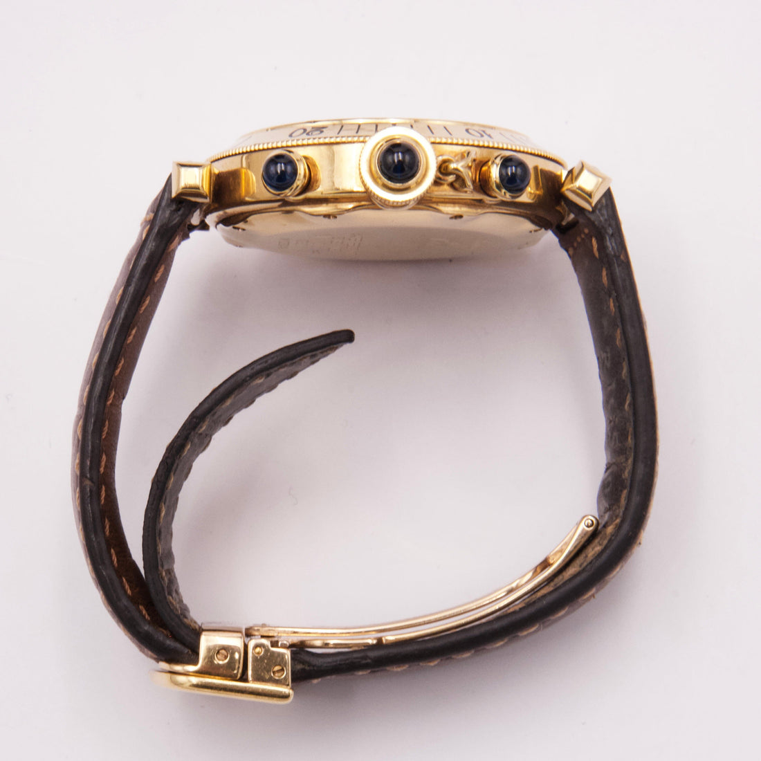 Cartier Pasha W3003551 / 0960 Mens Watch. 38mm 18K yellow gold case. 18K yellow gold bezel. Blue dial with blue hands and Roman numeral hour markers. Three sub-dials. Small seconds hand at 6 o'clock. 30-minute counter at 9 o'clock. 12-hour counter at 3 o'clock. The date is displayed at 6 o'clock position. Brown aftermarket leather strap with deployment clasp. Will fit up to a 6.5-Inch wrist. Sapphire crystal. 18K yellow gold case back. Quartz: battery movement.