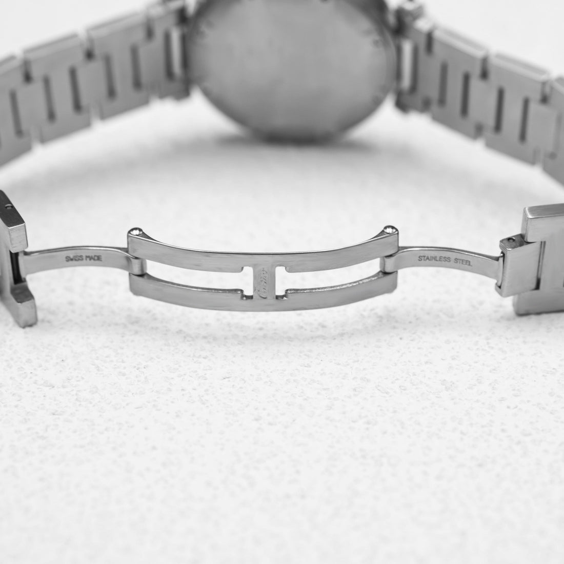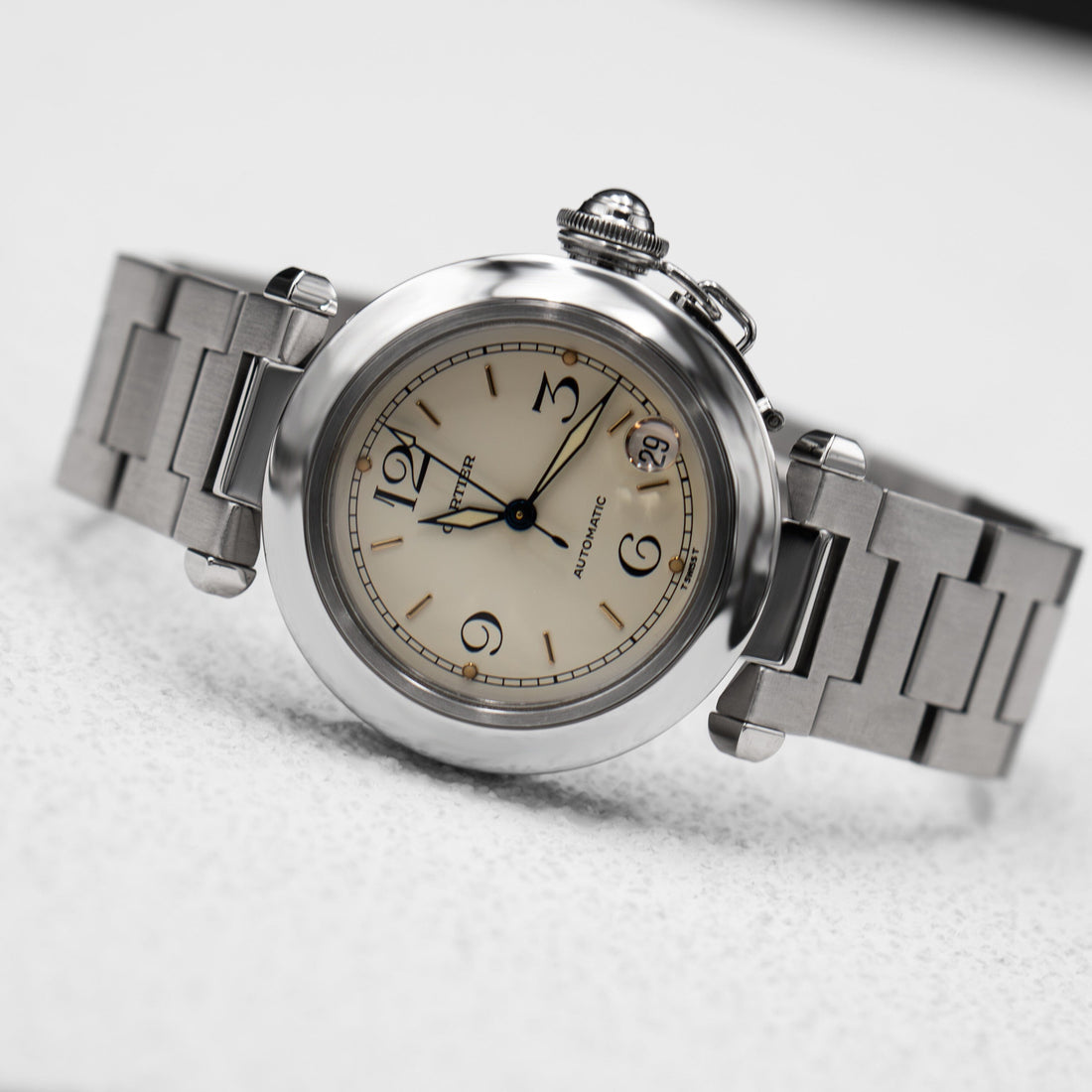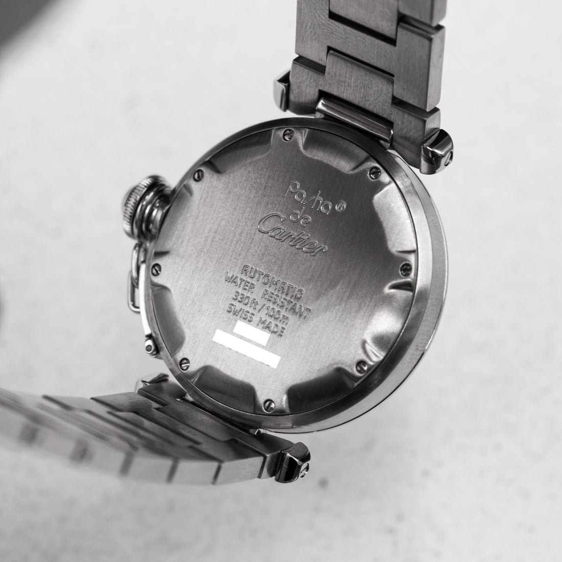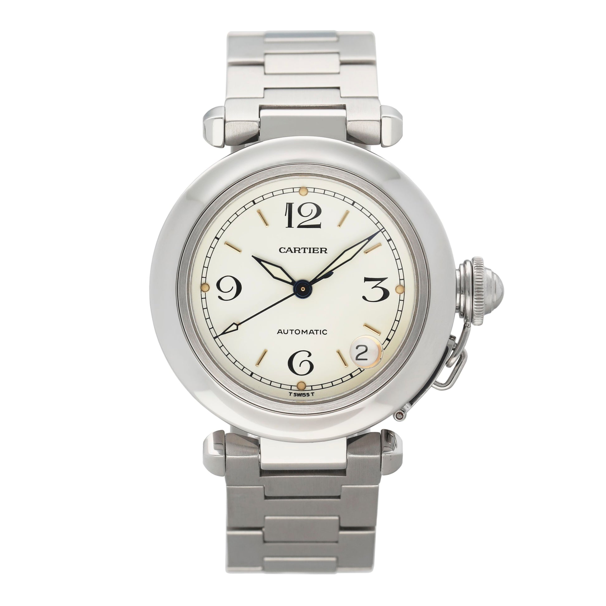 Cartier Pasha W31015M7 / 2324 Watch. 35mm stainless steel case. Stainless steel smooth bezel. Off-White dial with blue hands and Arabic numeral & index hour markers. Minute markers on the outer dial. Date display between 4 and 5 o'clock position. Stainless steel bracelet with hidden butterfly clasp. Will fit up to a 6.5-Inch wrist. Sapphire crystal. Stainless steel case back. Automatic self-winding movement.