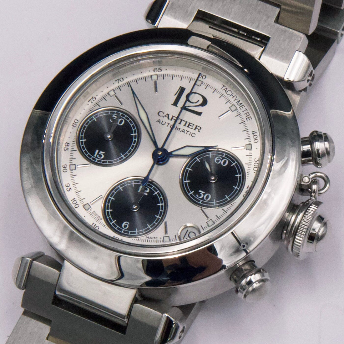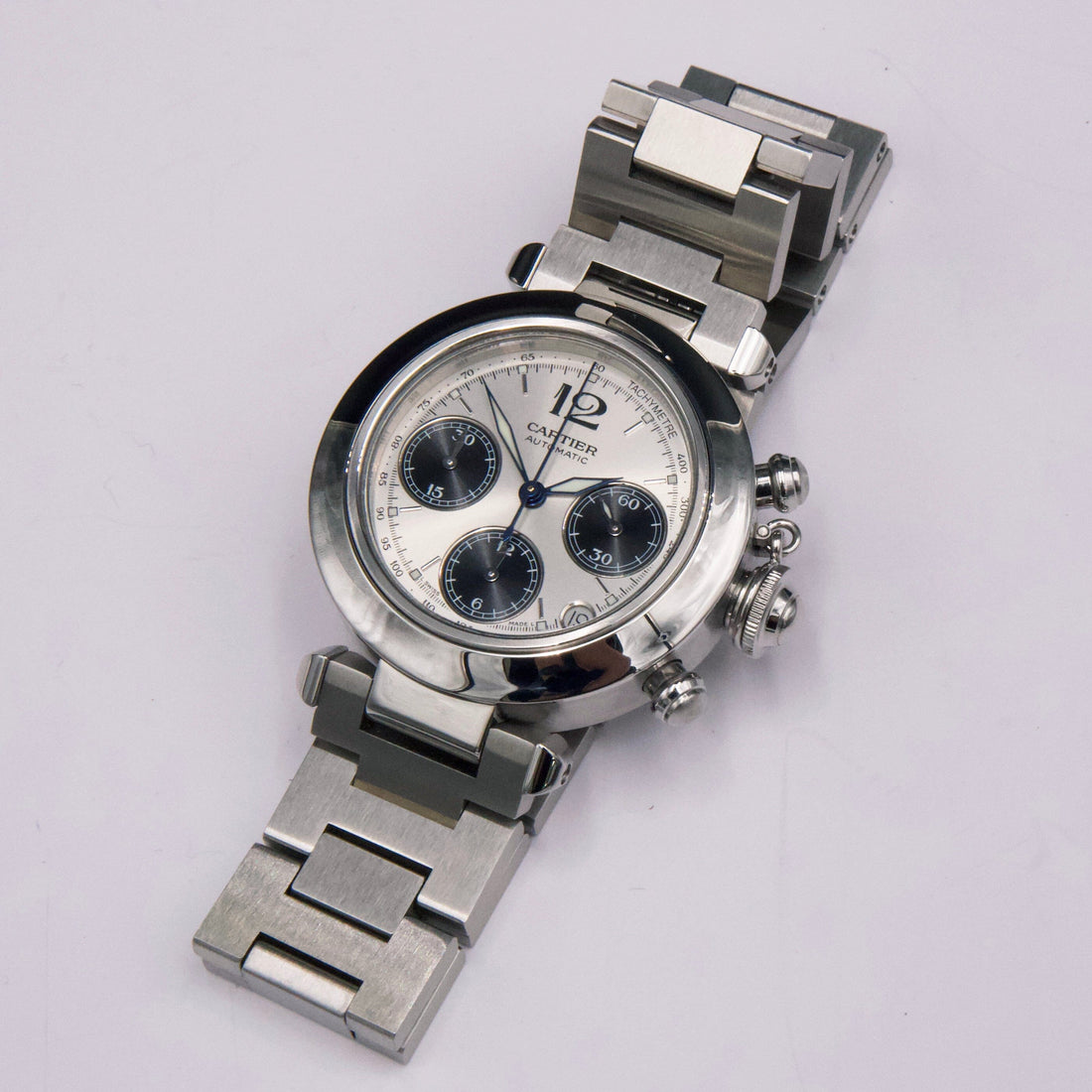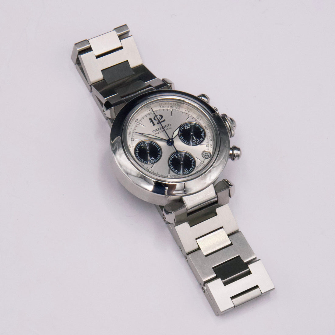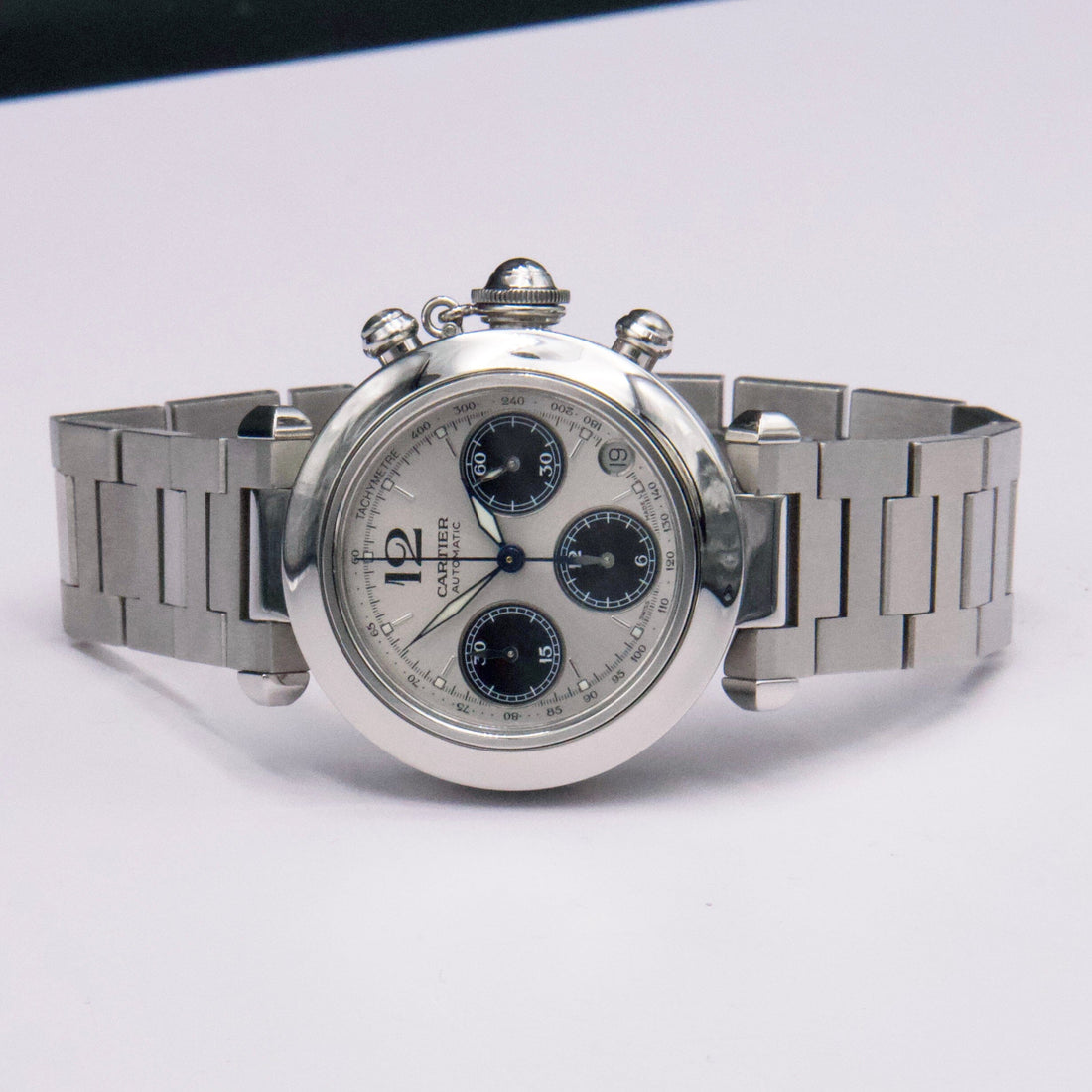 Cartier Pasha W31048M7 / 2412 Mens Watch. 36mm stainless steel case. Stainless steel bezel. Silver dial with blue steel hands and Arabic numeral & index hour markers. Three black sub-dials. Small seconds hand at 3 o'clock. 30-minute counter at 9 o'clock. 12-hour counter at 6 o'clock. Minute markers on the outer dial. The date is displayed between 4 & 5 o'clock. Stainless steel bracelet with hidden butterfly clasp. Will fit up to a 7-inch wrist. Sapphire crystal. Stainless steel case back. Automatic self-winding movement.