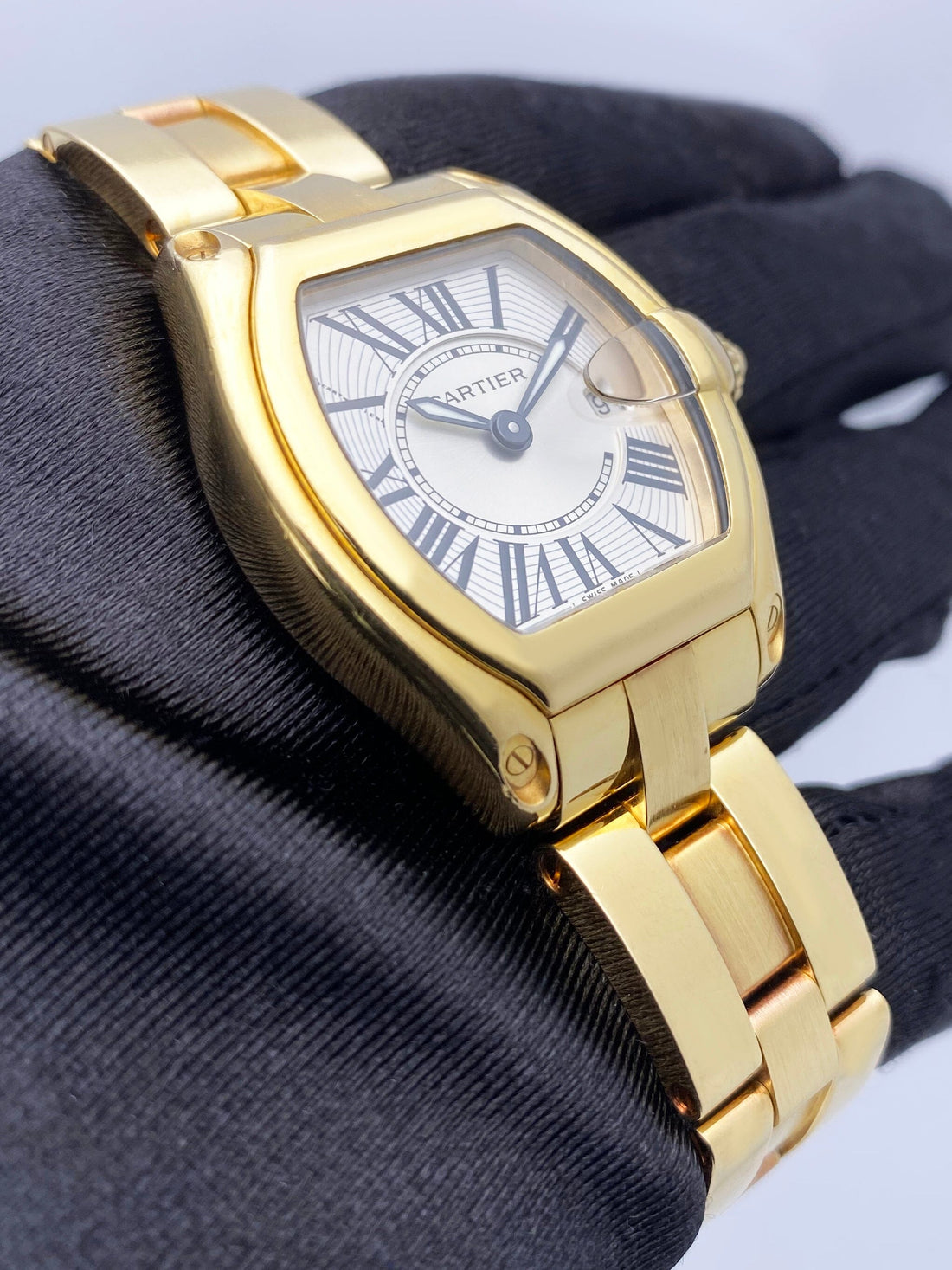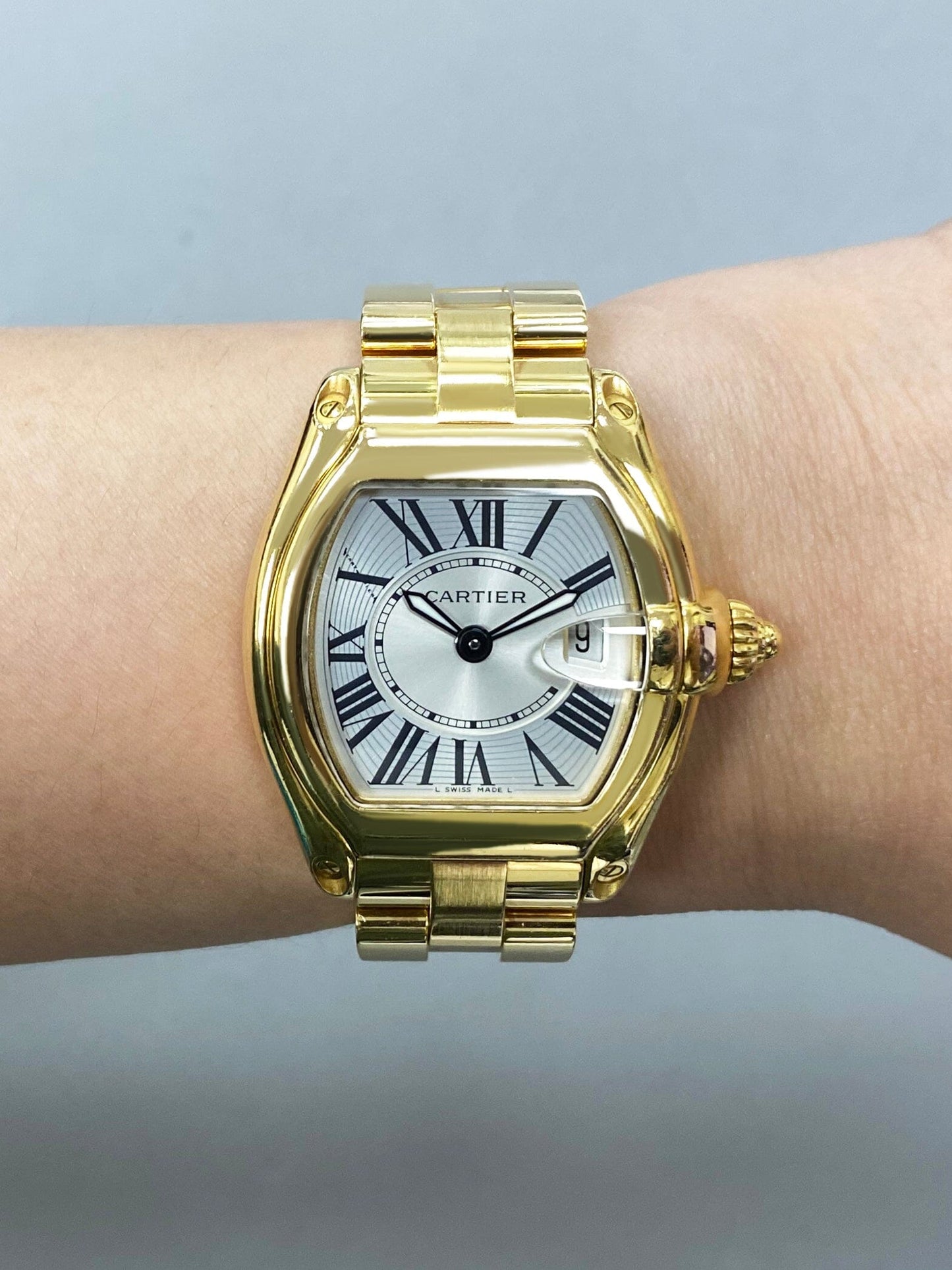 Cartier Roadster W62018Y5 / 2676 Ladies Watch. 31mm 18K yellow gold case. 18K yellow gold smoothed bezel. Silver dial with luminous hands and black Roman numeral markers. Date display at the 3 o'clock position. Minute marker on the inner dial. 18K yellow gold bracelet with a hidden butterfly clasp. Will fit up to a 6-inch wrist. Sapphire crystal. Quartz: battery movement.