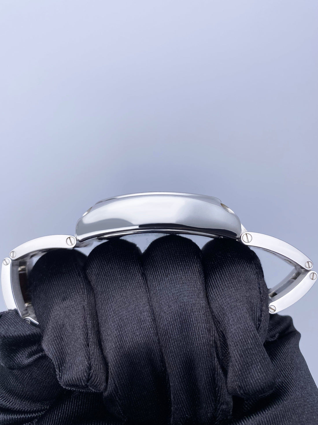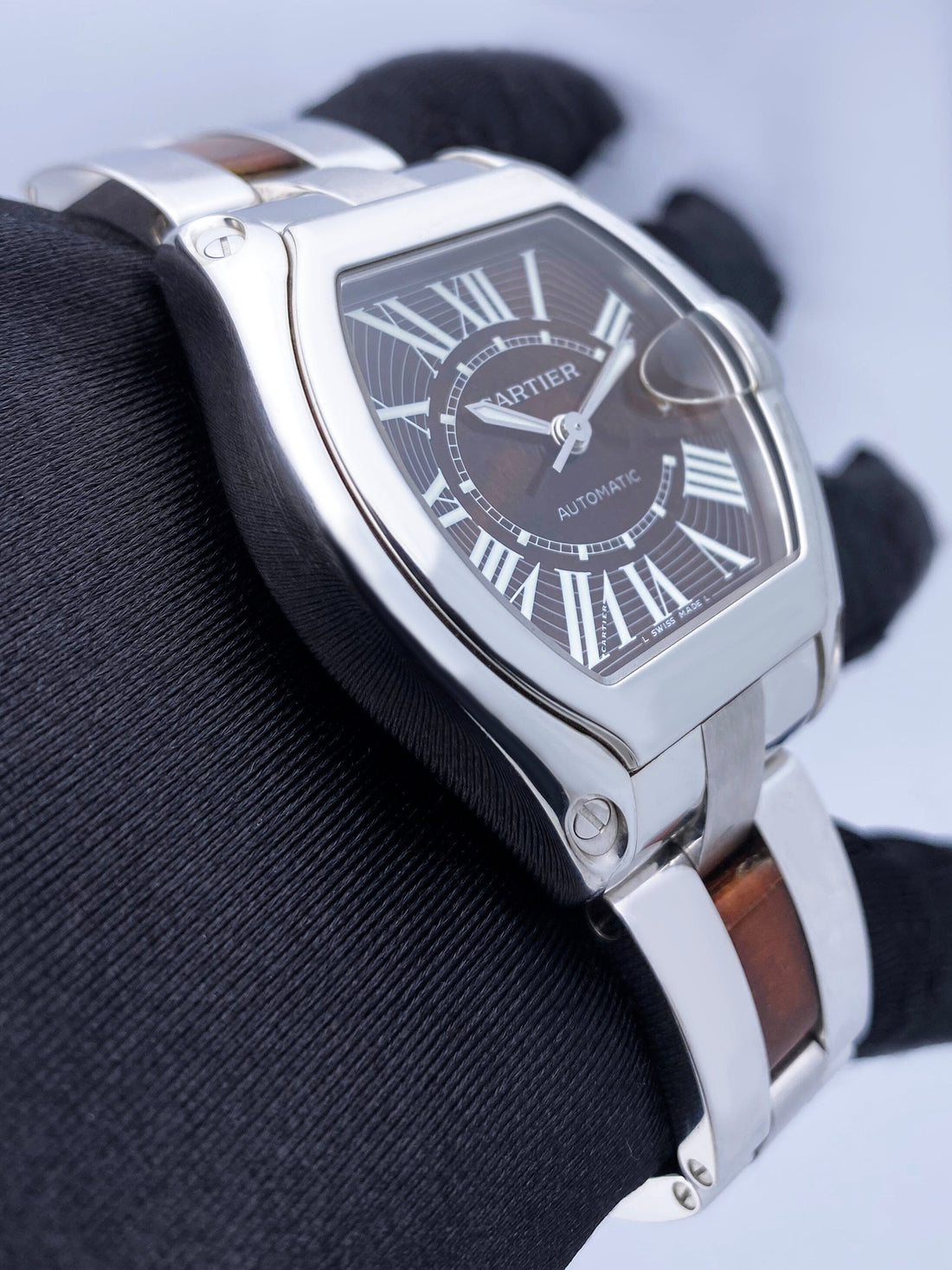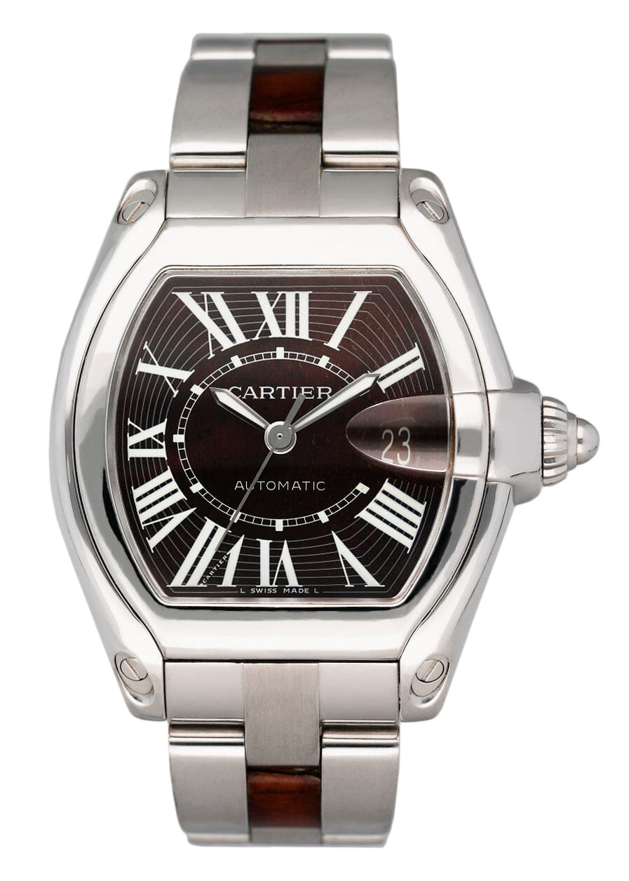 Cartier Roadster XL W6206000 / 3102 Mens Watch. 43mm 18K white gold case. 18K white gold fixed bezel. Wood dial with silver-tone luminous hands and Roman numerals hour markers. Minute marker in the inner dial. Magnified date display at the 3 o'clock position. 18K white gold & Wood bracelet with hidden butterfly clasp. Will fit up to a 7.5-inch wrist. Sapphire crystal. 18K white gold case back. Automatic self-winding movement.