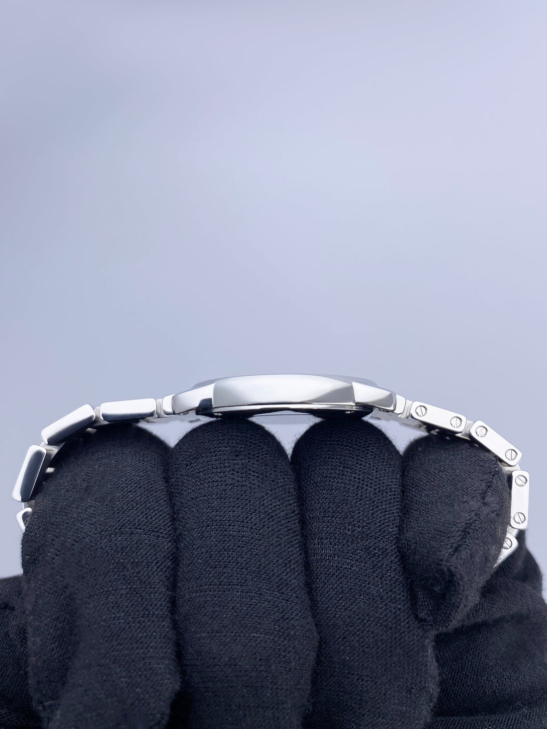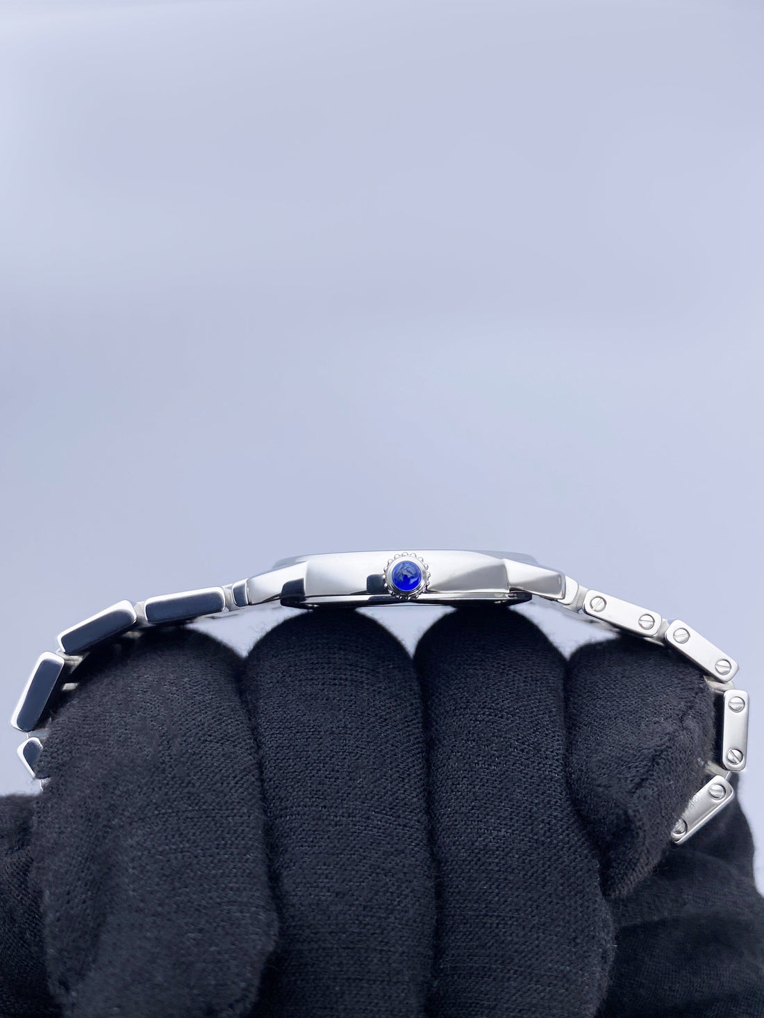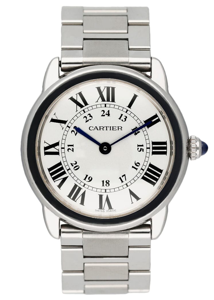 Cartier Ronde Solo W6701004 Ladies Watch. 29mm stainless steel case. Stainless Steel smoothed bezel. Silver dial with blue steel hands and Roman numeral hour markers. Minute markers on the inner dial. Stainless steel bracelet with hidden butterfly clasp. Will fit up to a 6-inch wrist. Sapphire crystal. Stainless steel case back. Quartz: Battery powered movement.