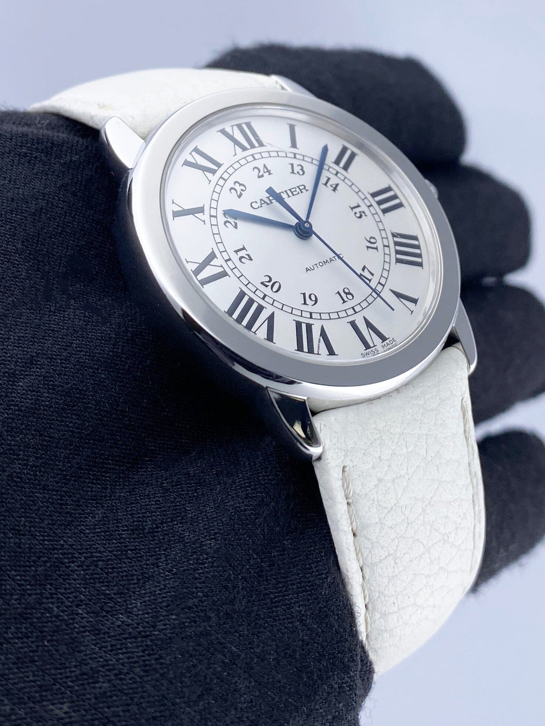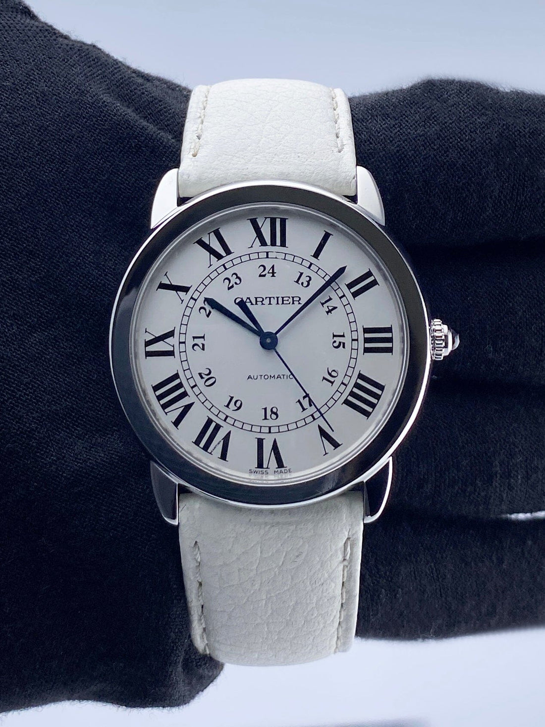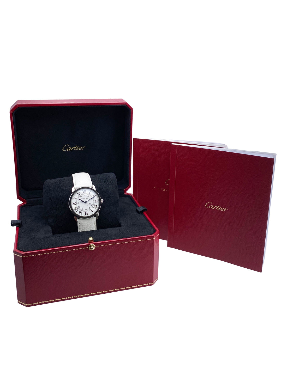 Cartier Ronde Solo WSRN0021 Mens Watch. 36mm stainless steel case. Stainless Steel smoothed bezel. Silver dial with blue steel hands and Roman numeral hour markers. Minute markers on the inner dial. White Cartier leather strap with deployment clasp. Will fit up to a 7.5-inch wrist. Sapphire crystal. Stainless steel case back. Automatic self-winding movement. This watch comes with original Box and Papers.