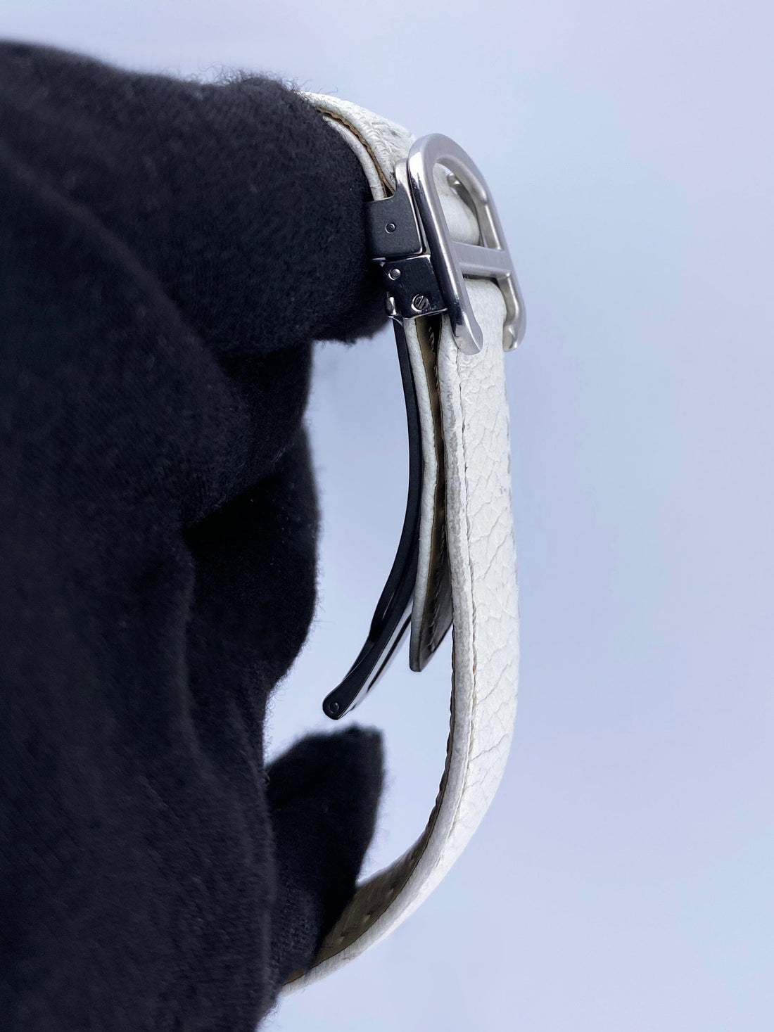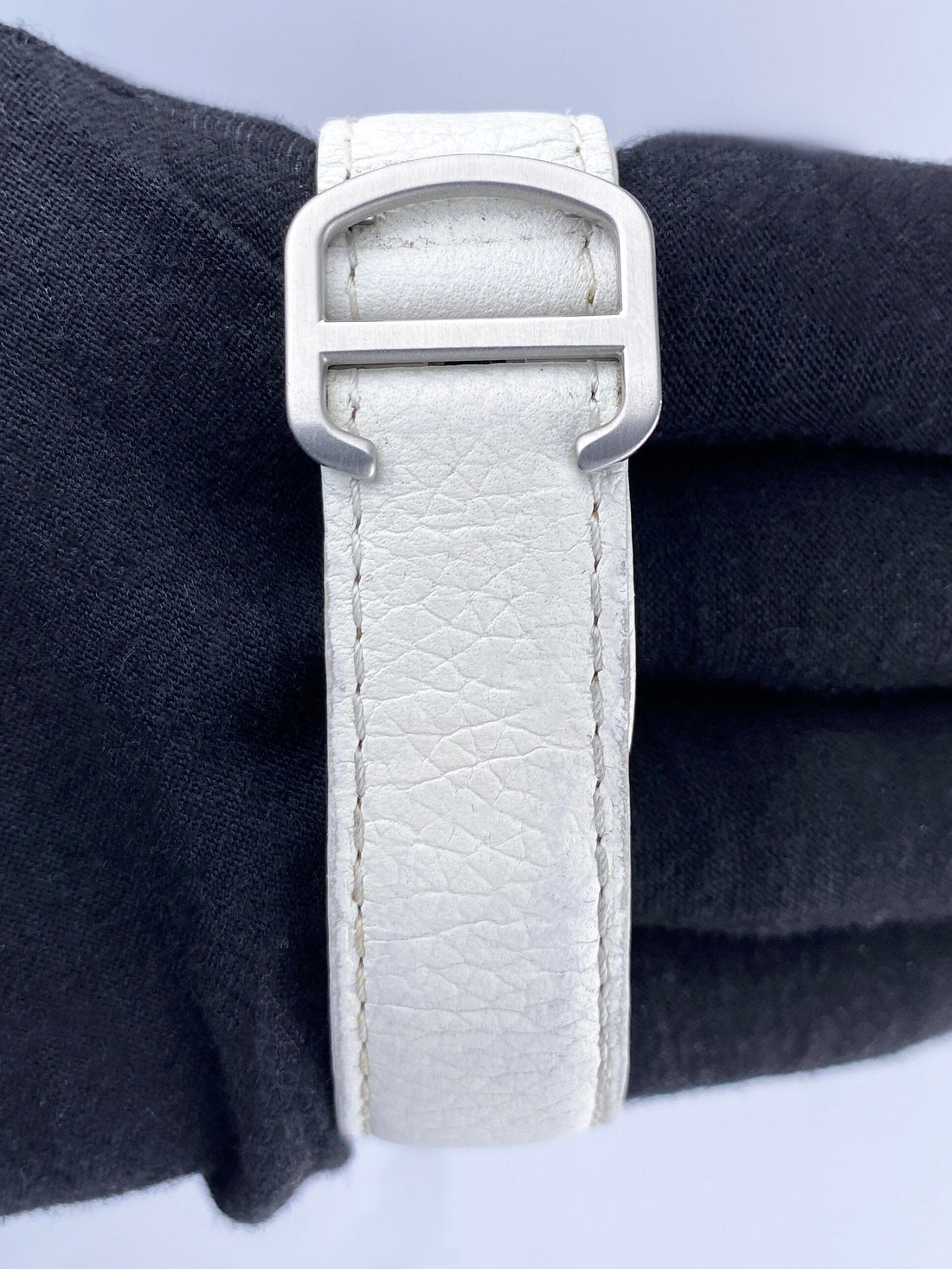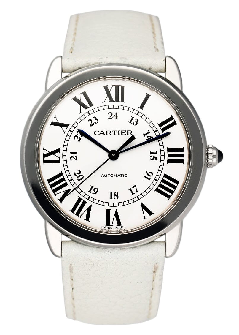 Cartier Ronde Solo WSRN0021 Mens Watch. 36mm stainless steel case. Stainless Steel smoothed bezel. Silver dial with blue steel hands and Roman numeral hour markers. Minute markers on the inner dial. White Cartier leather strap with deployment clasp. Will fit up to a 7.5-inch wrist. Sapphire crystal. Stainless steel case back. Automatic self-winding movement. This watch comes with original Box and Papers.
