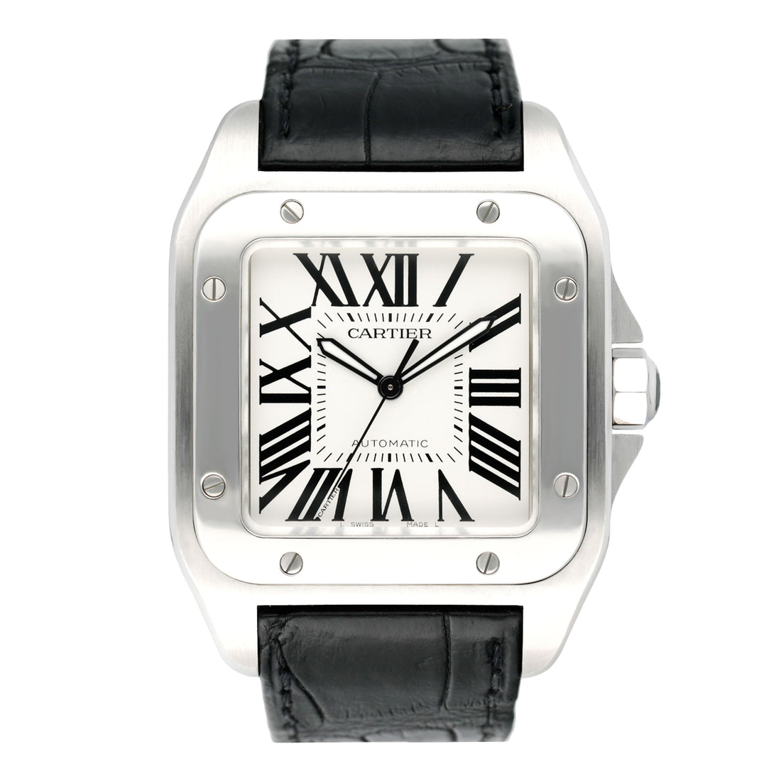 Cartier Santos-100 W20073X8 / 2656 Mens Watch. 38mm stainless steel case with stainless steel fixed bezel. Silver dial with black steel luminous hands and black Roman numeral hour markers. Minute markers on the inner dial. Will fit up to a 7.5-inch wrist. Black leather strap with fold over clasp with hidden double push button. Sapphire crystal. Automatic self-winding movement.