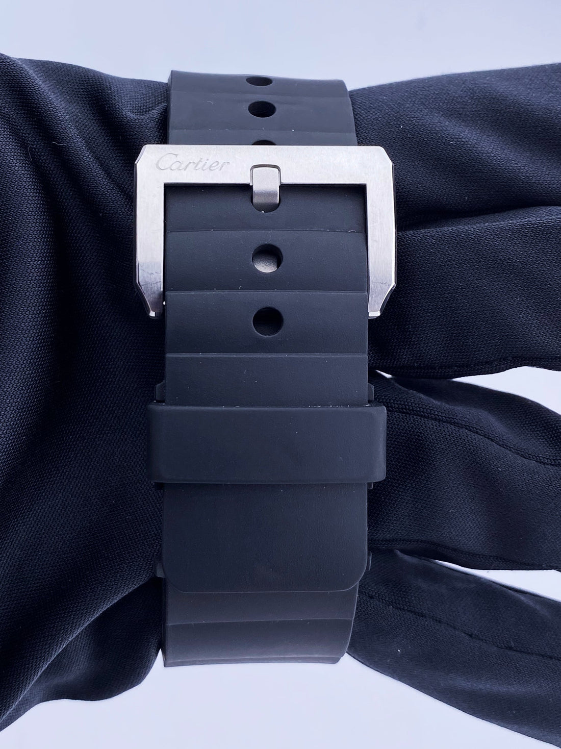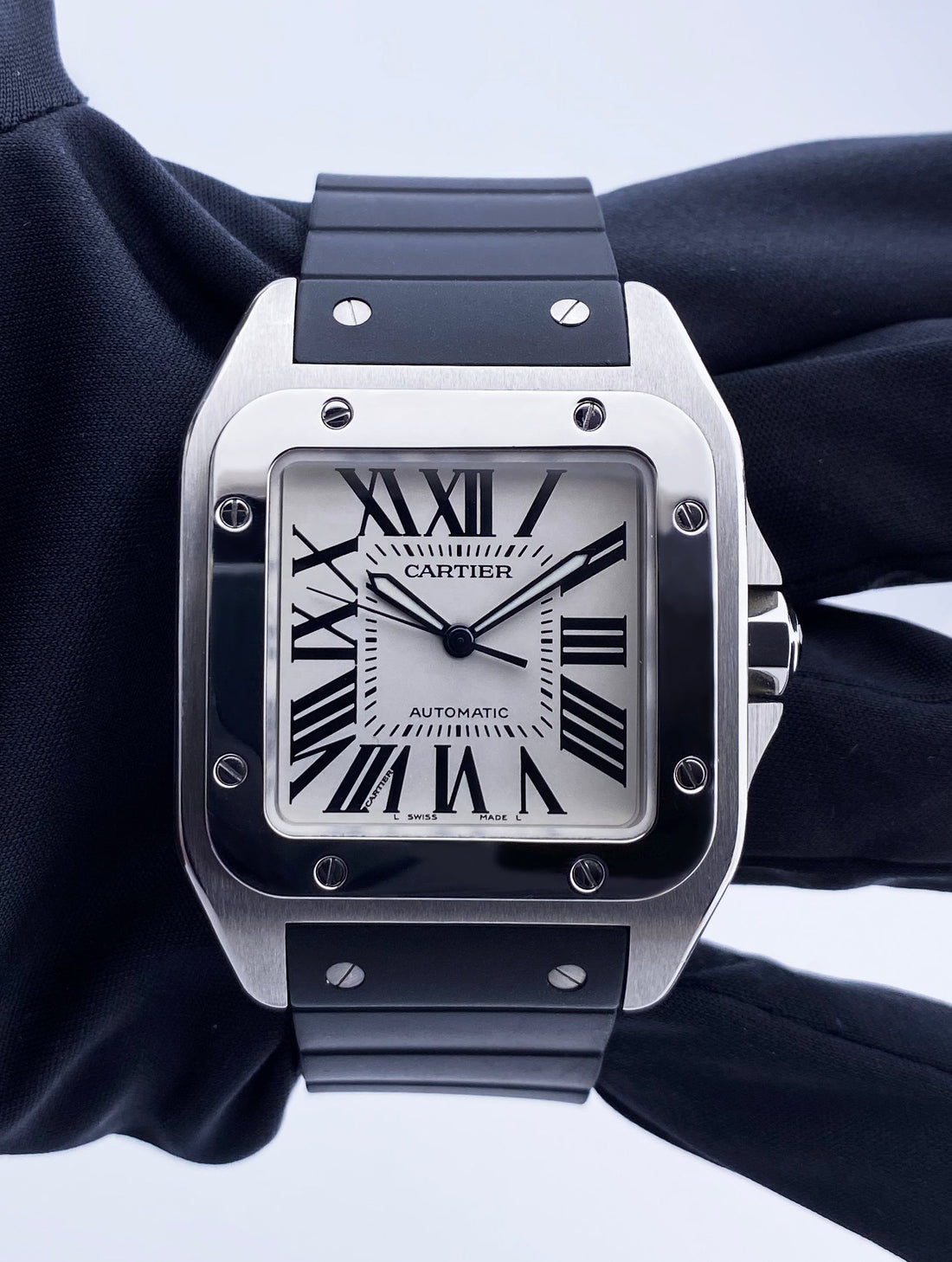 Cartier Santos 100 W20073X8 Mens Watch. 38mm stainless steel case with stainless steel fixed bezel. Silver dial with black steel luminous hands and black Roman numeral hour markers. Minute markers on the inner dial. Black rubber strap with buckle. Will fit up to a 7-inch wrist. Extra black leather strap with fold over clasp with hidden double push button. Sapphire crystal. Automatic self-winding movement. This watch comes with Box & papers. Circa: 2005.