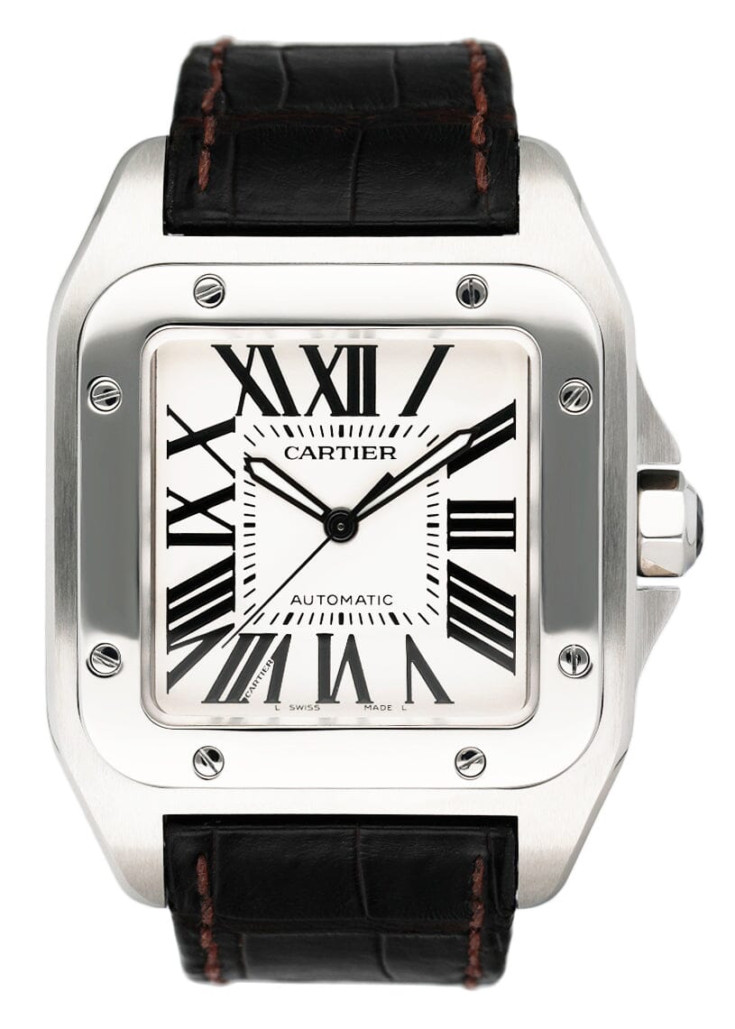 Cartier Santos 100 W20076X8 / 2656 Mens Watch. 38mm stainless steel case with stainless steel fixed bezel. Silver dial with black steel luminous hands and black Roman numeral hour markers. Minute markers on the inner dial. Will fit up to a 7.5-inch wrist. Brown leather strap with fold over clasp with hidden double push button. Sapphire crystal. Automatic self-winding movement. This watch comes with original Box and Papers.