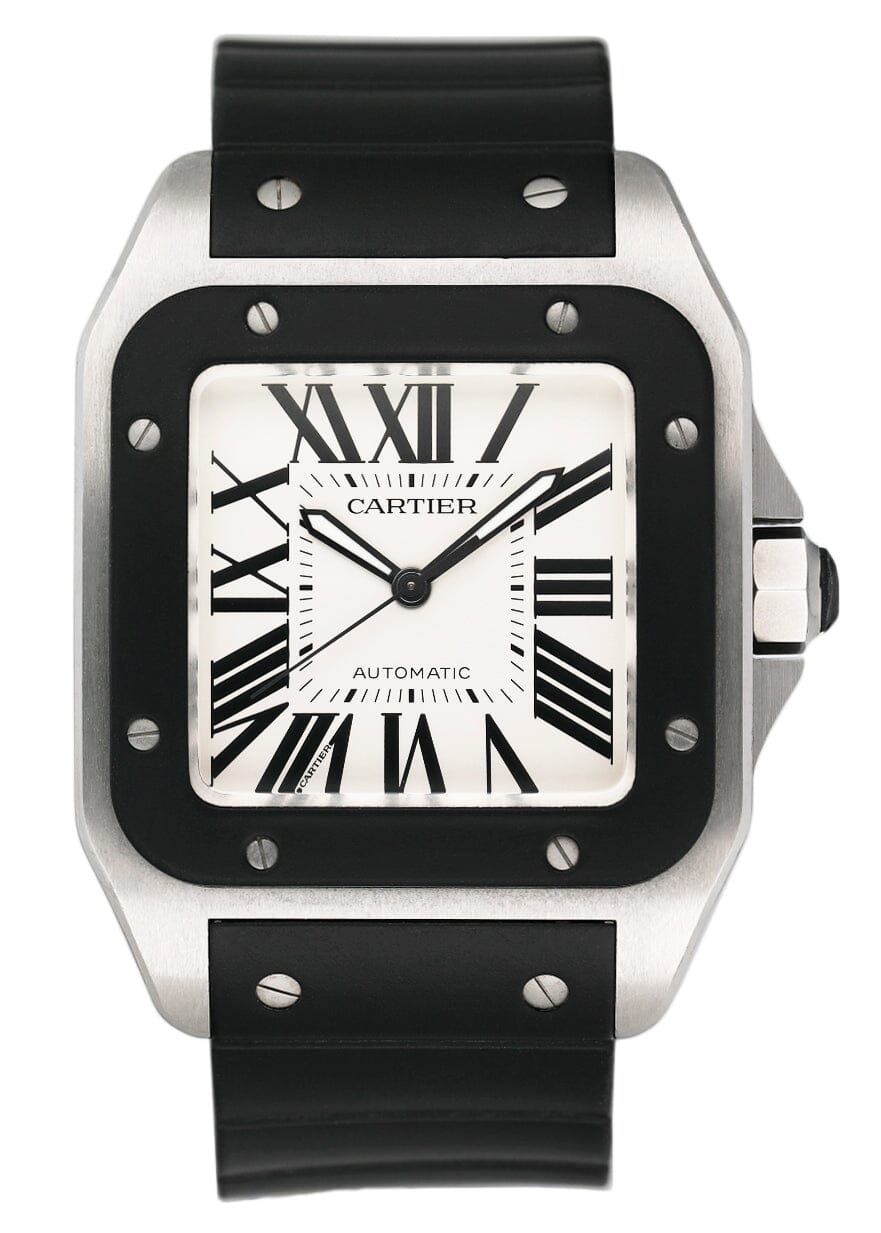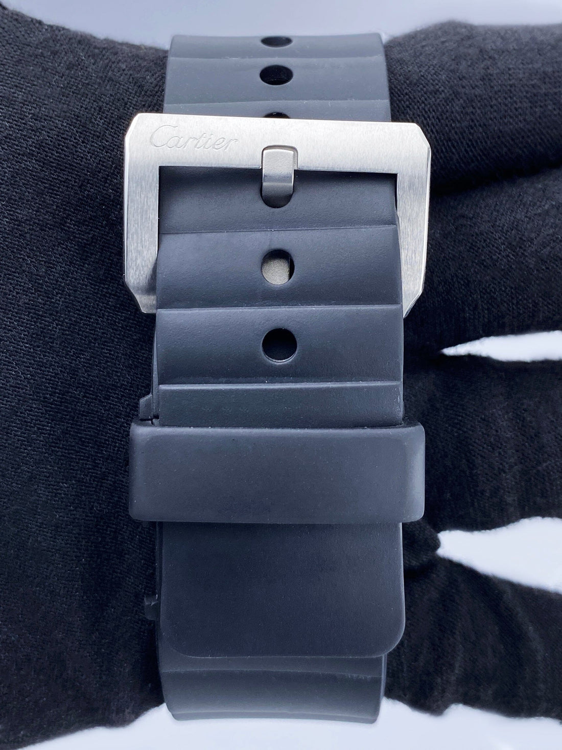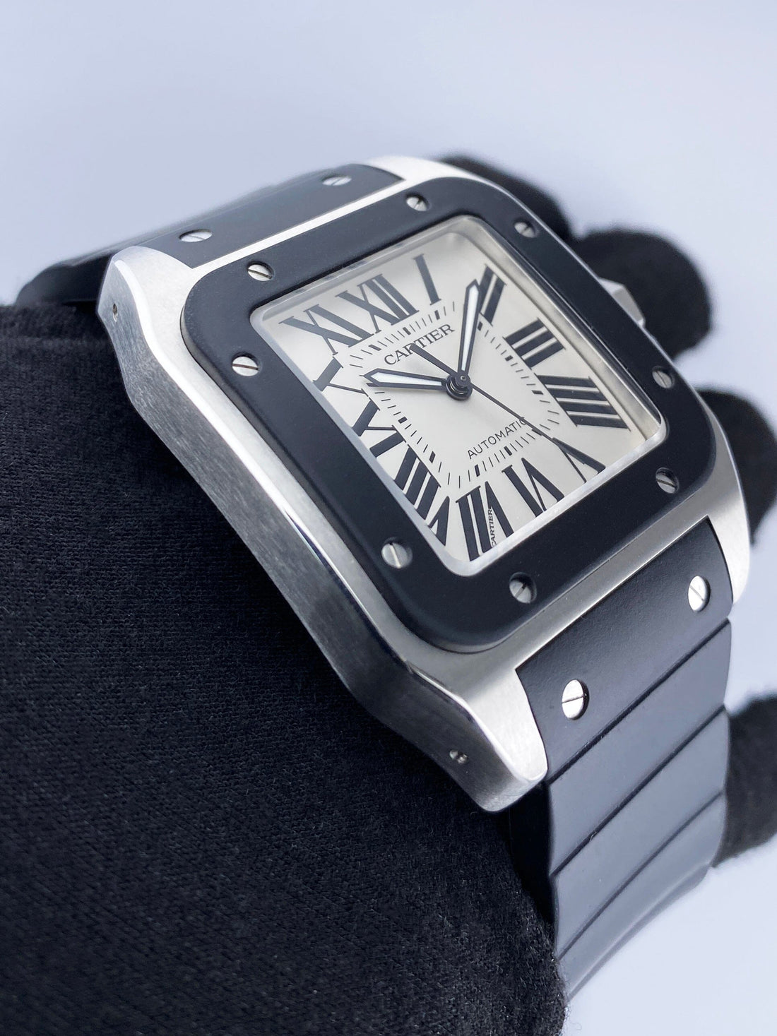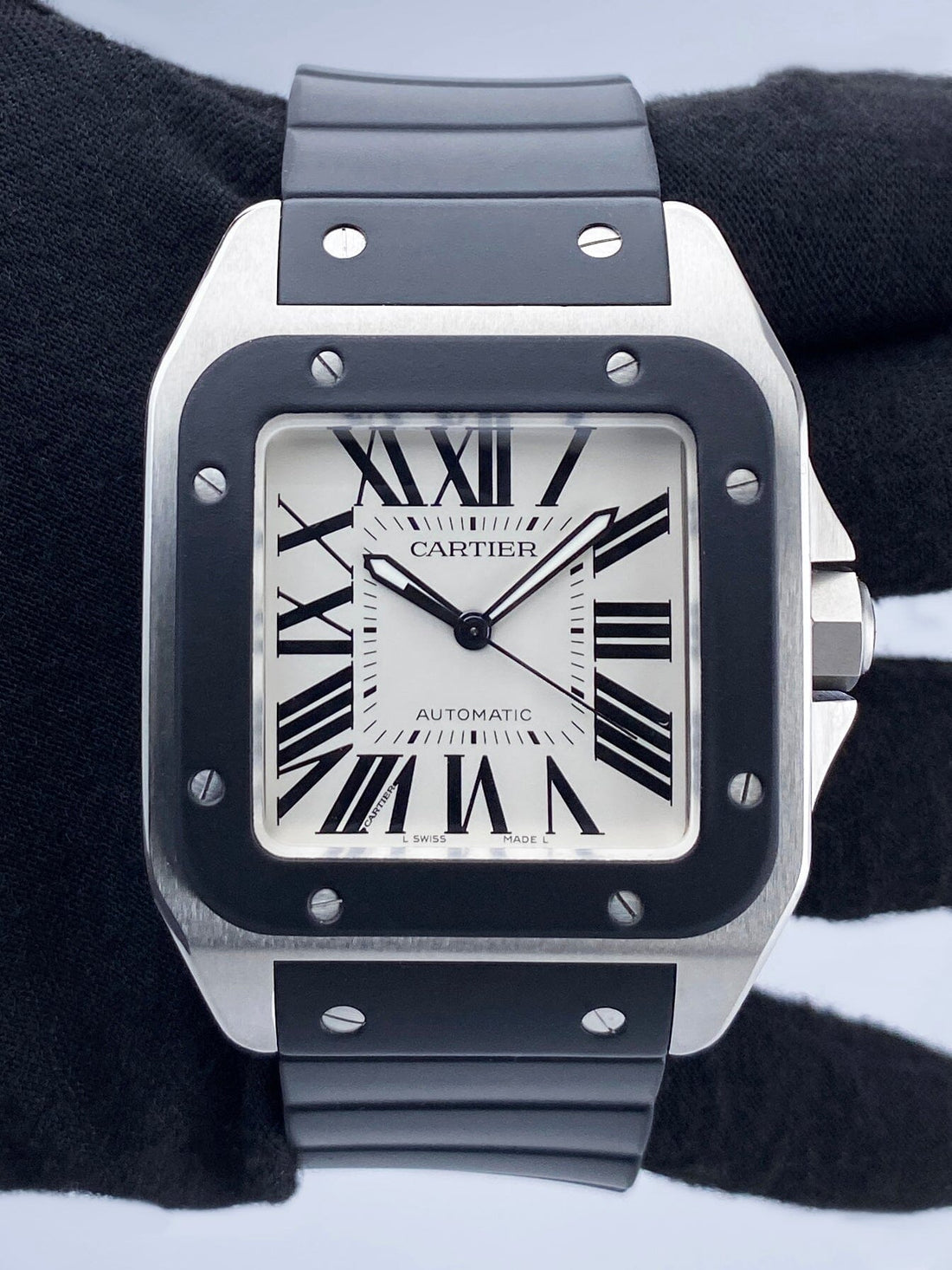 Cartier Santos 100 W20121U2 / 2656 Mens Watch. 38mm stainless steel case. Black rubber bezel. Silver dial with black steel luminous hands and black Roman numeral hour markers. Minute markers on the inner dial. Will fit up to a7.5-inch wrist.Black rubber strap with stainless steel buckle. Sapphire crystal. Automatic self-winding movement. This watch comes with original Box and Papers.