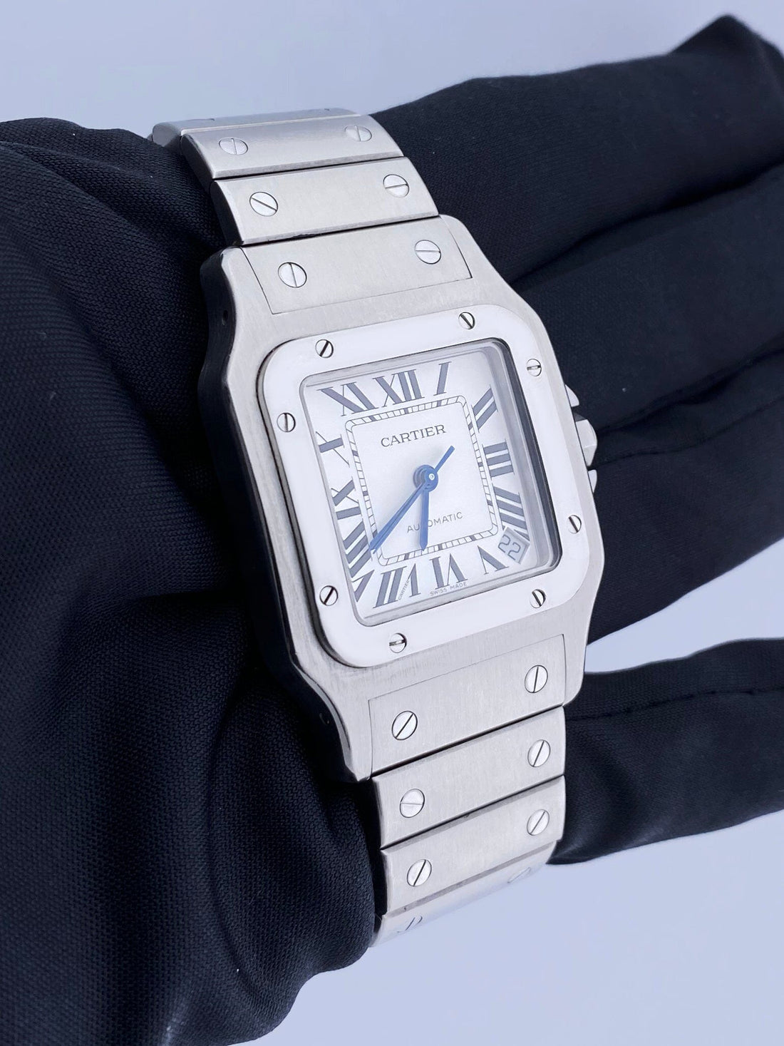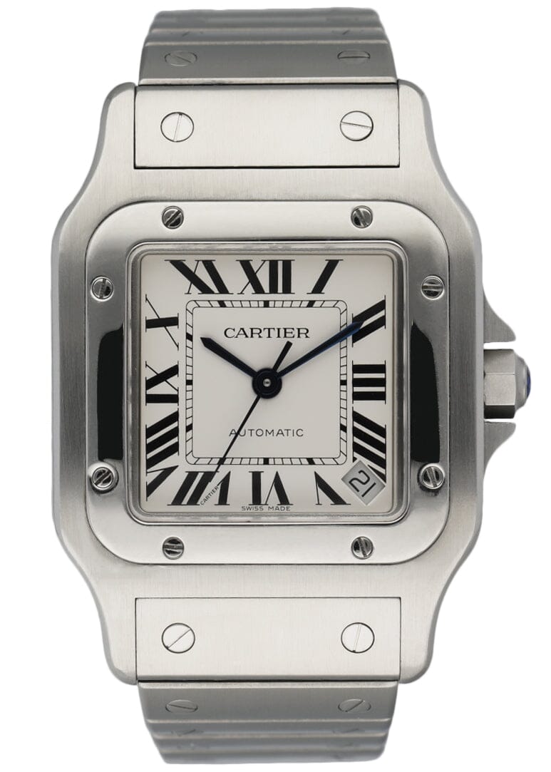 Cartier Santos 2823 Men's Watch. 34.5mm stainless steel case and stainless steel bezel. White dial with blue steel hands Black Roman numeral hour markers. Minute markers around an inner dial. Date display between 4 and 5 o'clock position. Stainless steel bracelet with hidden clasp. Will fit up to a 6.25-inch wrist. Automatic self-winding movement. Sapphire crystal. Stainless steel case back.
