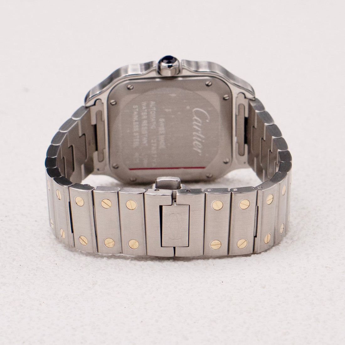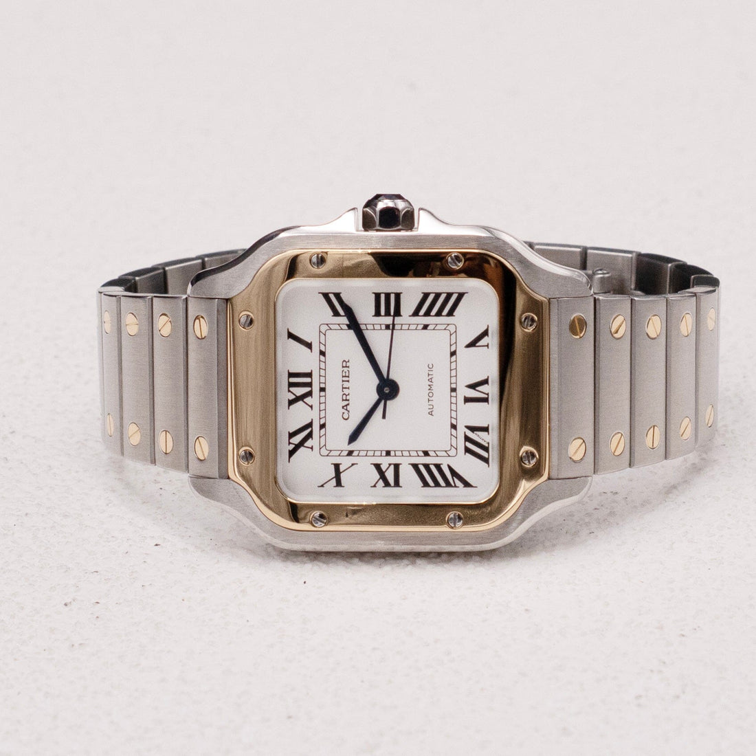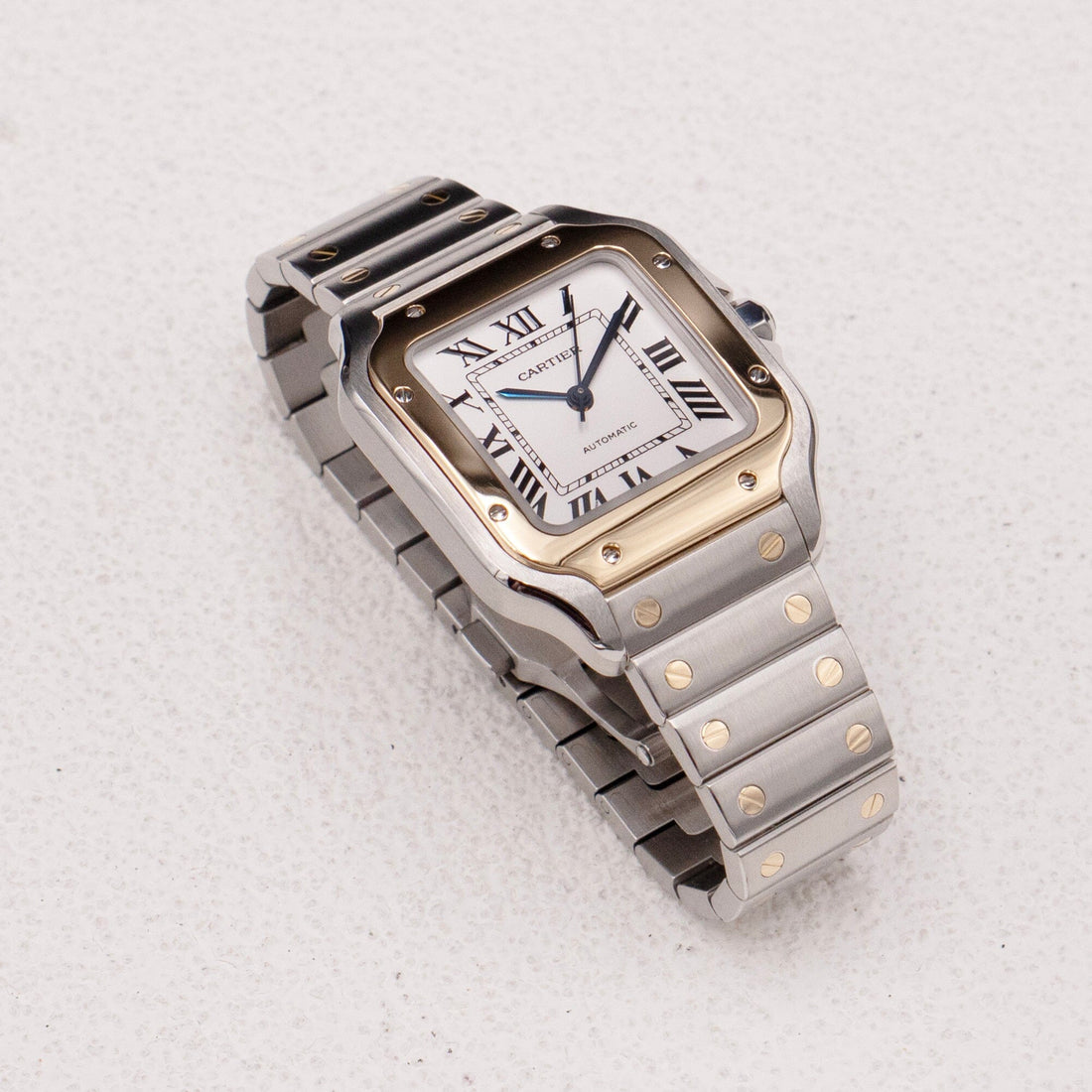 Cartier SantosDe Cartier W2SA0007 / 4075 Ladies Watch. 35mm stainless steel case with 18K yellow gold fixed bezel. Silver dial with blue steel hands and black Roman numeral hour markers. Minute markers on the inner dial. Will fit up to a 6-inch wrist. Stainless steel & 18K yellow gold bracelet with fold over clasp with hidden double push button. Sapphire crystal. Stainless steel case back. Automatic self-winding movement. This watch comes with original Box and Papers.