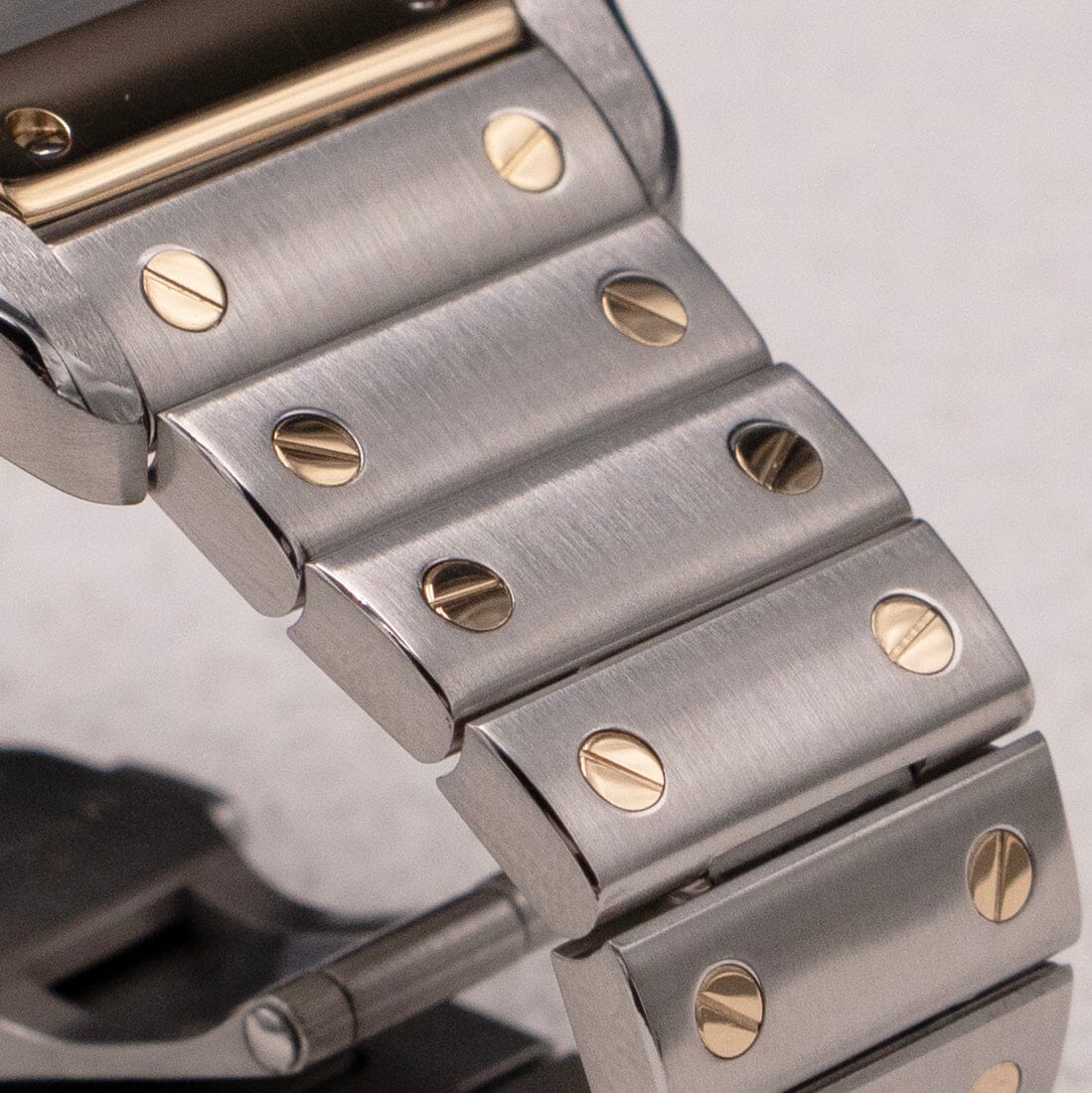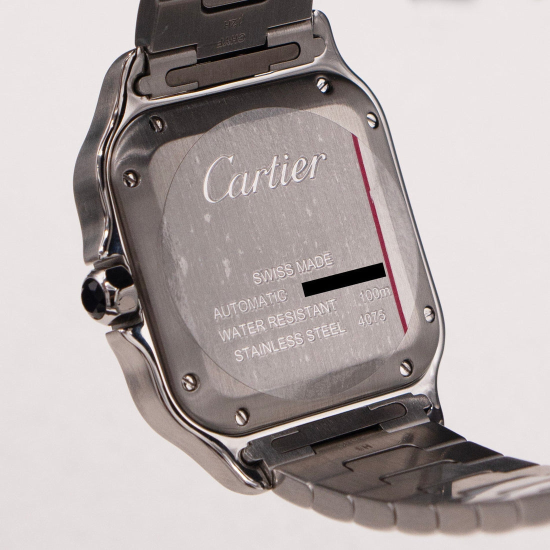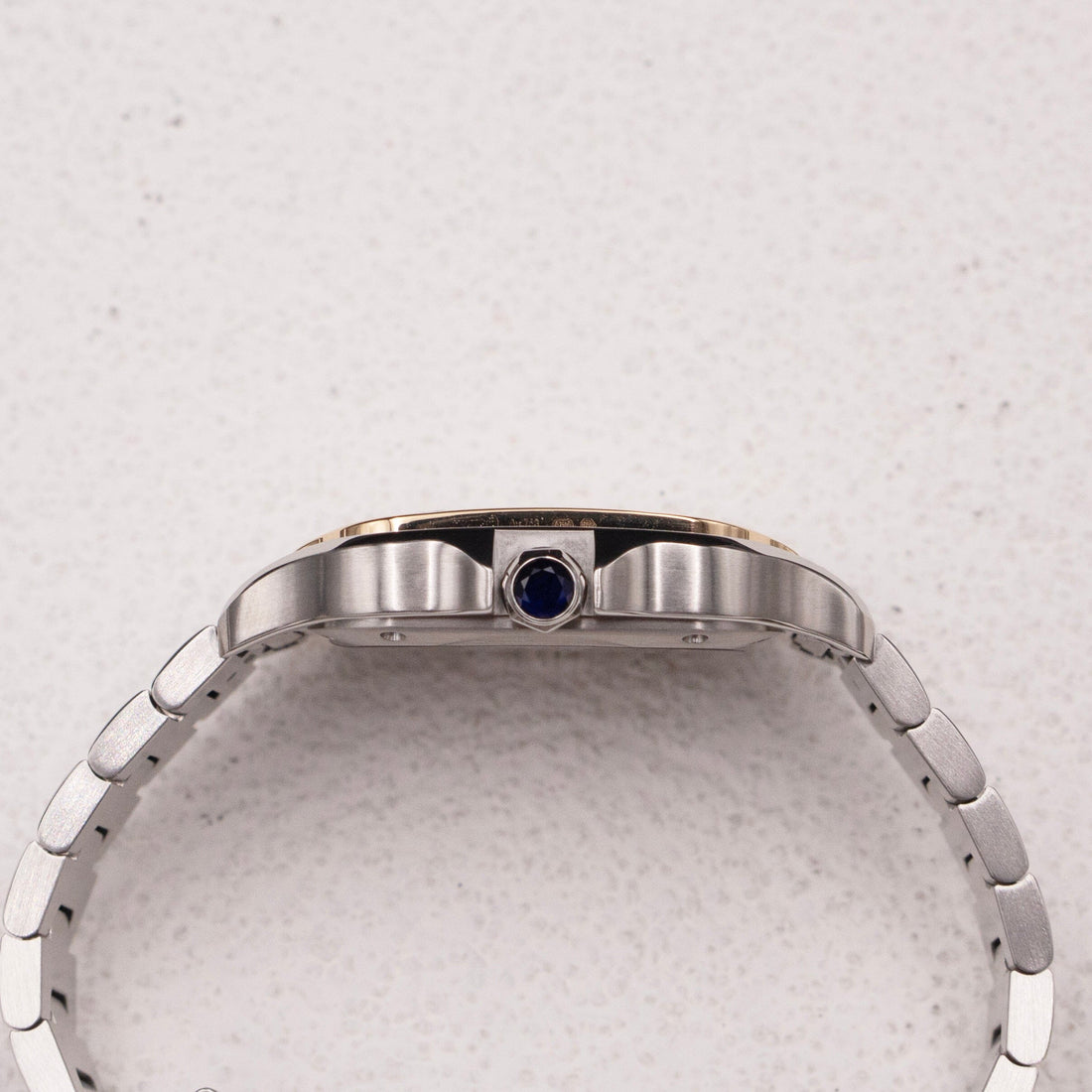 Cartier SantosDe Cartier W2SA0007 / 4075 Ladies Watch. 35mm stainless steel case with 18K yellow gold fixed bezel. Silver dial with blue steel hands and black Roman numeral hour markers. Minute markers on the inner dial. Will fit up to a 6-inch wrist. Stainless steel & 18K yellow gold bracelet with fold over clasp with hidden double push button. Sapphire crystal. Stainless steel case back. Automatic self-winding movement. This watch comes with original Box and Papers.