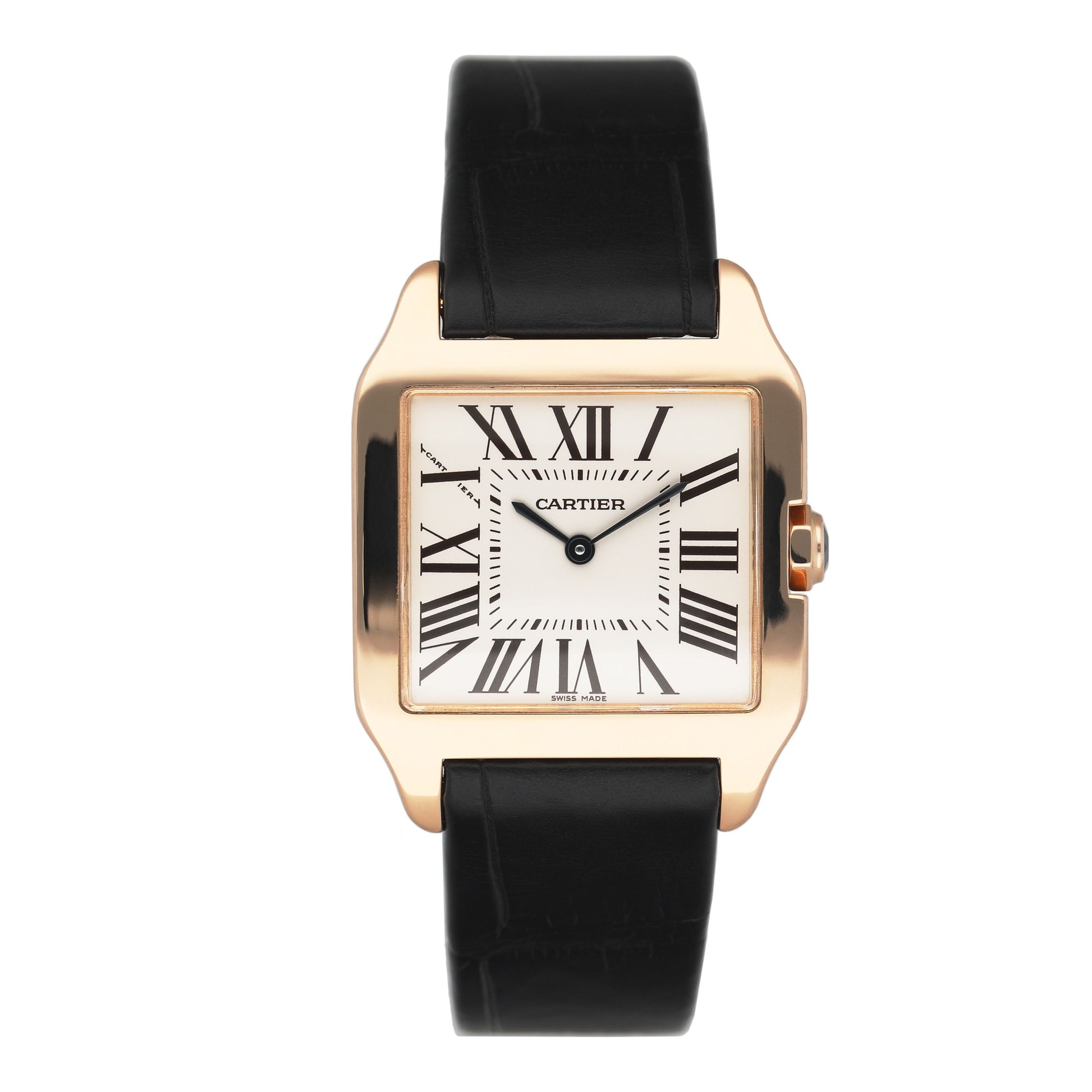 Cartier Santos Dumont W2009251 / 2788 Mens Watch. 30.5mm 18K rose gold case. Silver dial with black hands and black Roman numeral hour marker. Minute markers on the inner dial. Black leather strap with 18K rose gold deployment clasp. Will fit up to 7-Inch wrist. Sapphire crystal. 18K rose gold case back. Quartz: Battery powered movement.