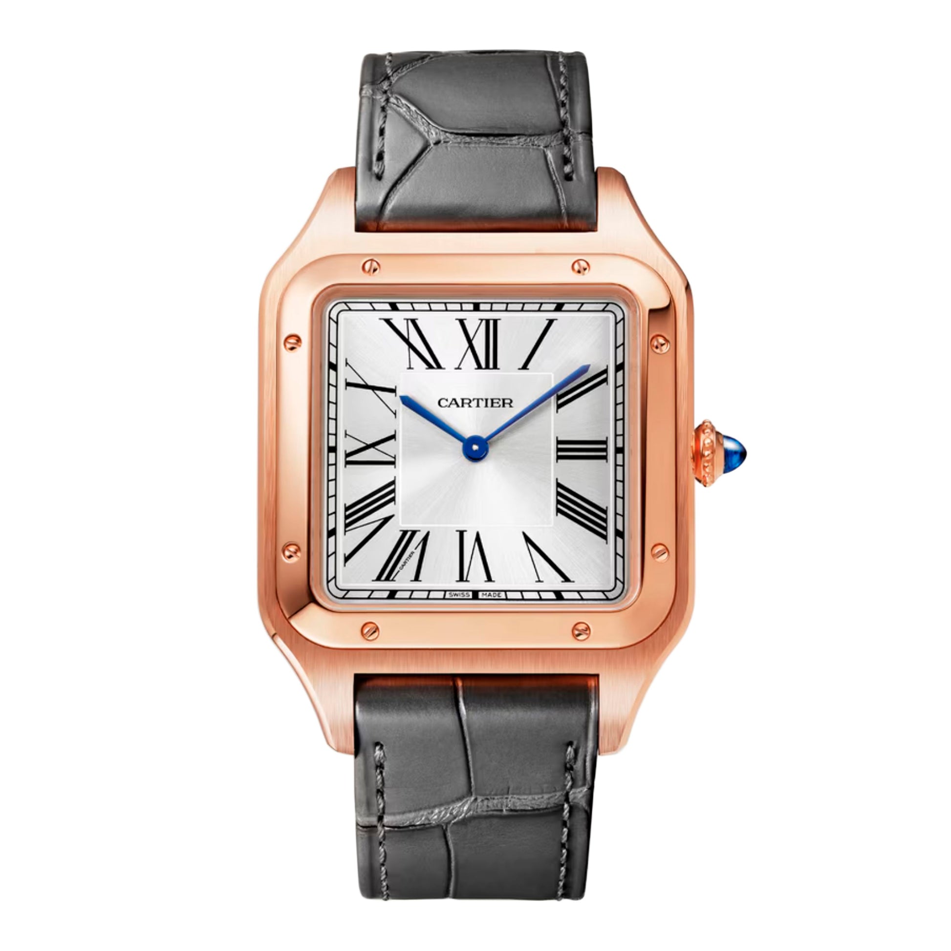 Cartier Santos Dumont XL WGSA0032 / 4307 Mens Watch. 33.9mm 18K rose gold case. 18K rose gold bezel. Silver dial with blue hands and black Roman numeral hour marker. Minute markers on the inner dial. Gray leather strap with 18K rose gold buckle. Will fit up to 7.5-Inch wrist. Sapphire crystal. 18K rose gold case back. Mechanical hand-winding movement. This watch comes with original Box and Papers.