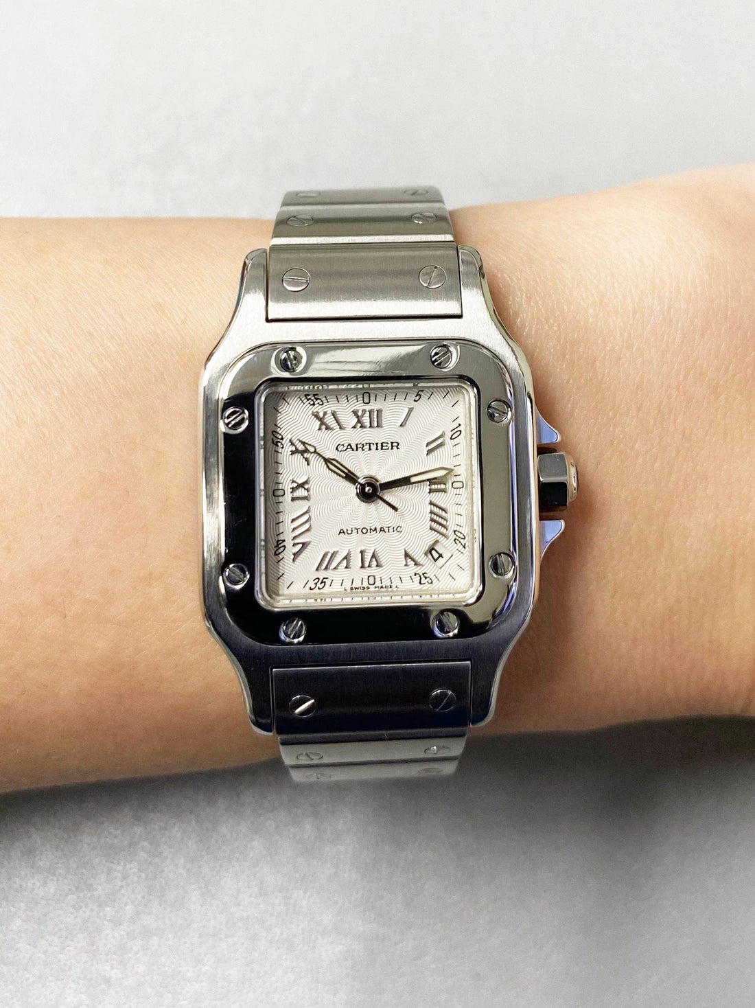 Cartier Santos Galbee W20044D6 / 2423 Ladies Watch. 24mm stainless steel case with stainless steel bezel. Textured Silver dial with silver luminous hands and Roman numeral hour marker. Minute marker on the outer dial. Date display between 4 & 5 o'clock position. Stainless steel bracelet with hidden butterfly clasp. Will fit up to 5-Inch wrist. Sapphire crystal. Stainless steel case back. Automatic self-winding movement.