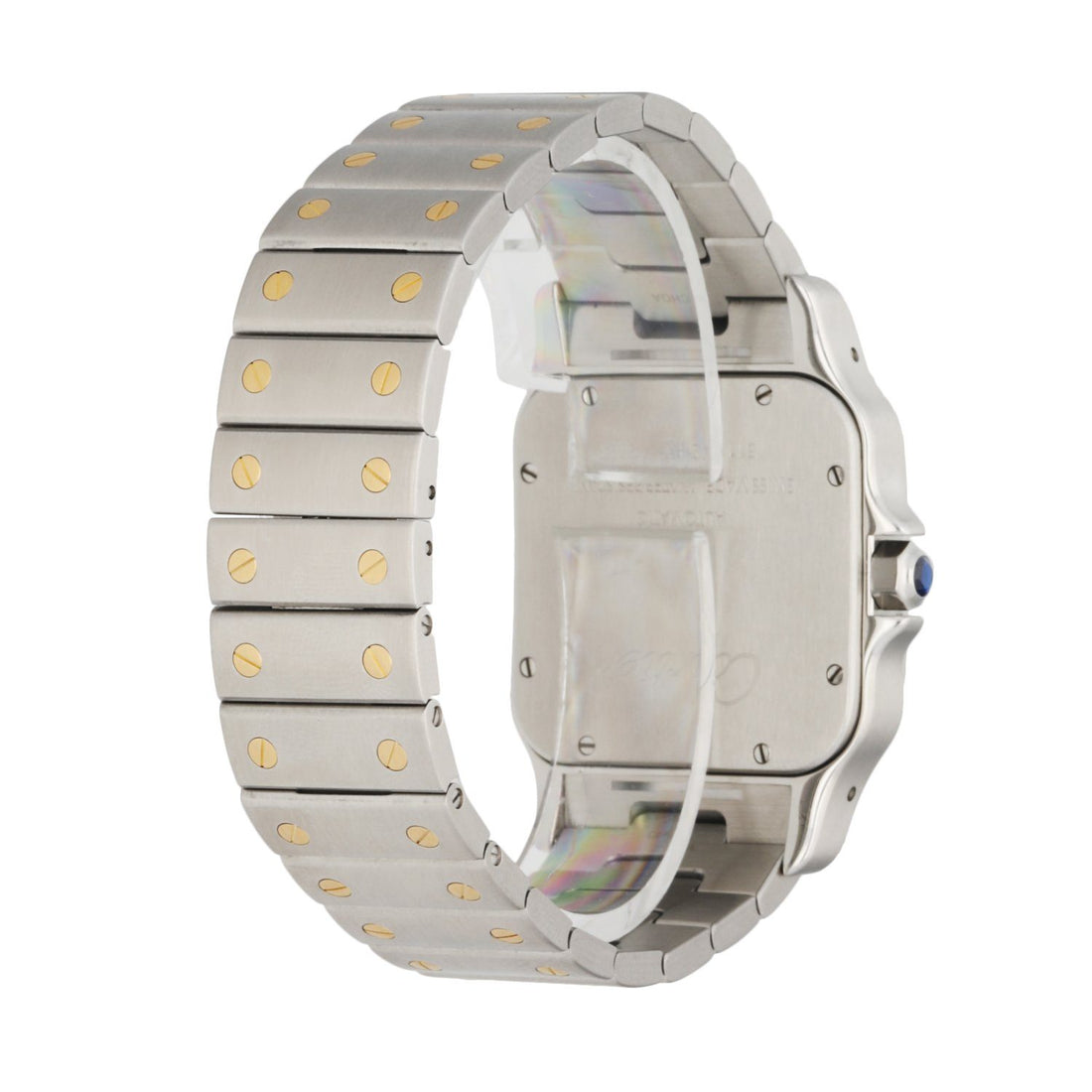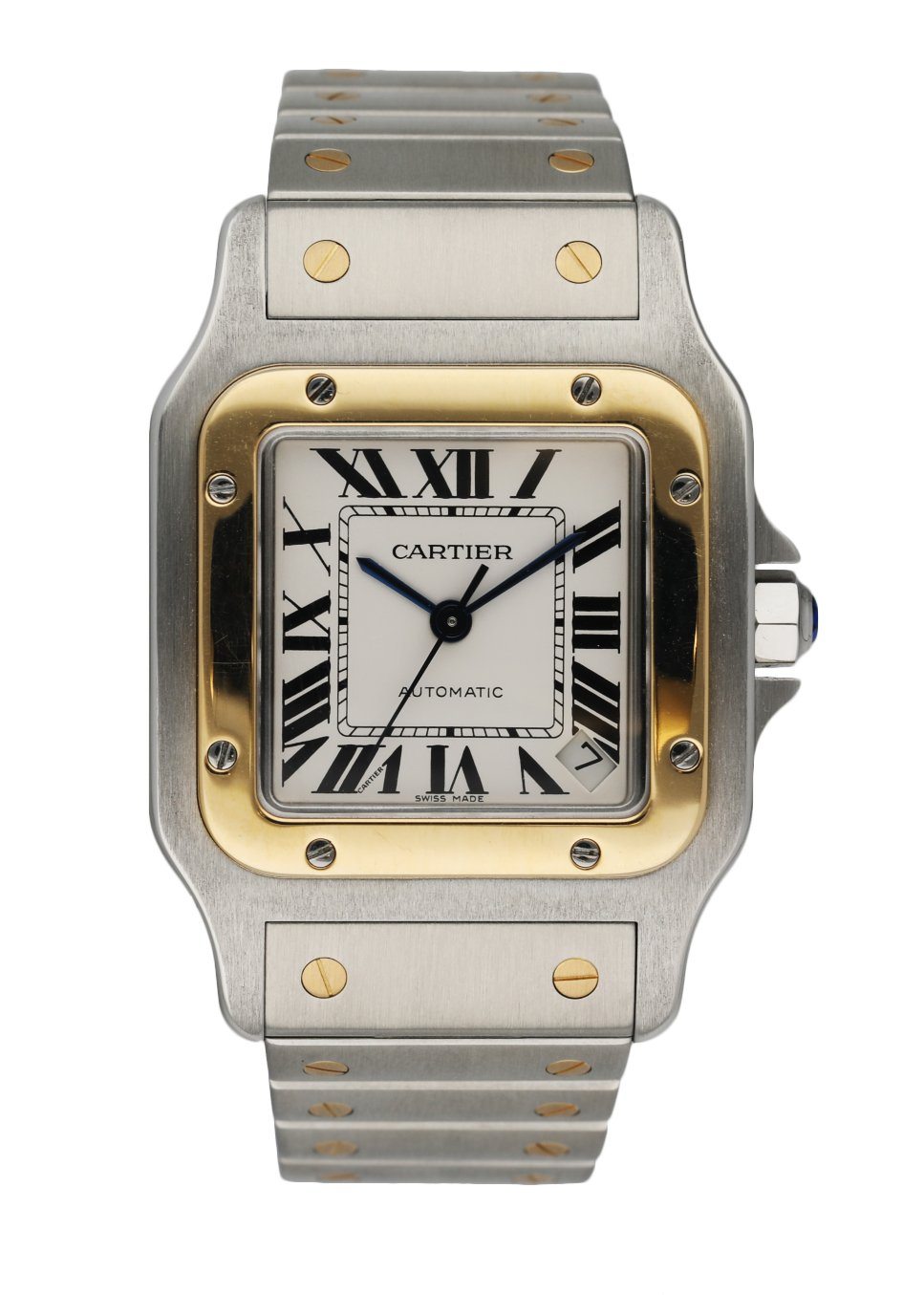 Cartier Santos Galbee 2823 men's watch. 32mm stainless steel case with 18k yellow gold bezel. White dial with blue hands and black Roman numeral markers. Date display between 4 & 5 o'clock. Stainless steel band with 18K yellow gold screws and a hidden butterfly clasp. Will fit up to a 6.75 inch wrist. Automatic movement. Sapphire crystal and stainless steel case back.