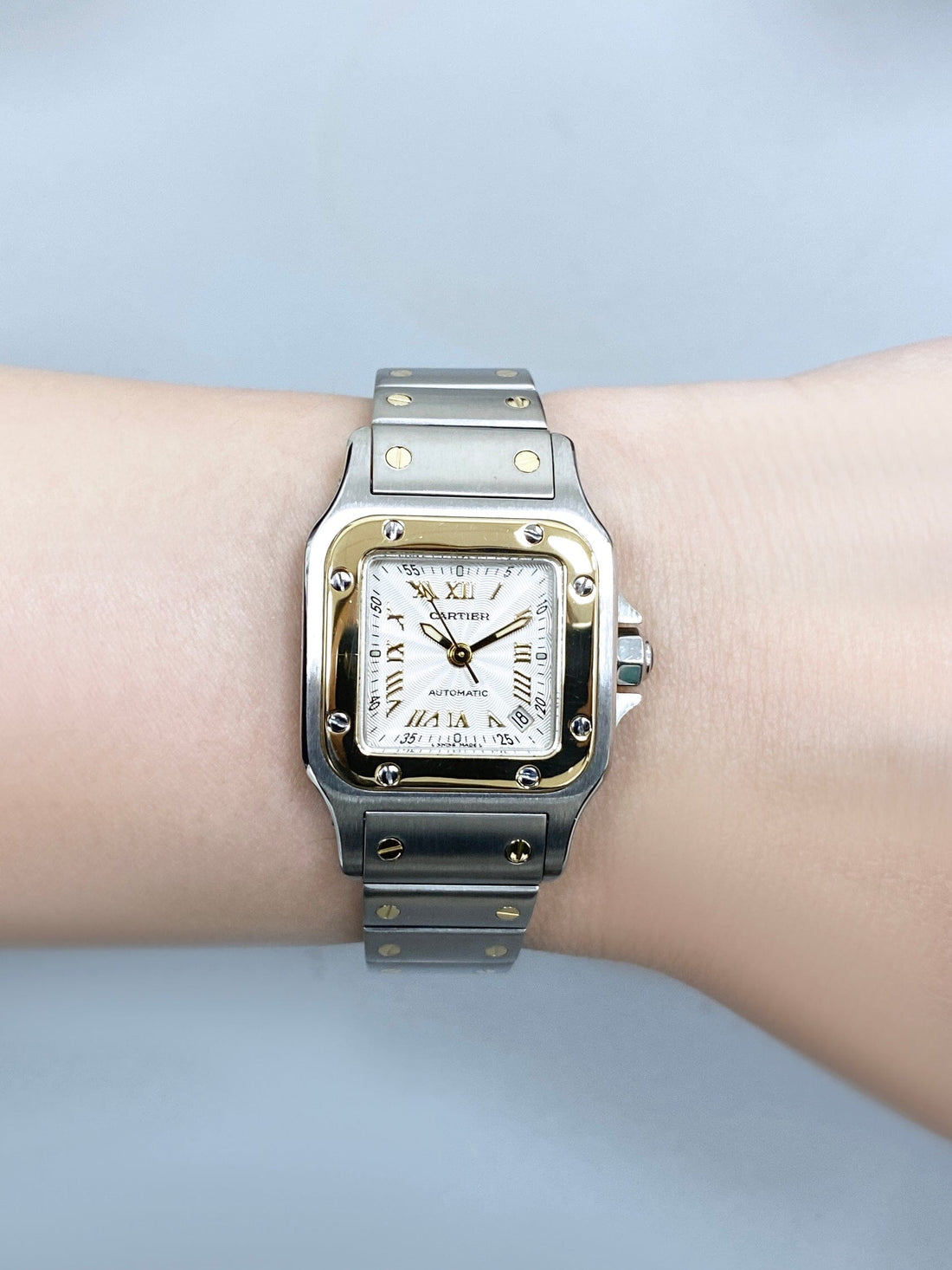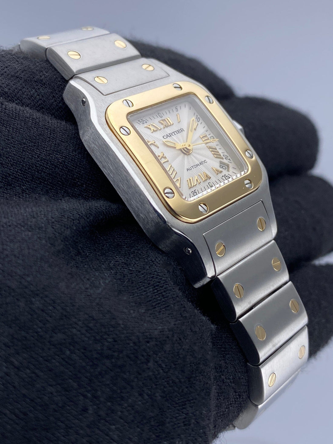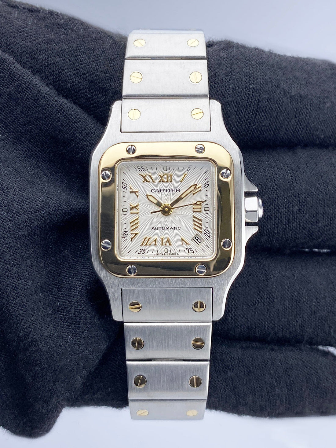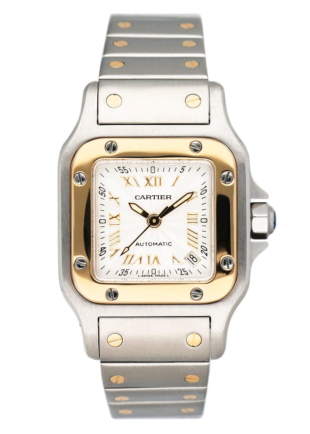 Cartier Santos Galbee W20045C4 / 2423 Ladies Watch. 24mm stainless steel case. 18K yellow gold bezel. Textured Silver dial with gold luminous hands and Roman numeral hour marker. Minute marker on the outer dial. Date display between 4 & 5 o'clock position. 18K yellow gold & stainless steel bracelet with hidden butterfly clasp. Will fit up to 6-Inch wrist. Sapphire crystal. Stainless steel case back. Automatic self-winding movement.
