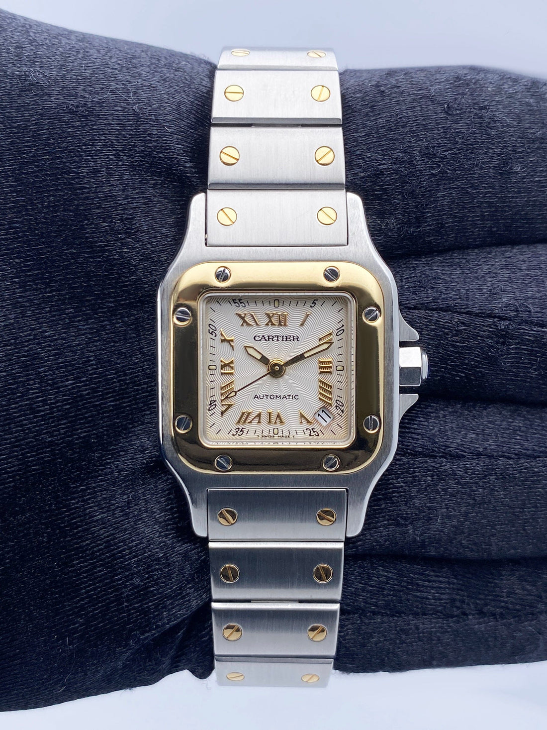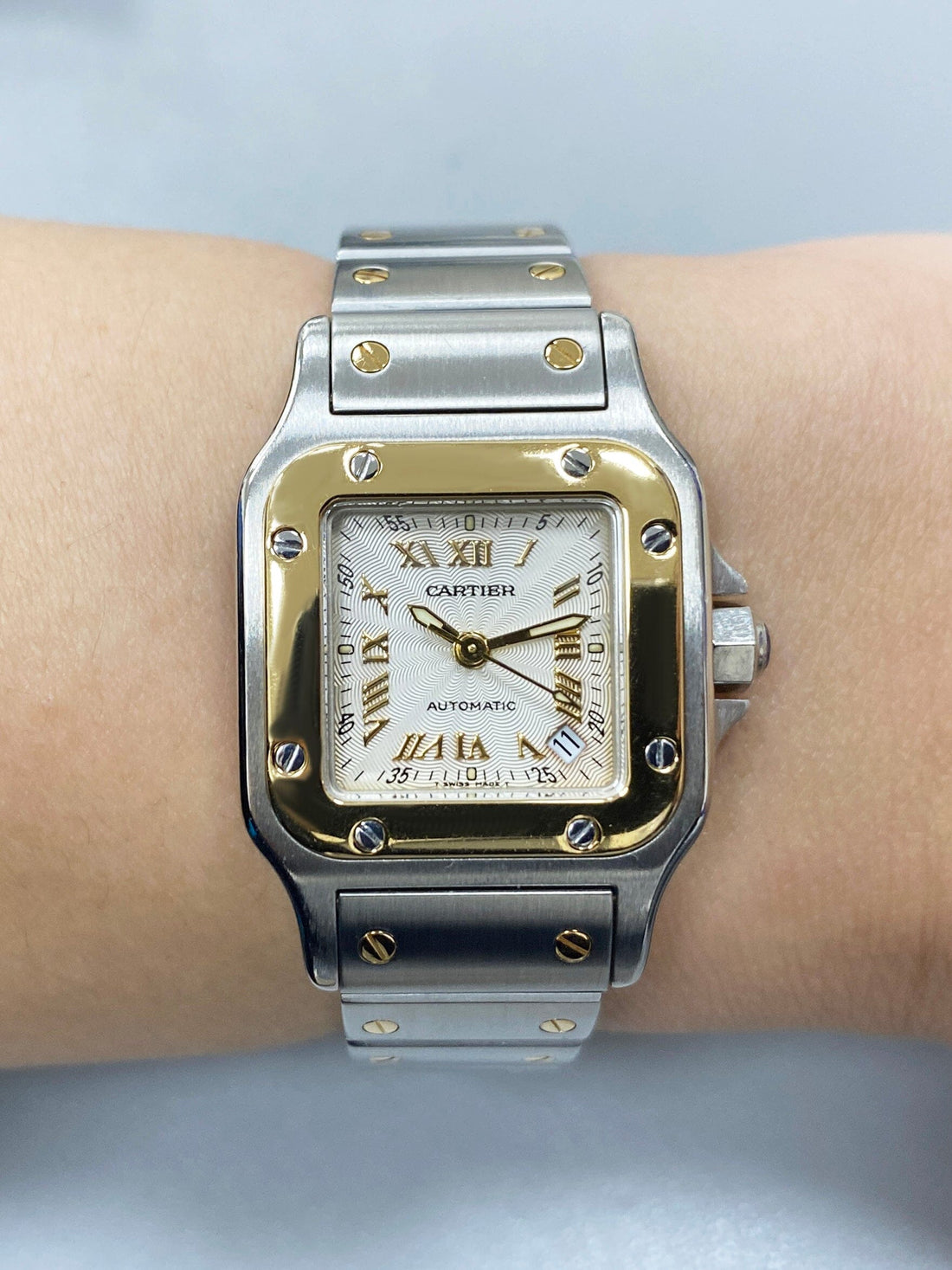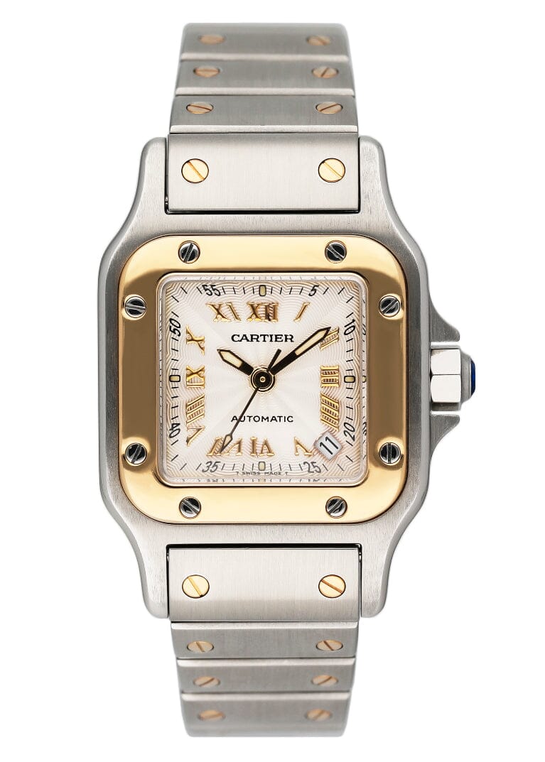 Cartier Santos Galbee W20045C4 / 2423 Ladies Watch. 24mm stainless steel case. 18K yellow gold bezel. Textured Silver dial with gold luminous hands and Roman numeral hour marker. Minute marker on the outer dial. Date display between 4 & 5 o'clock position. 18K yellow gold & stainless steel bracelet with hidden butterfly clasp. Will fit up to 6-Inch wrist. Sapphire crystal. Stainless steel case back. Automatic self-winding movement. This watch comes with original Box and Papers.