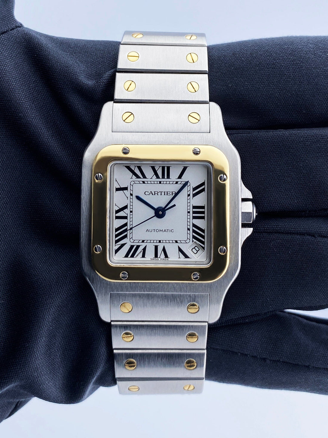 Cartier Santos Galbee 2823 Mens Watch. 32mm stainless steel case. 18K yellow gold bezel. White dial with blue steel hands Black Roman numeral hour markers. Minute markers around an inner dial. Date display between 4 and 5 o'clock position. 18K yellow gold & stainless steel bracelet with hidden butterfly clasp. Will fit up to a 6.75-inch wrist. Sapphire crystal. Stainless steel case back. Automatic self-winding movement.