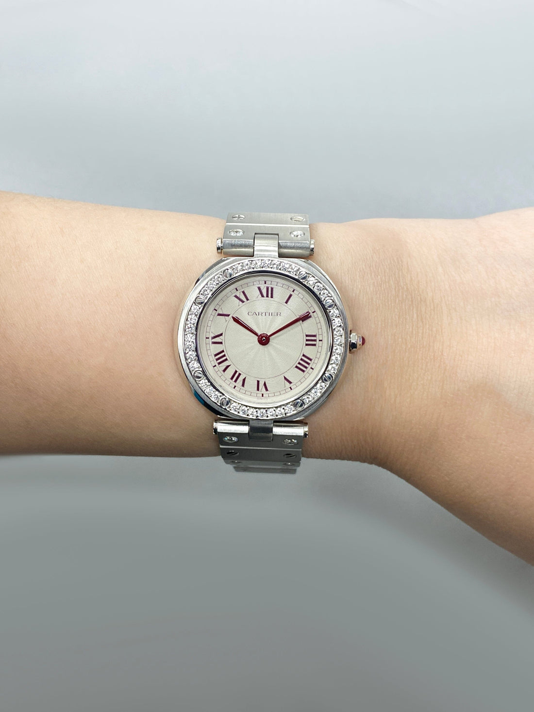 Cartier Santos Vendôme Original Red Dial Ladies Watch. 32mm platinum case. Platinum bezel with factory diamond sets. Silver dial with red hands and red Roman numeral hour markers. Minute markers on the outer dial. Platinum bracelet with fold over clasp. Will fit up to a 7-inch wrist. Sapphire crystal. Platinum case back. Quartz: Battery powered movement.