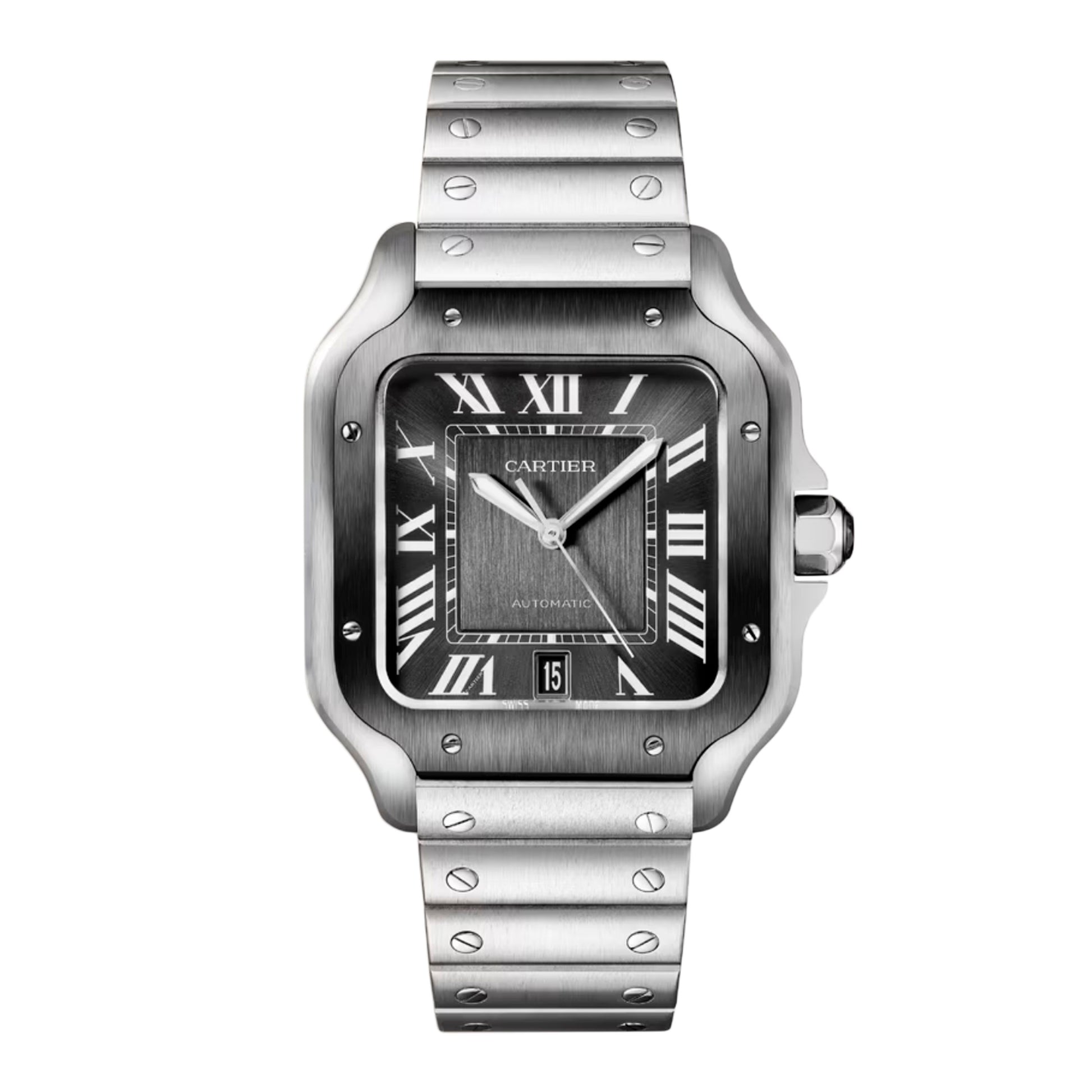 Cartier Santos WSSA0037 Mens Watch. 39.80mm stainless steel case. adlc bezel. Grey dial and roman numeral hour markers. Date Indicator. bracelet with stainless steel hidden butterfly clasp. Will fit up to 7.00-inch wrist. Sapphire crystal. Stainless steel case back. Automatic movement. Original Box & Papers.