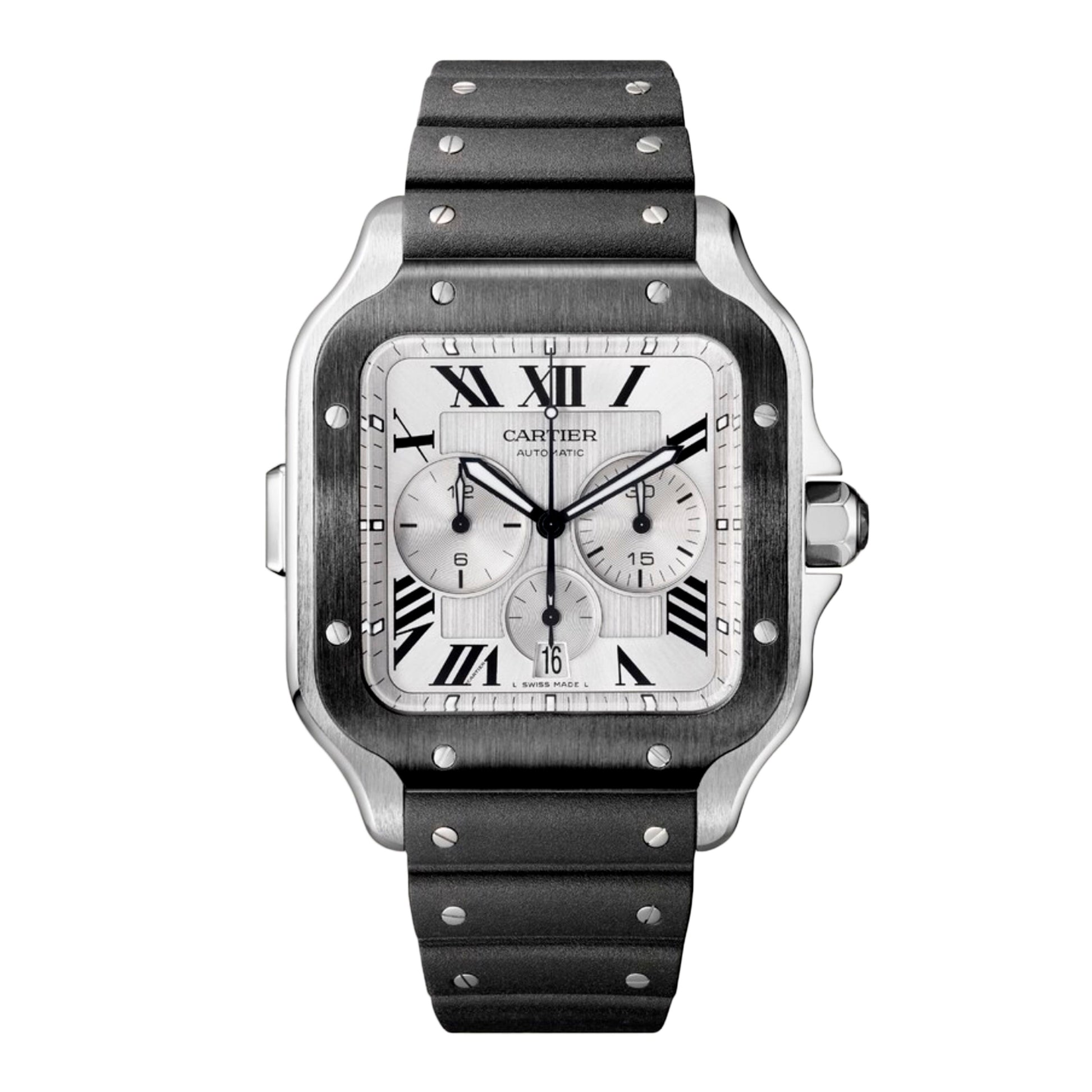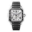 Cartier Santos XL WSSA0017 / 4183 Mens Watch. 43.3mm stainless steel case. ADLC fixed bezel. Silver dial with black steel luminous hands and black Roman numeral hour markers. Three sub-dials. Small seconds hand at 6 o'clock. 30-minute counter at 3 o'clock. 12-hour counter at 9 o'clock. The day displayed at 6 o'clock position Minute markers on the outer dial. Will fit up to a 7-inch wrist. Black rubber strap with deployment buckle. Sapphire crystal. Stainless steel case back. Automatic self-winding movement. This watch comes with original Box and Papers.