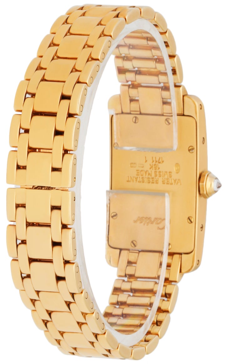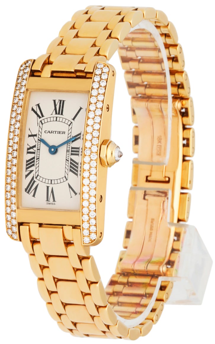Cartier Tank Americaine 1710 Ladies Watch. 19mm 18K yellow gold case. 18K yellow gold bezel with factory diamond set. Off-white dial with blue hands and black Roman numeral hour marker. 18K Yellow gold bracelet with hidden butterfly clasp. Will fit up to 6-Inch wrist. Sapphire crystal and 18K yellow gold case back . Quartz battery powered movement.