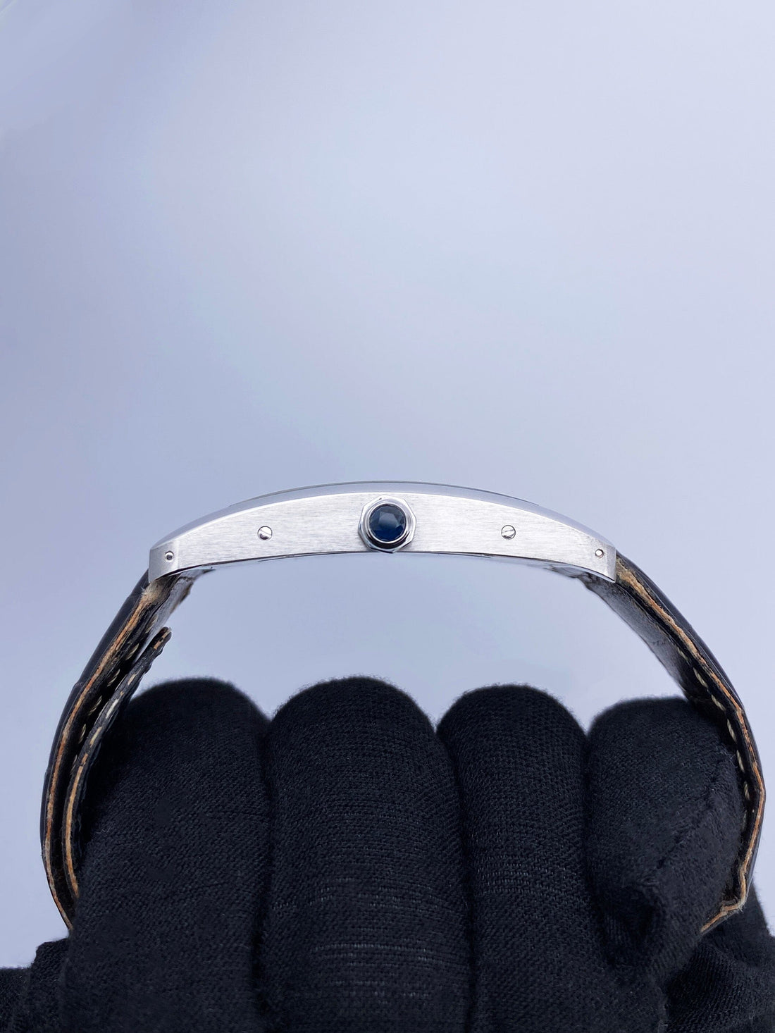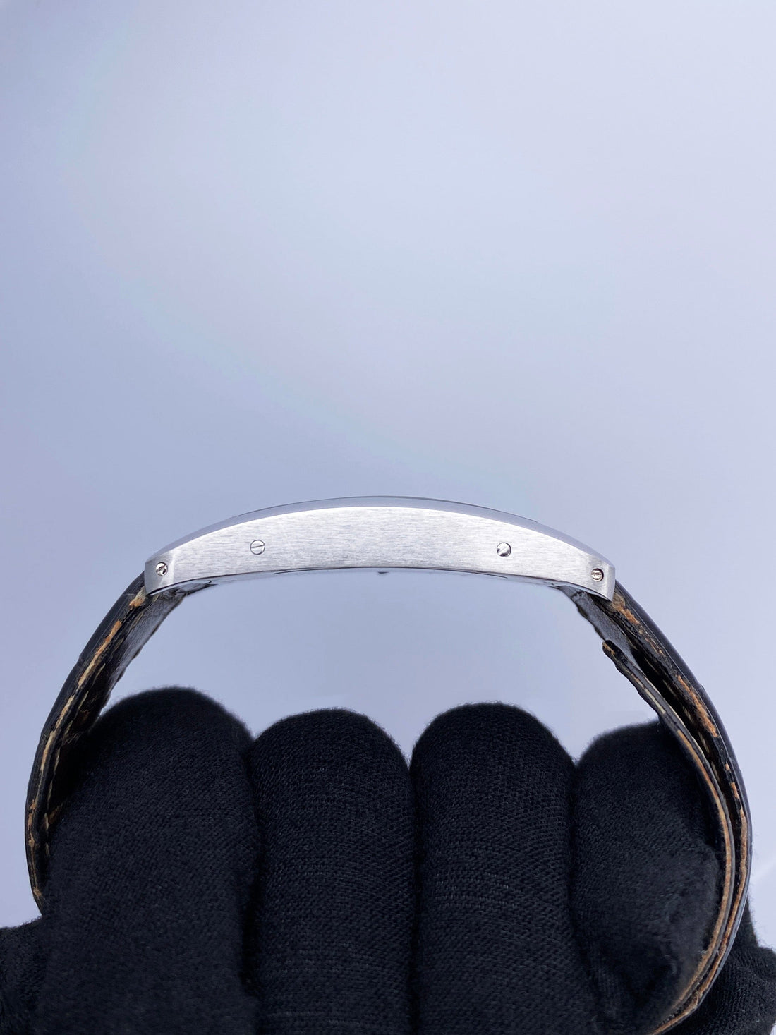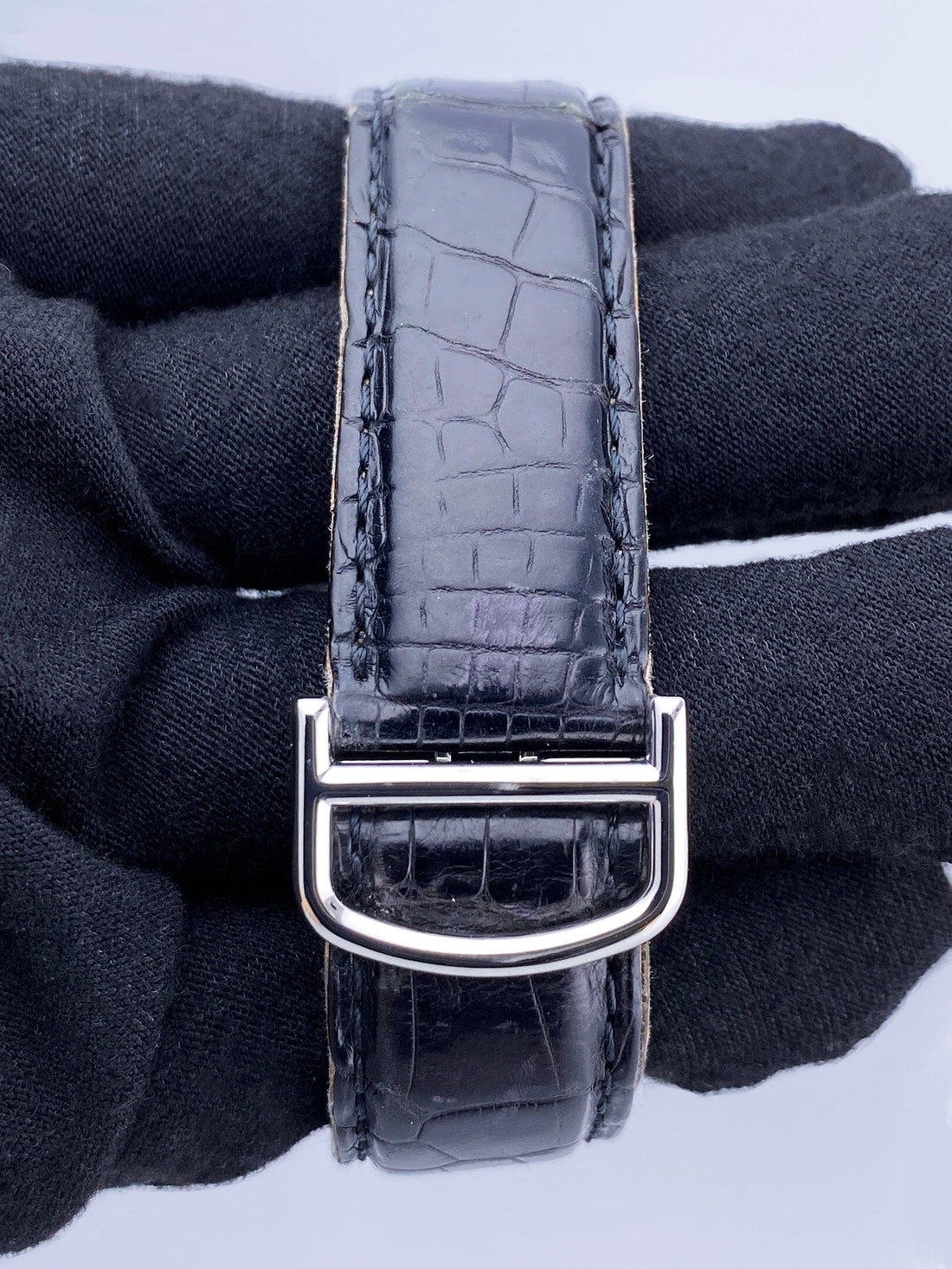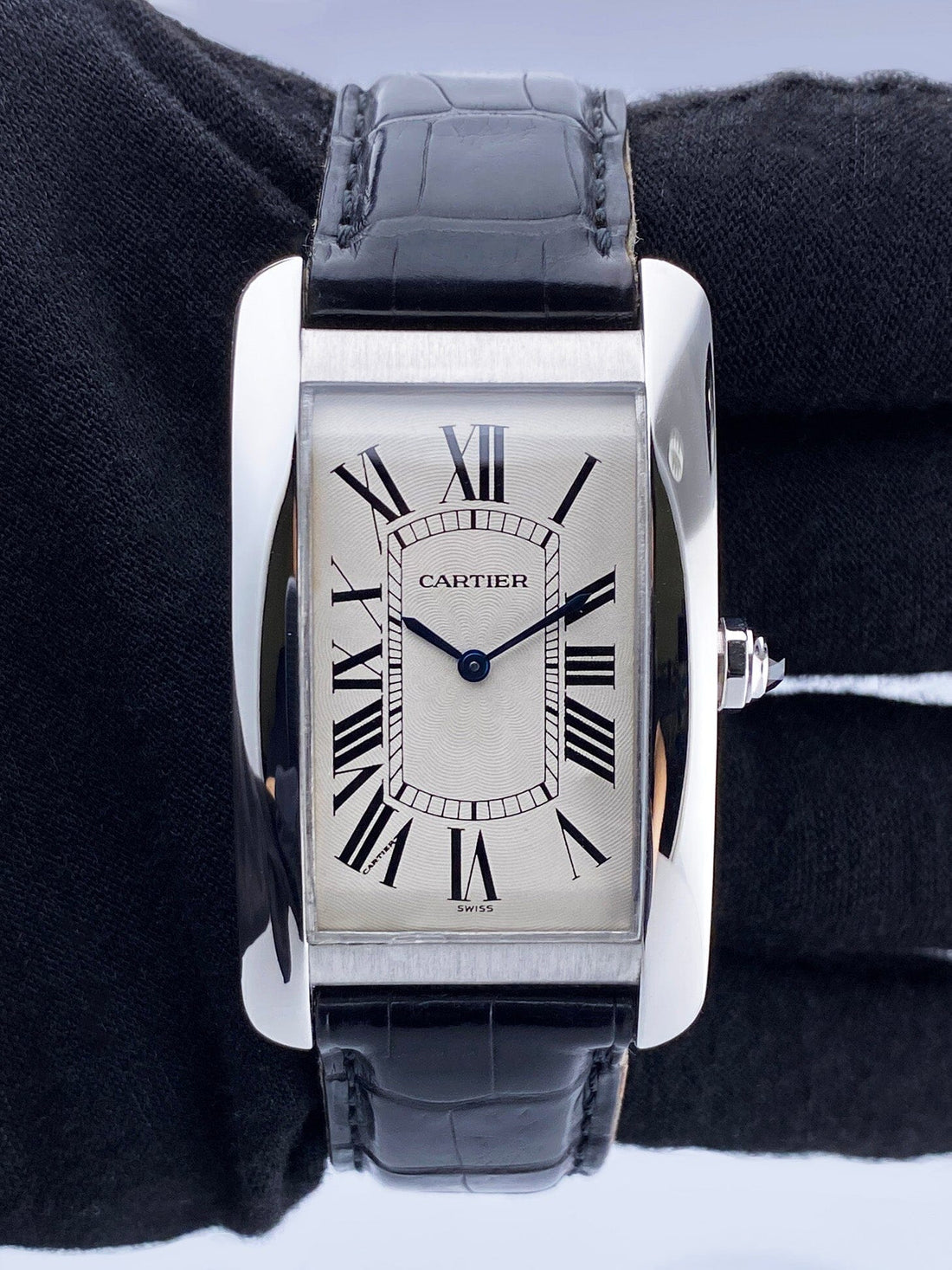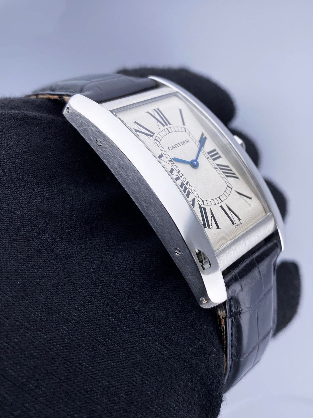 Cartier Tank Americaine Large W2601651 / 1734 Mens Watch. 27mm platinum case. Off-white dial with blue hands and black Roman numerals hour marker. Minute marker in the inner dial. Black leather strap with 18K white gold deployment buckle. Will fit up to a 7.5-inch wrist. Sapphire crystal. Platinum case back. Mechanical hand-winding movement.