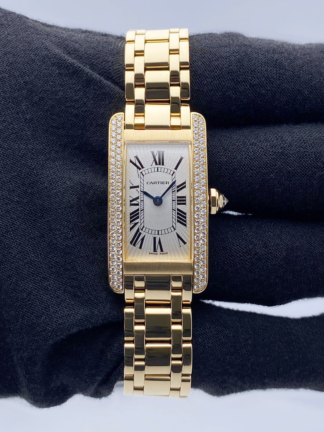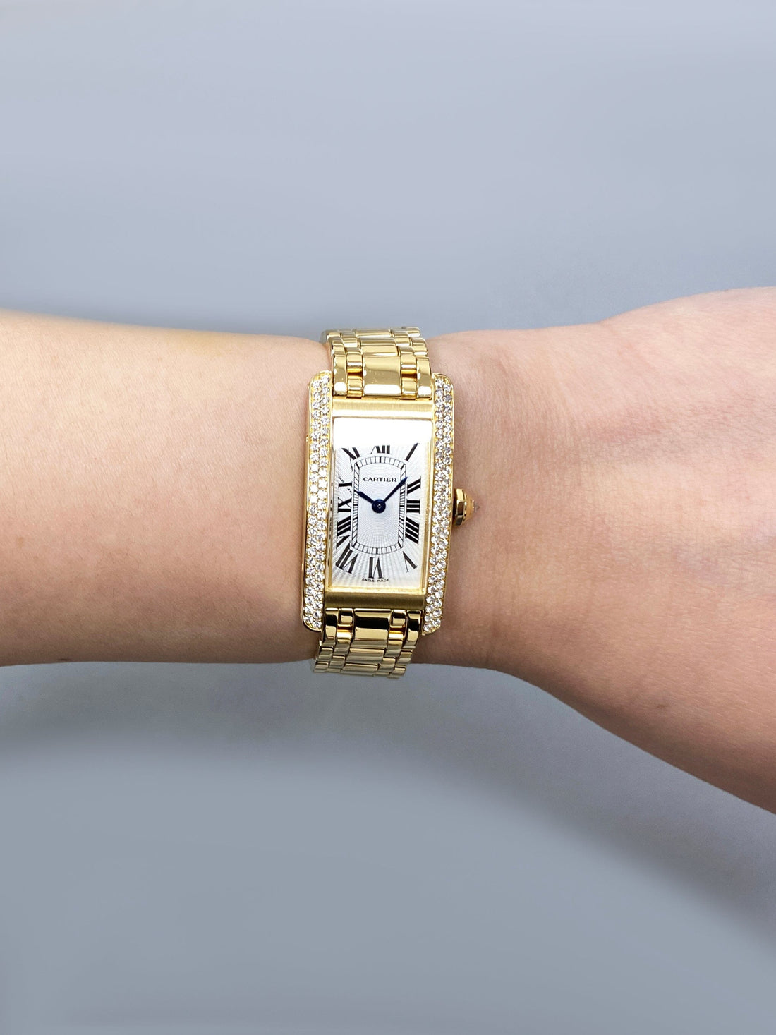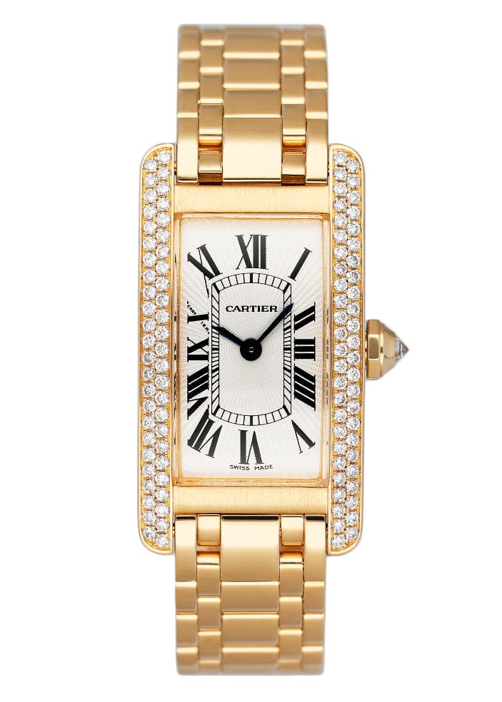 Cartier Tank Americaine WB7012K2 / 2482 Ladies Watch. 19mm 18K yellow gold case with factory diamond set. Silver dial with blue hands and black Roman numeral hour marker. 18K Yellow gold bracelet with 18K rose gold hidden butterfly clasp. Will fit up to 6.25-Inch wrist. Sapphire crystal. 18K yellow gold case back. Quartz: Battery powered movement.
